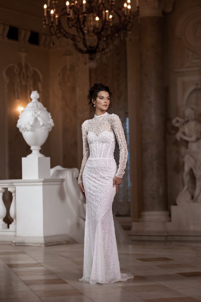 Свадебные платья сшиты из материалов, создающих эффект мерцания. В коллекции наряды из глянцевых материалов, из воздушных тканей с блестками, глиттером, стразами, с вкраплением жемчужного бисера или украшенных паетками.