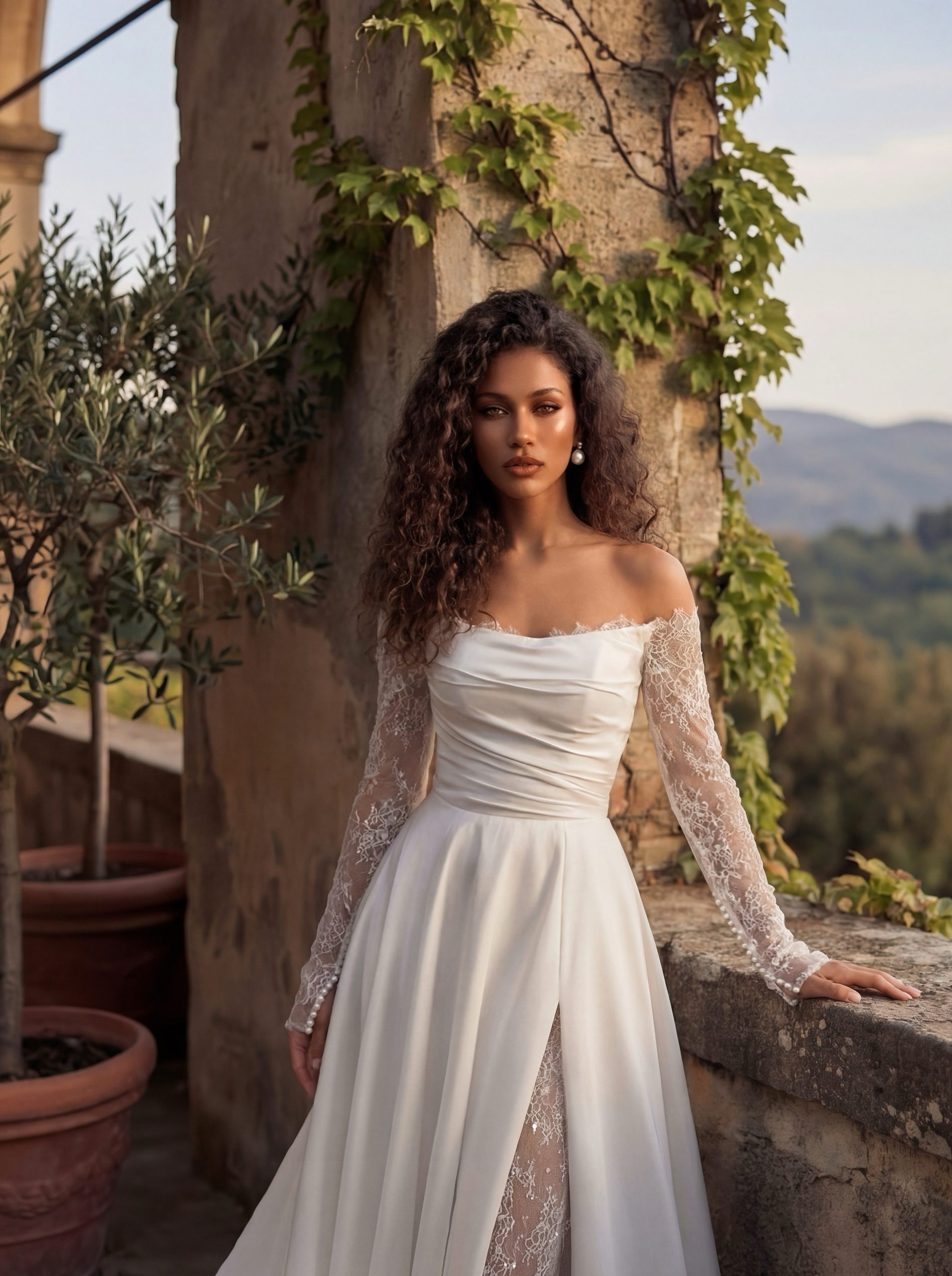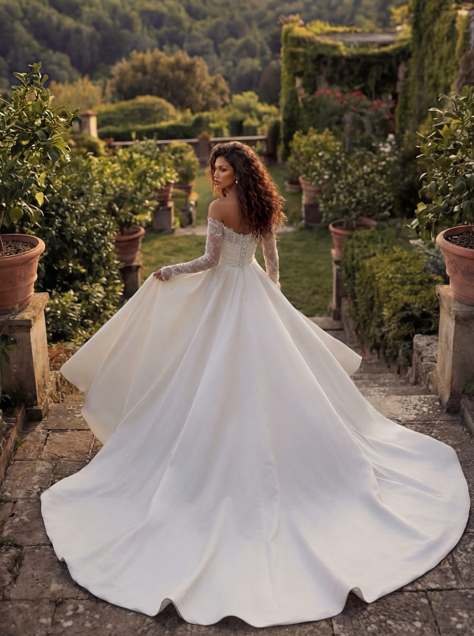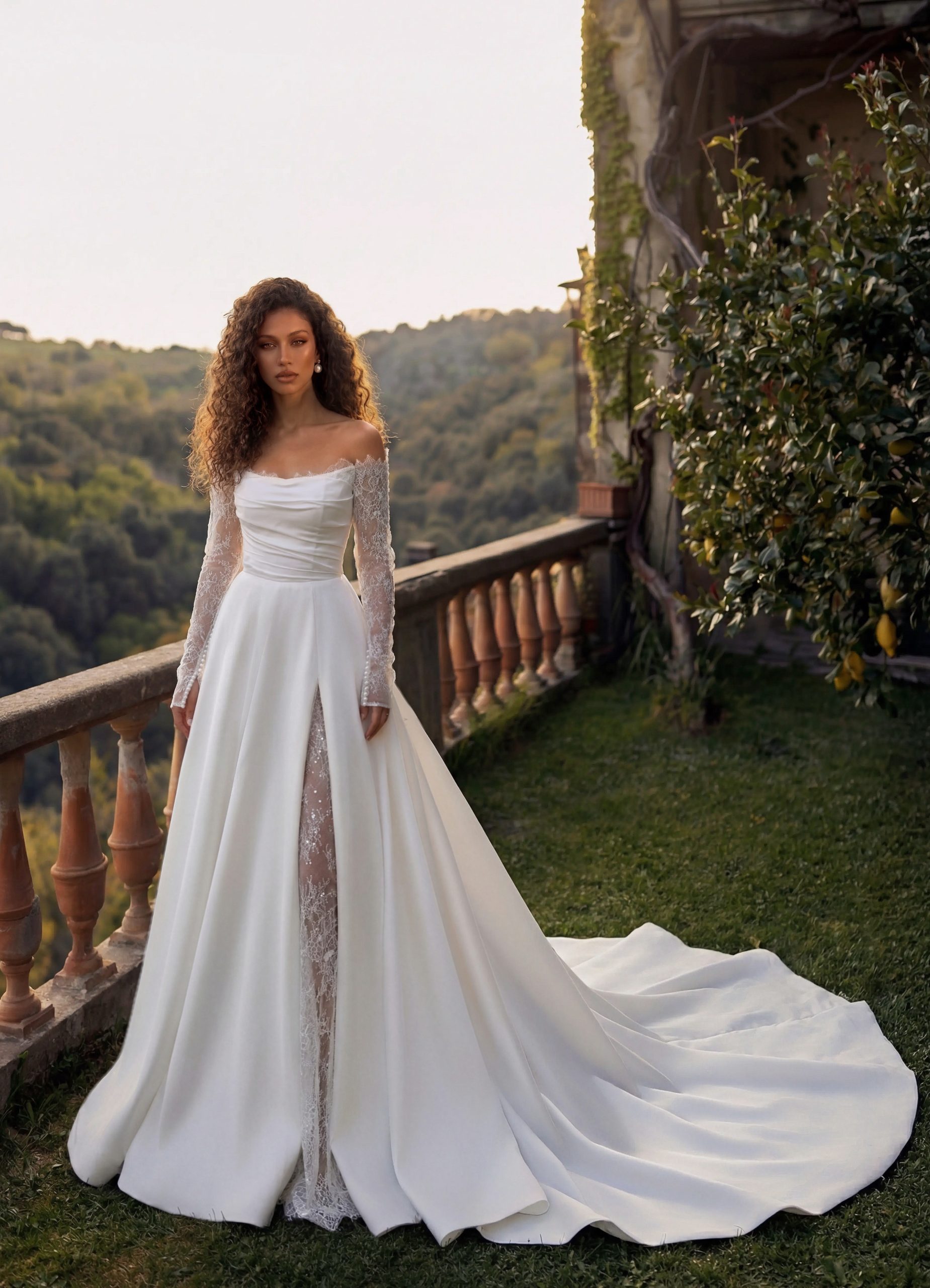 Романтика с характером и нежность с внутренней силой. Мягко драпированный корсет подчёркивает линию плеч и аккуратно формирует талию, создавая изящный и вытянутый силуэт. Полупрозрачные кружевные рукава добавляют образу лёгкости, а тонкая кружевная вставка в разрезе придаёт глубину и едва уловимую чувственность. Объёмная юбка раскрывается плавно и величественно, переходя в длинный шлейф, который красиво ложится в движении.