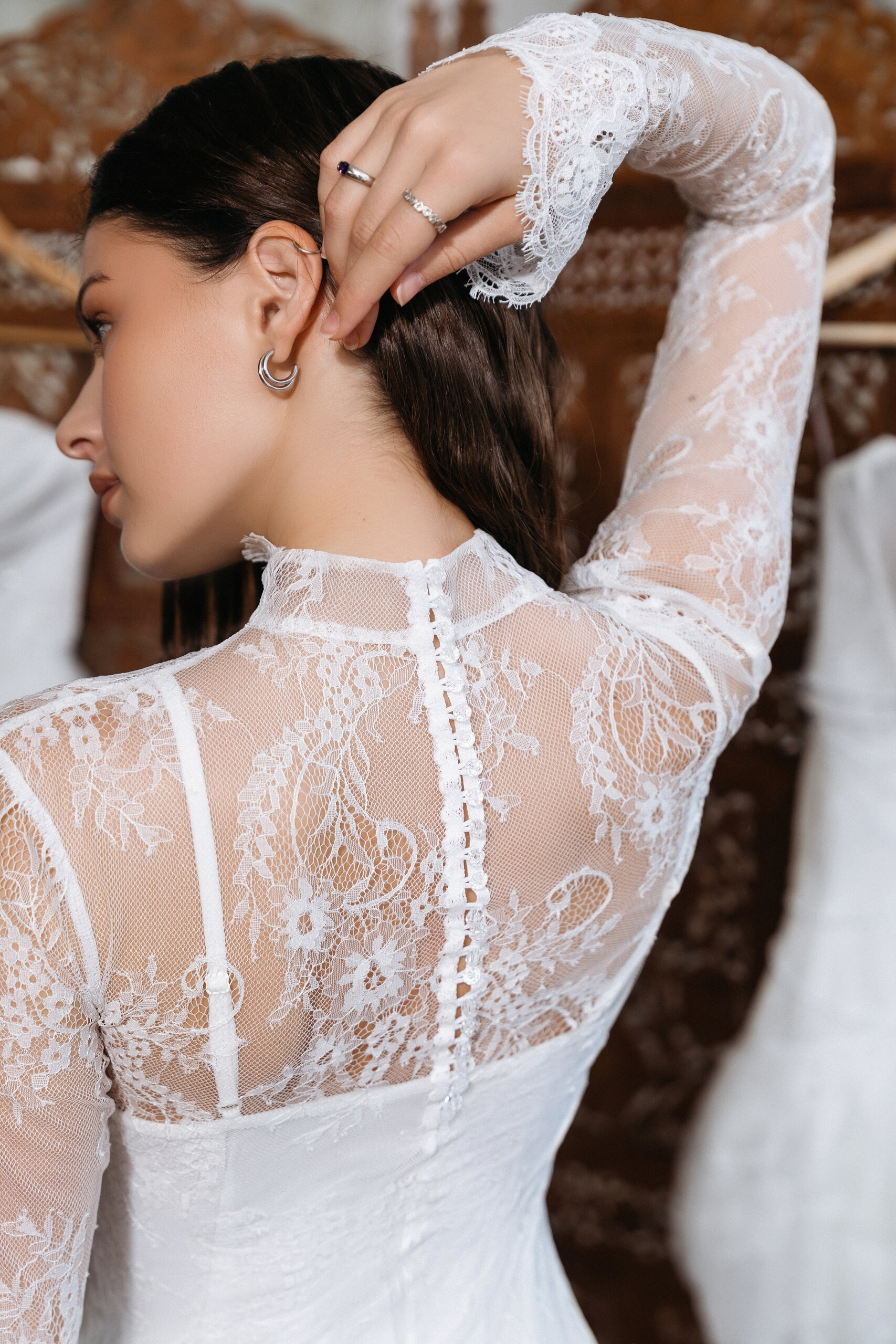 Смелый и очень стильный образ для современной невесты. Прозрачное кружево создаёт эффект второй кожи, подчёркивая силуэт легко и деликатно, а асимметричная драпировка из гладкой ткани добавляет архитектурности и модного акцента. Контраст фактур — нежного кружева и чистых линий — делает образ выразительным, но не перегруженным.