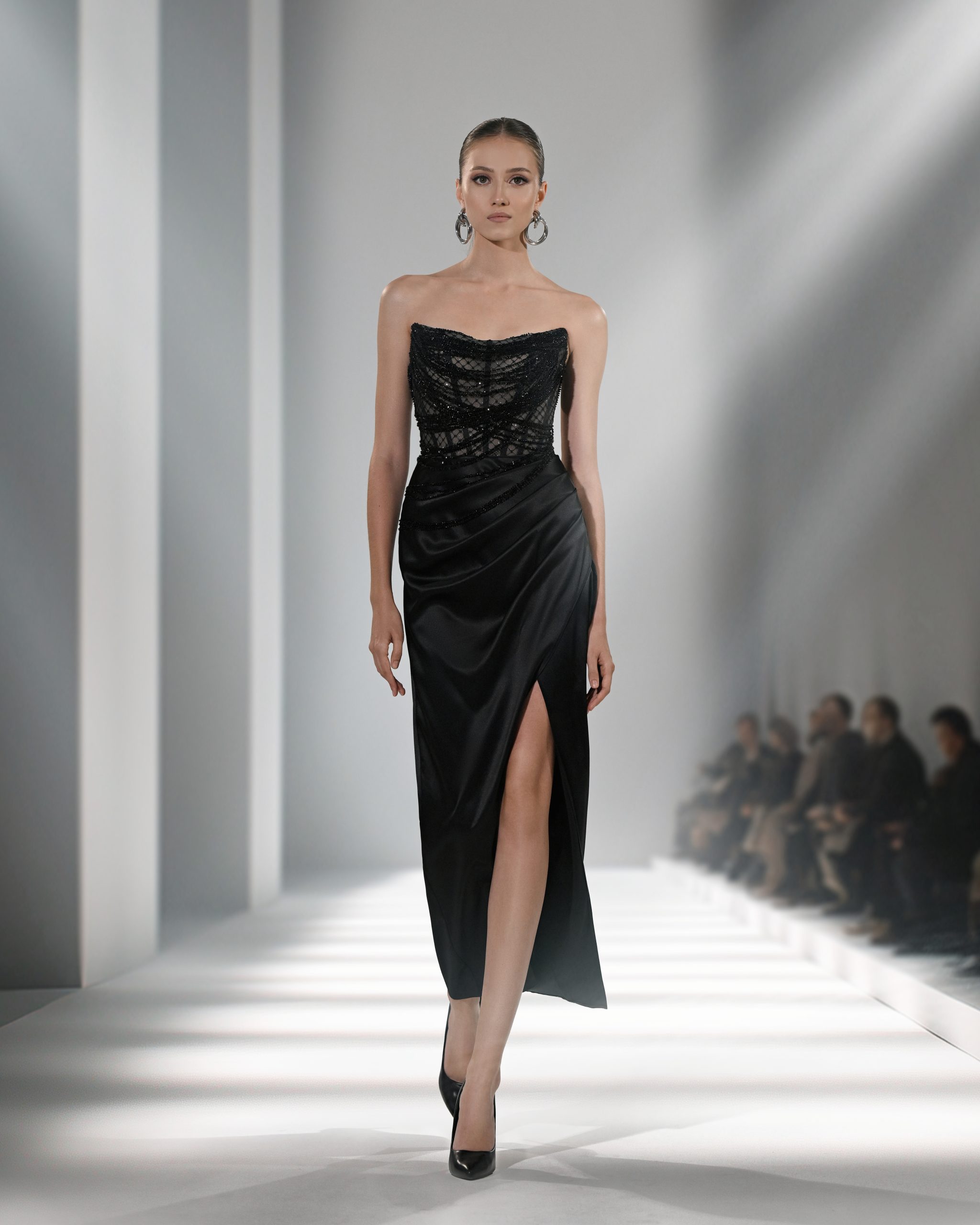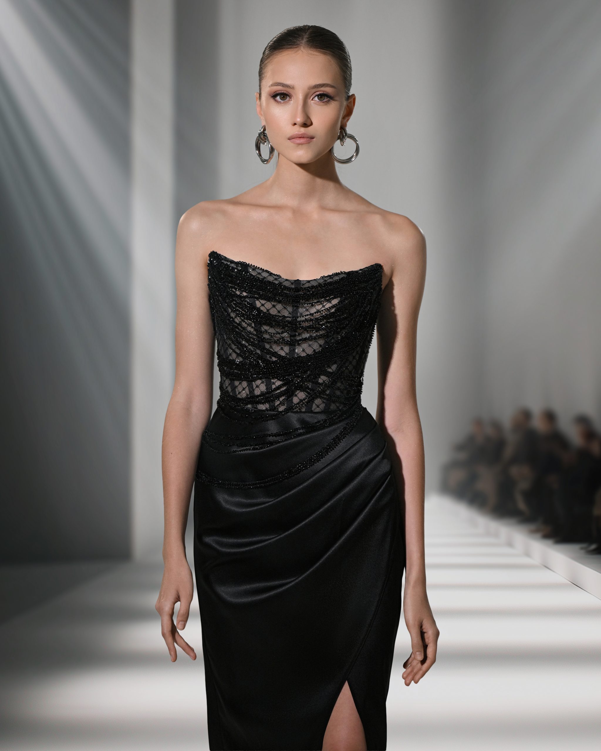 Платье, которое притягивает взгляды с первого шага. Черный атлас струится по фигуре, подчёркивая линии силуэта, а корсет с ручной вышивкой и шнуровкой на спине добавляет драматичности и утончённости.