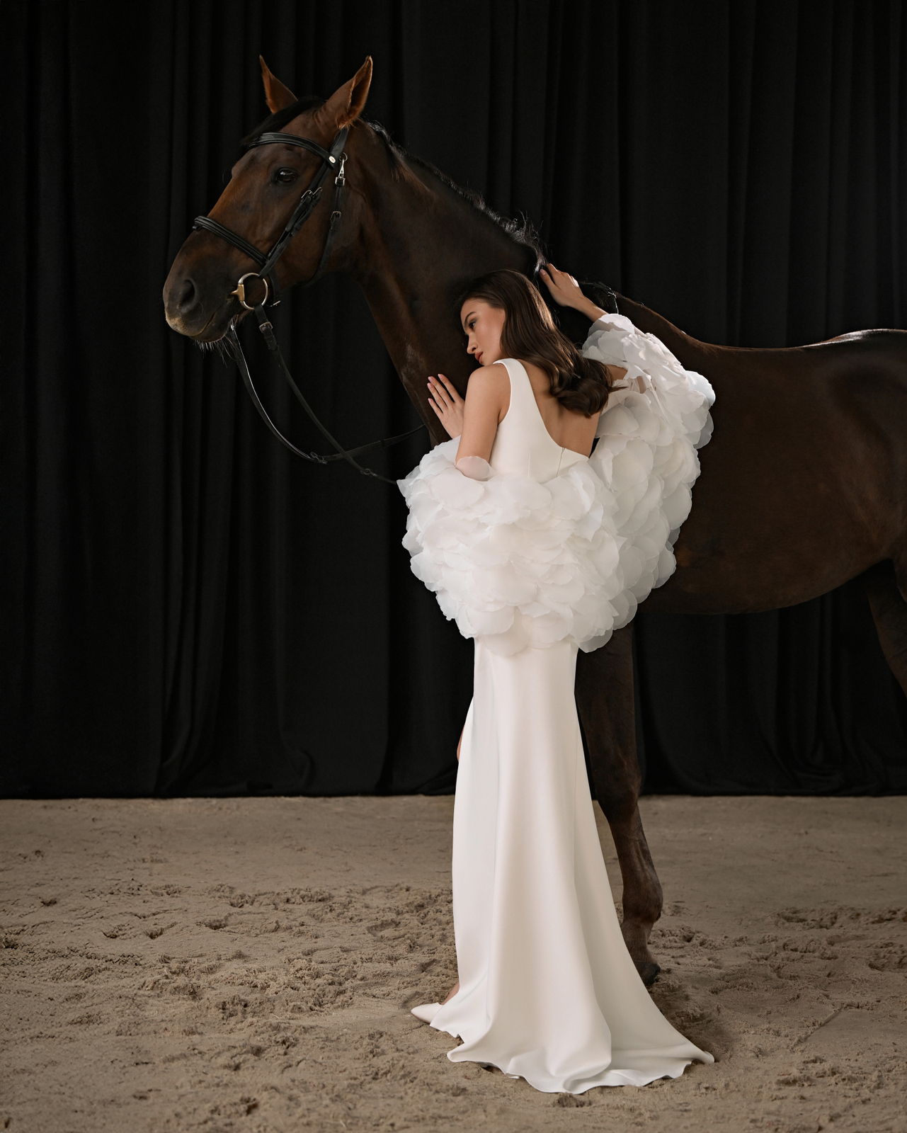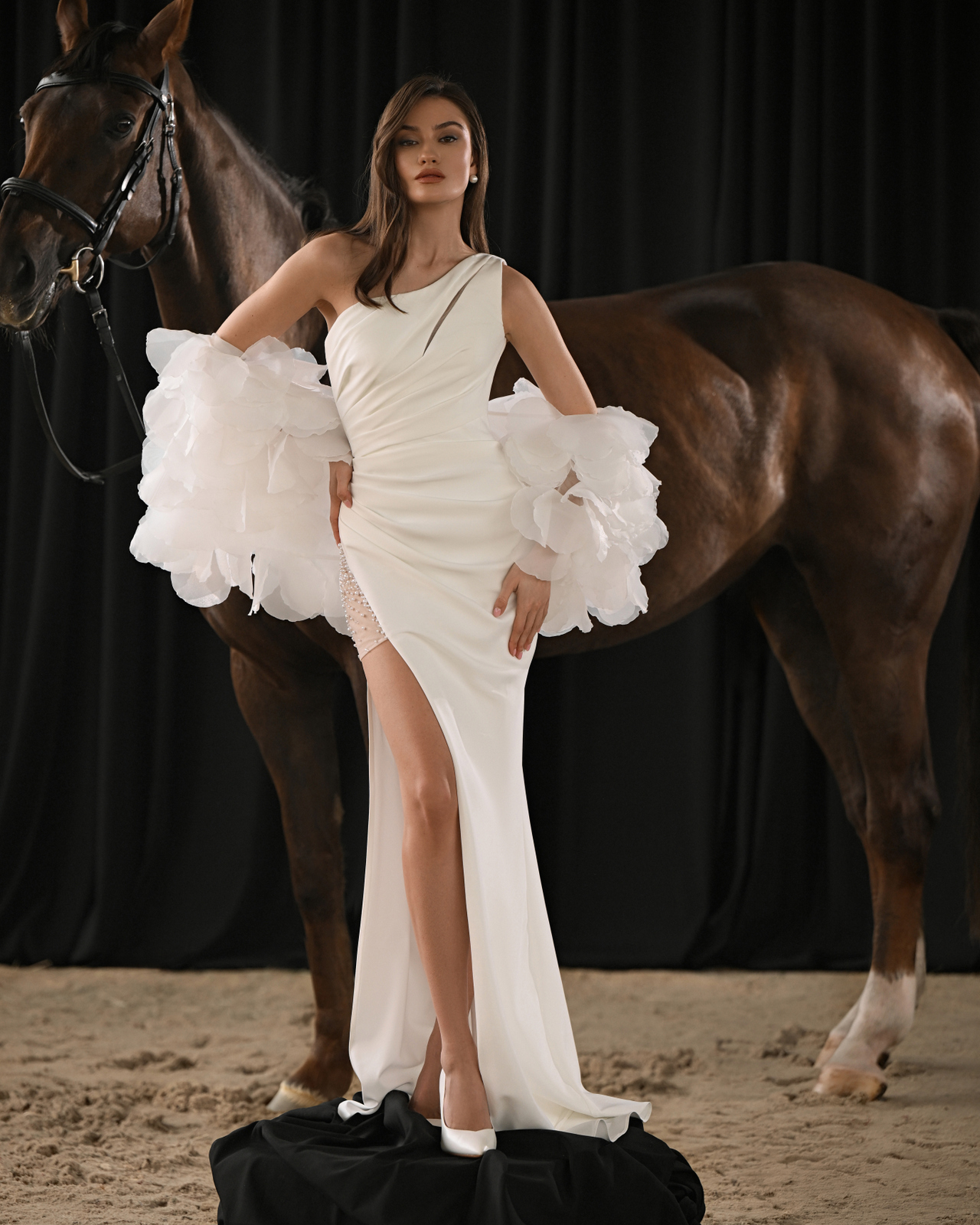 Акцент, который меняет всё. Объёмное болеро из воздушных лепестков превращает лаконичное платье в модный манифест — смелый, чувственный, запоминающийся.