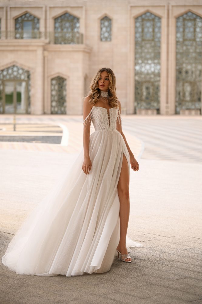 Короткая длина подчёркивает ноги, рассыпчатая бахрома ловит каждый шаг, а сердцевидный корсет делает образ игривым, но по-настоящему праздничным.