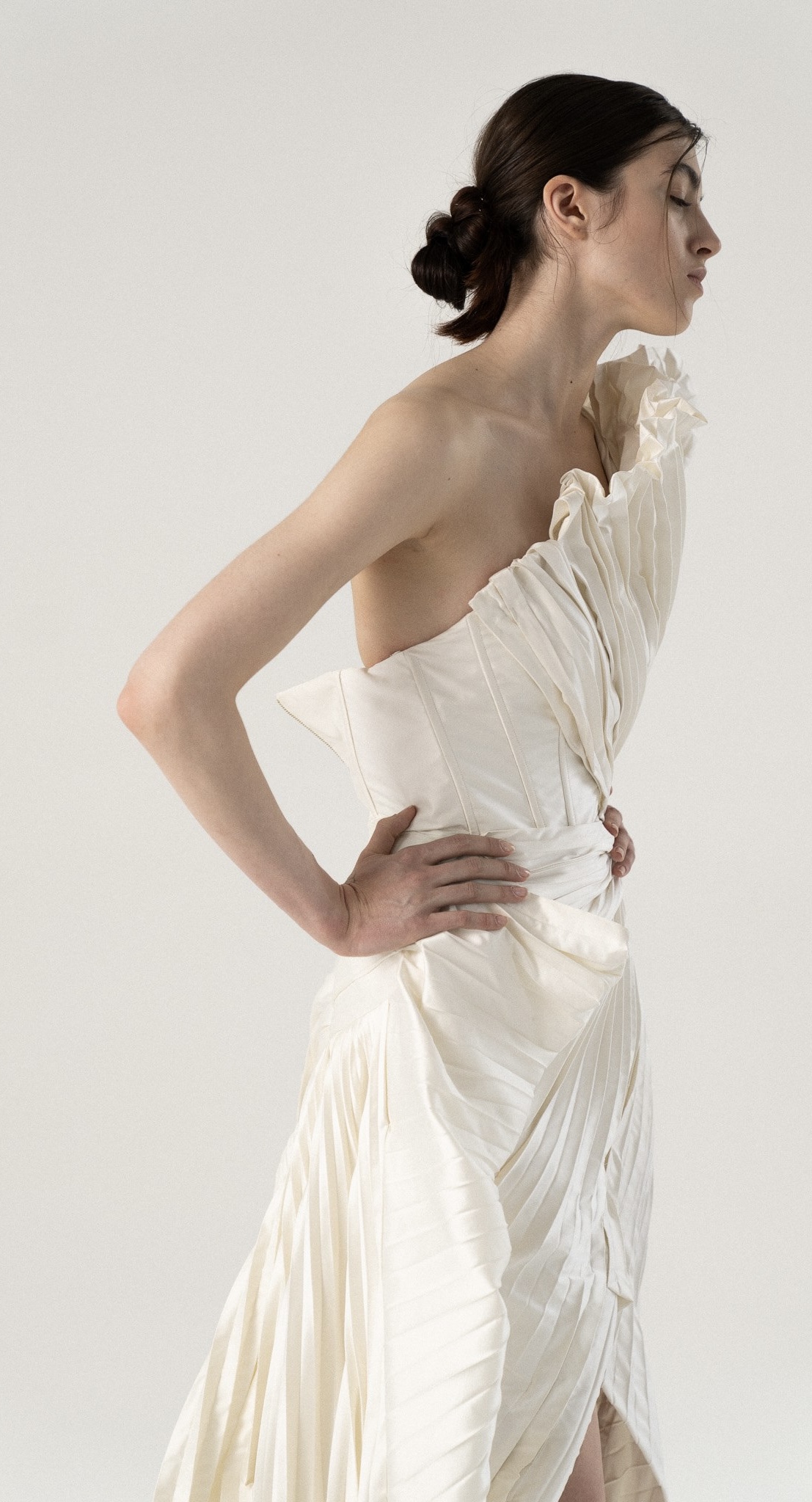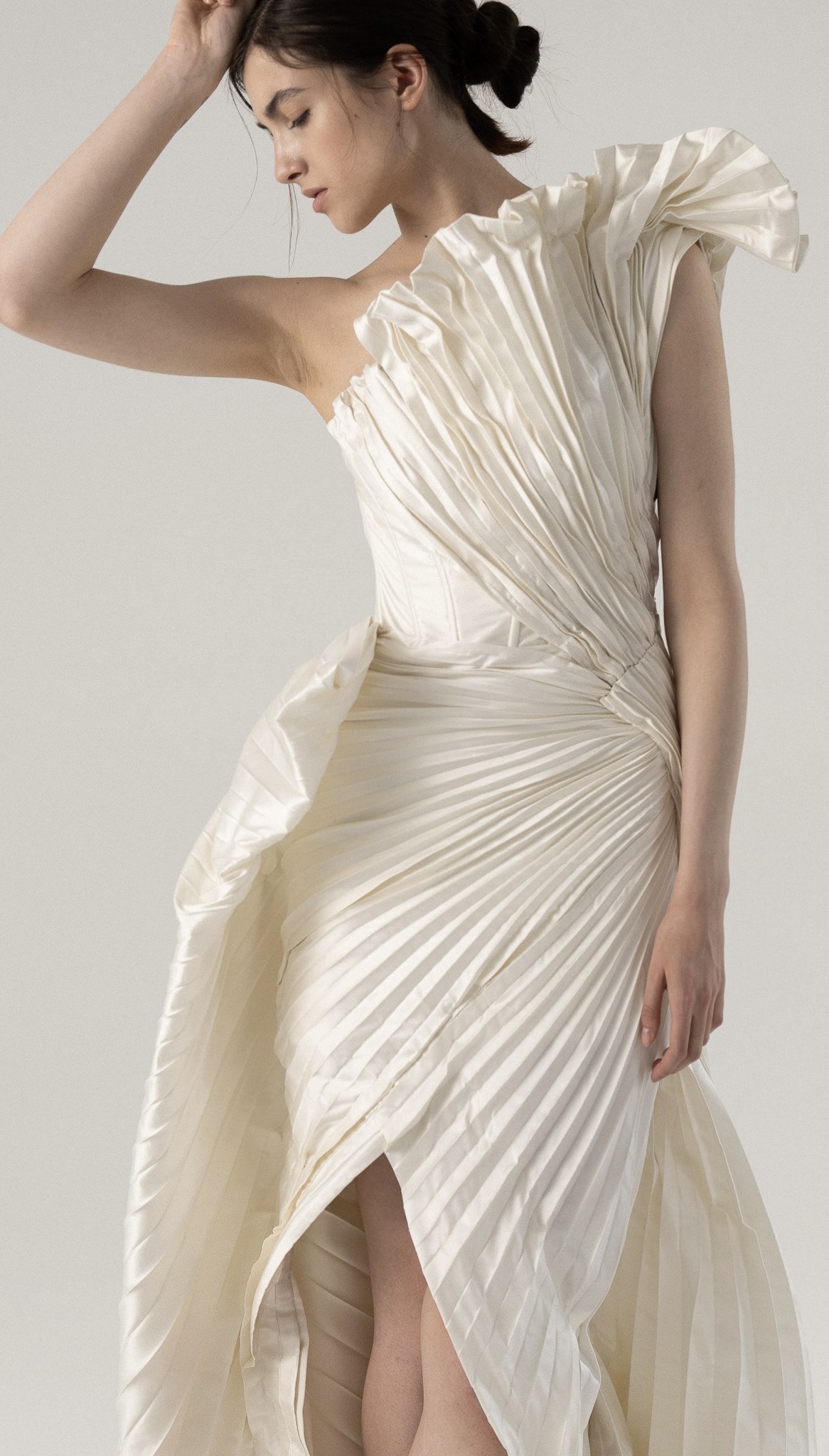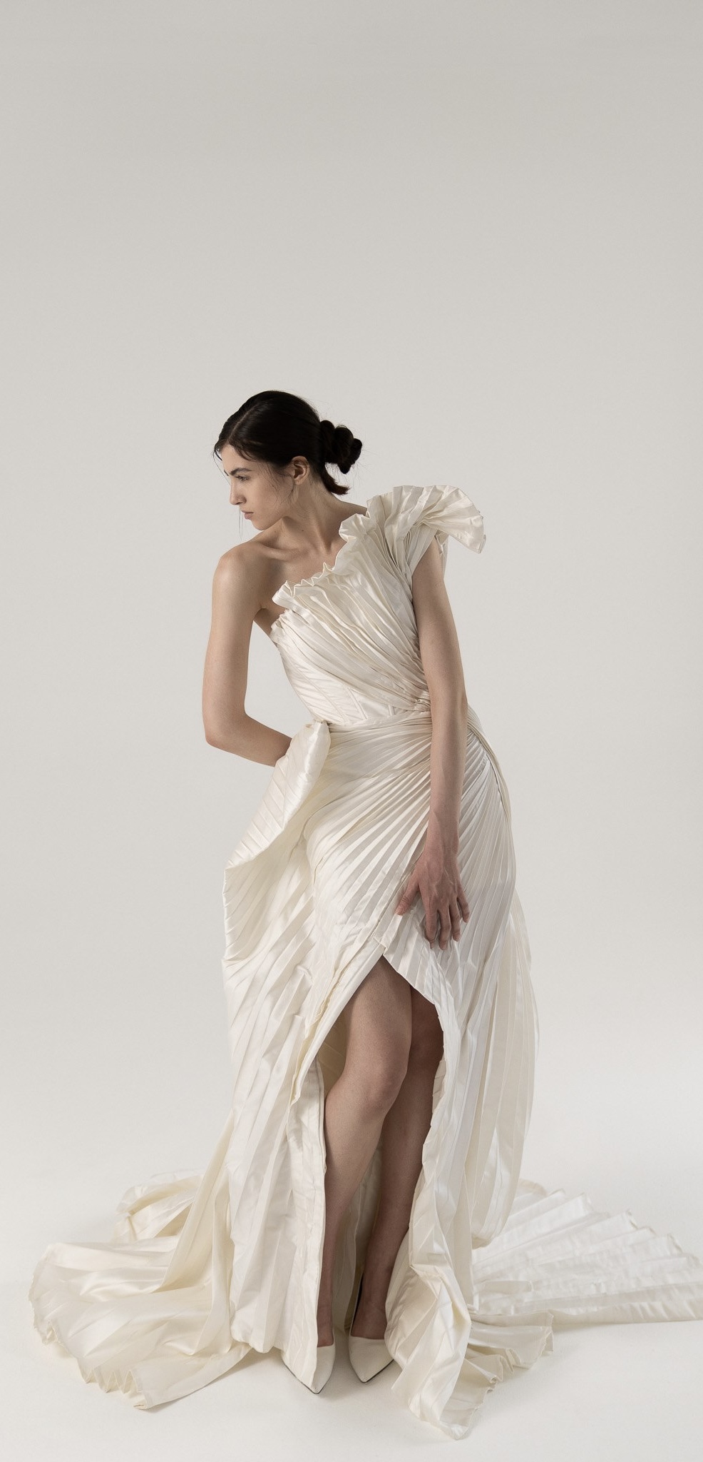 Это платье — настоящий вызов стандартам и обыденности. Ассиметричный верх с пышной плиссировкой создаёт эффектный акцент на плечах, а мягкие складки струятся вниз, подчёркивая женственные формы. Высокий разрез добавляет немного дерзости и свободы движений. Если ты хочешь выделиться из толпы и почувствовать себя невероятно шикарной и уникальной, то это платье для тебя.