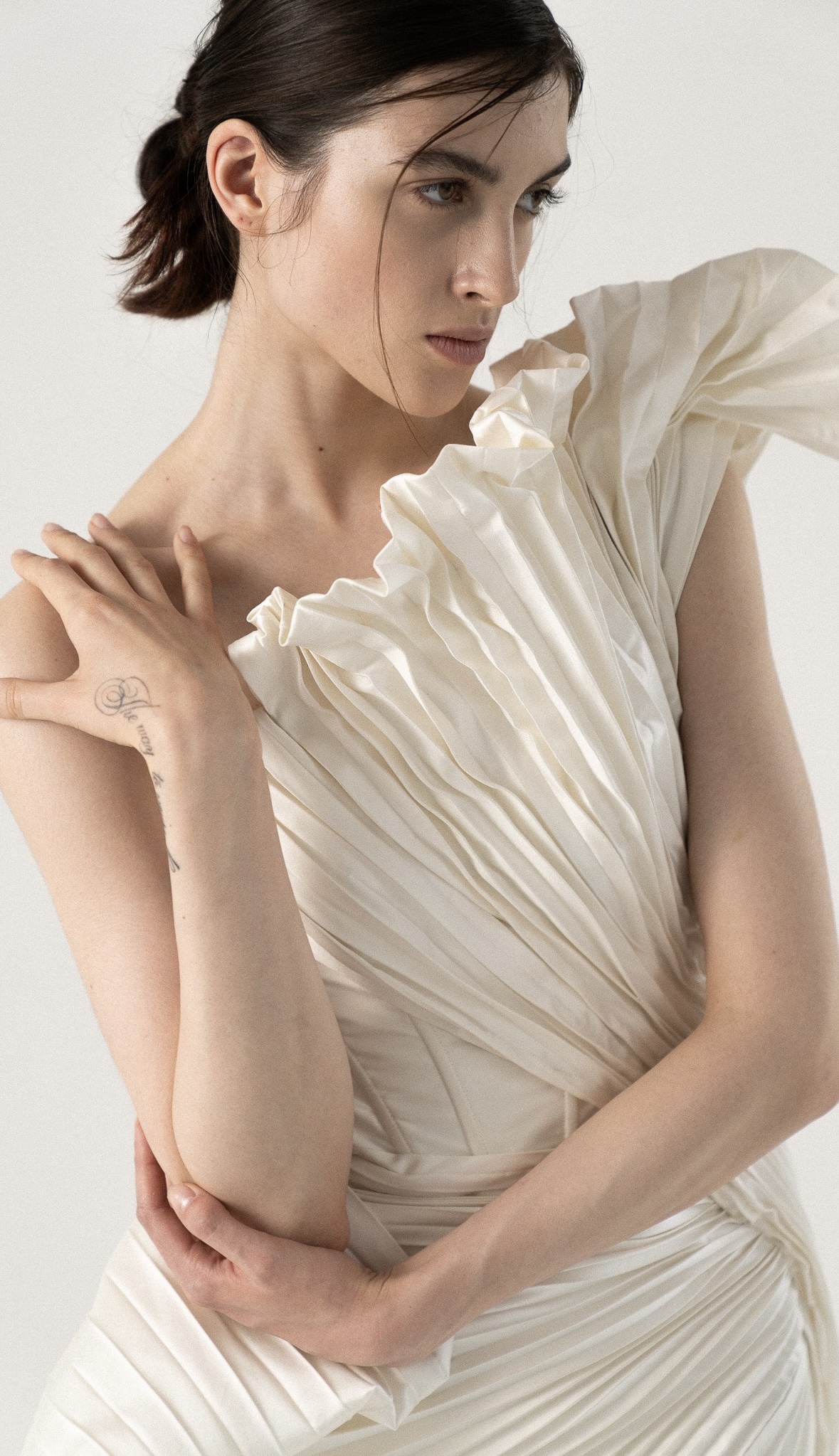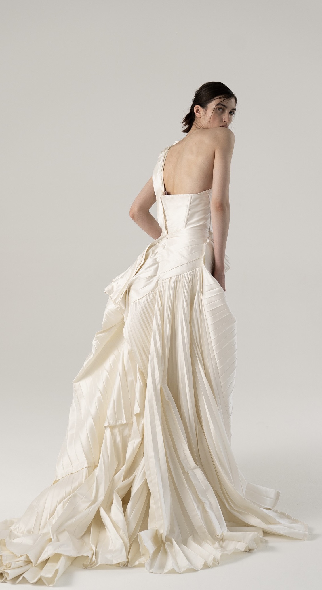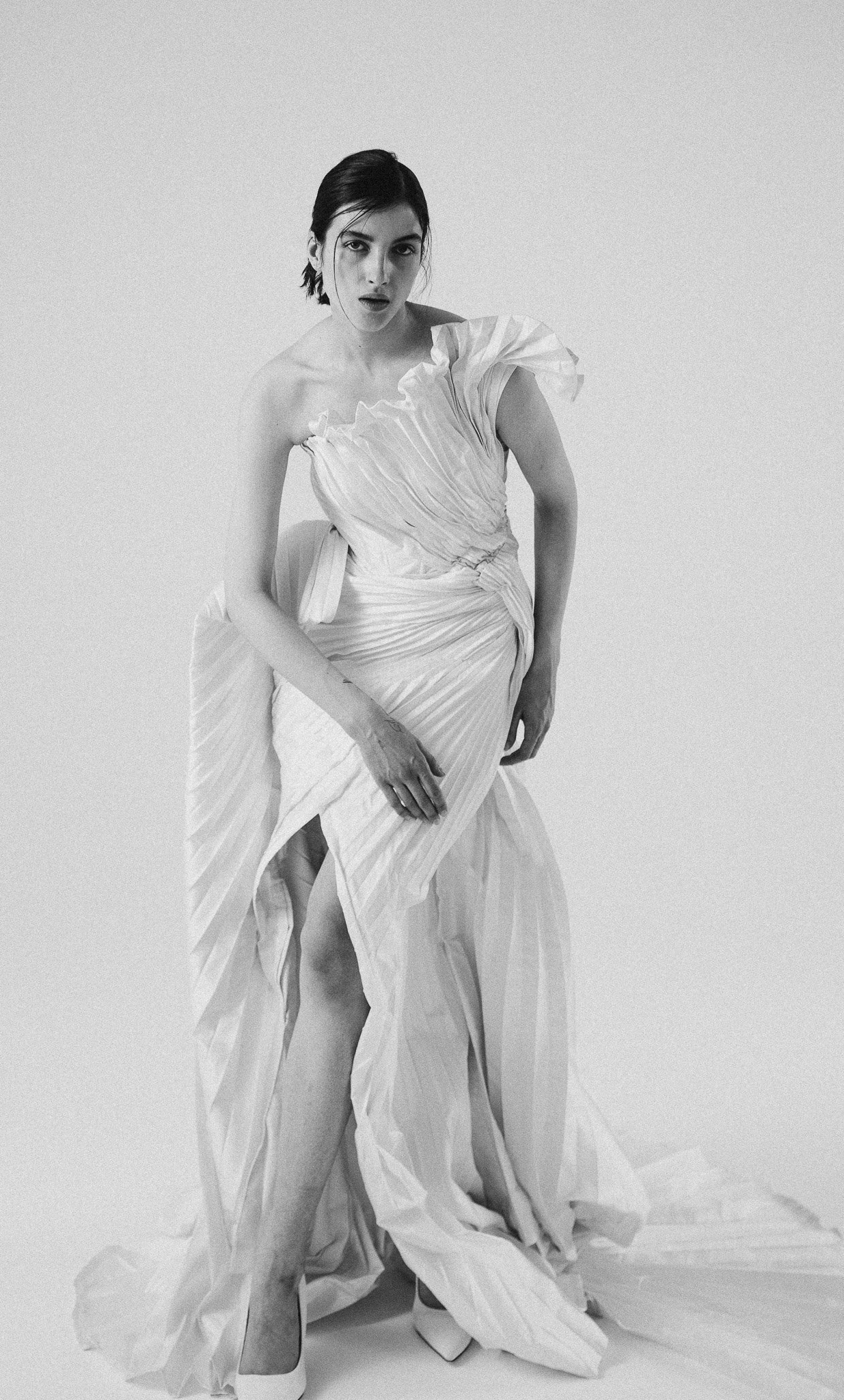 Это платье — настоящий вызов стандартам и обыденности. Ассиметричный верх с пышной плиссировкой создаёт эффектный акцент на плечах, а мягкие складки струятся вниз, подчёркивая женственные формы. Высокий разрез добавляет немного дерзости и свободы движений. Если ты хочешь выделиться из толпы и почувствовать себя невероятно шикарной и уникальной, то это платье для тебя.