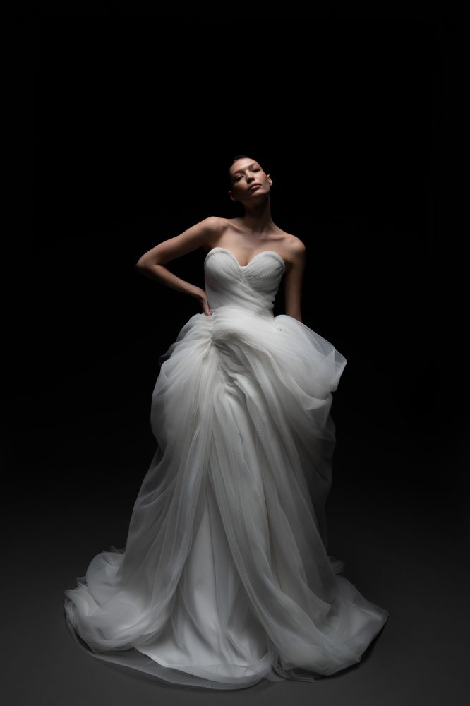Дорис — платье для тех, кто выбирает выразительность. Скульптурные складки, архитектурные волны ткани и почти невесомая асимметрия создают силуэт, в котором каждая деталь будто движется. Открытые плечи и тонкая бретель делают акцент на линии ключиц, а смелый разрез добавляет образу лёгкой дерзости. Но всё вместе — это не про эпатаж, а про уверенность. Про ту самую внутреннюю силу, которую не нужно доказывать словами.
