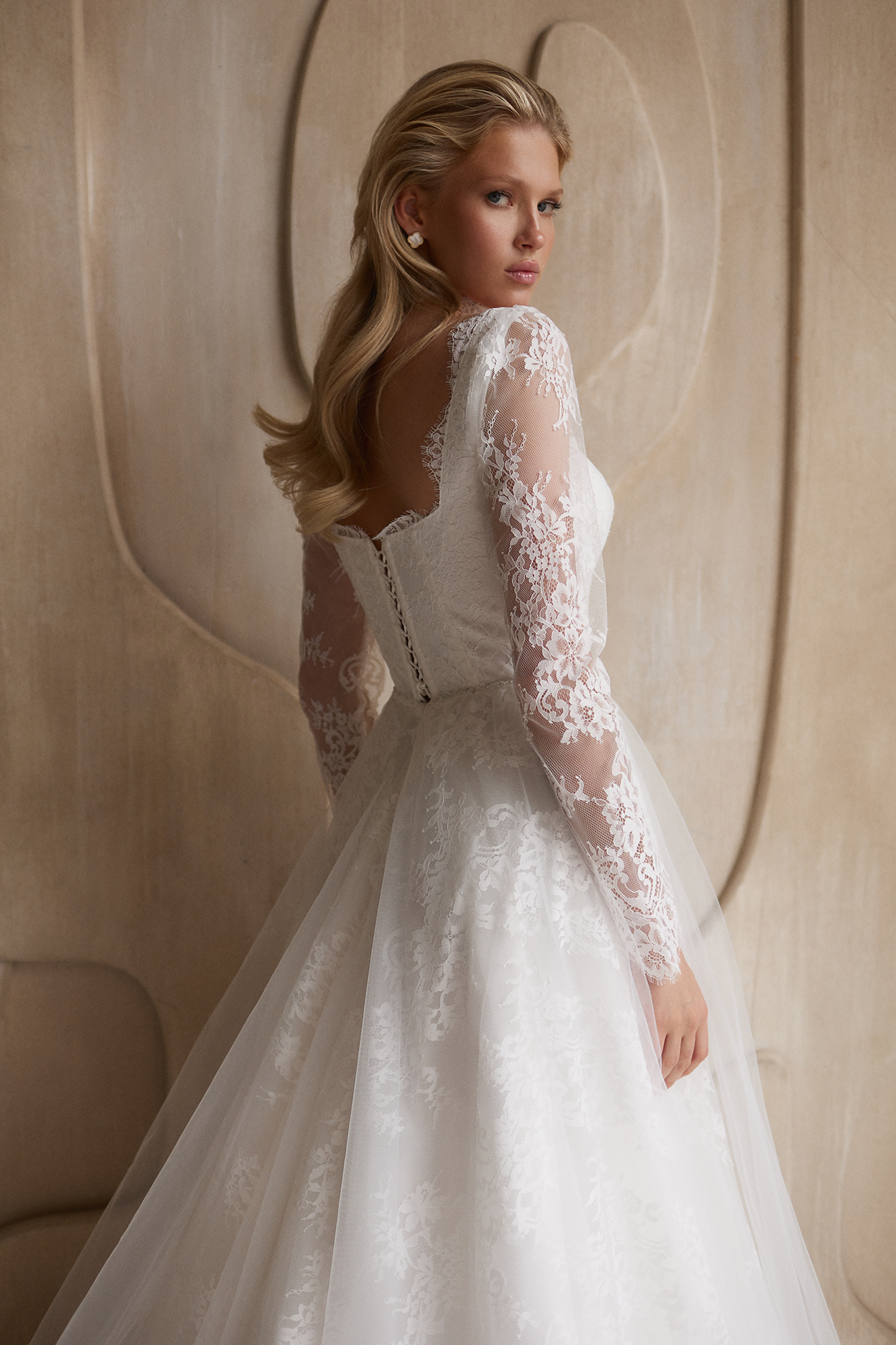 Платье, в котором чувственность встречается с изяществом. Оно обнимает фигуру, подчеркивая изгибы, а открытые плечи и длинные кружевные рукава делают образ эффектным и женственным. Прозрачный корсет с вышивкой придаёт образу смелости, но всё это уравновешивается благородной линией силуэта. Для невесты, которая хочет быть одновременно хрупкой и сильной — и блистать до мурашек.