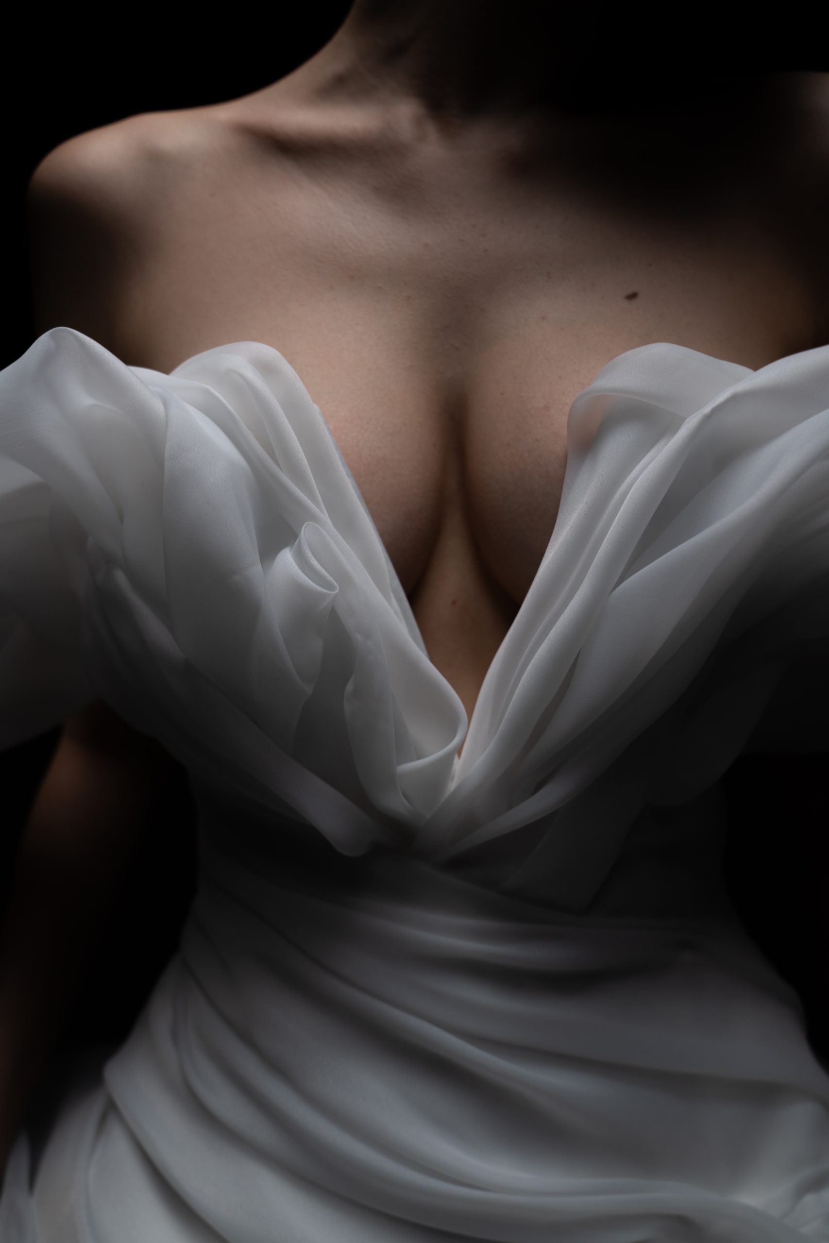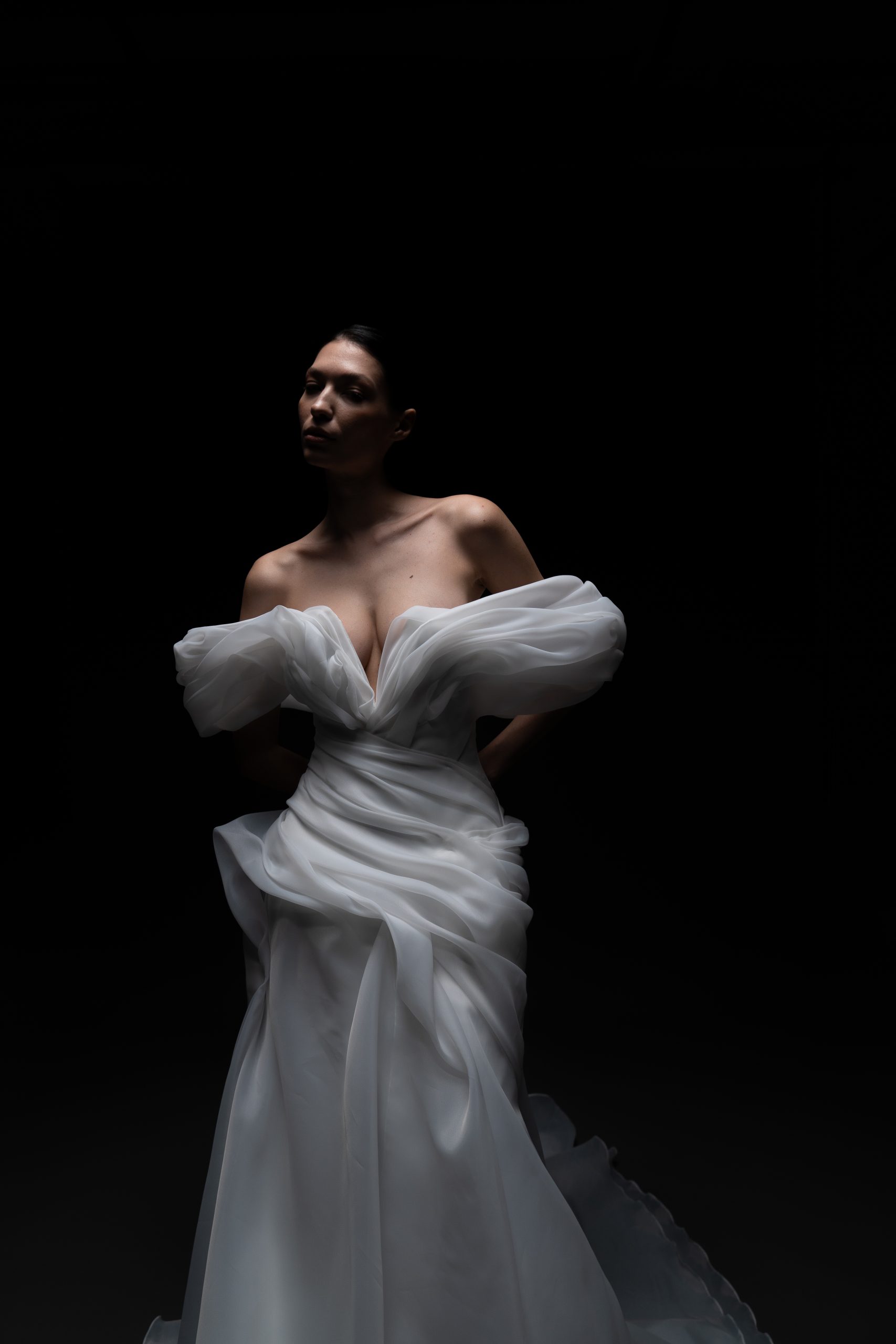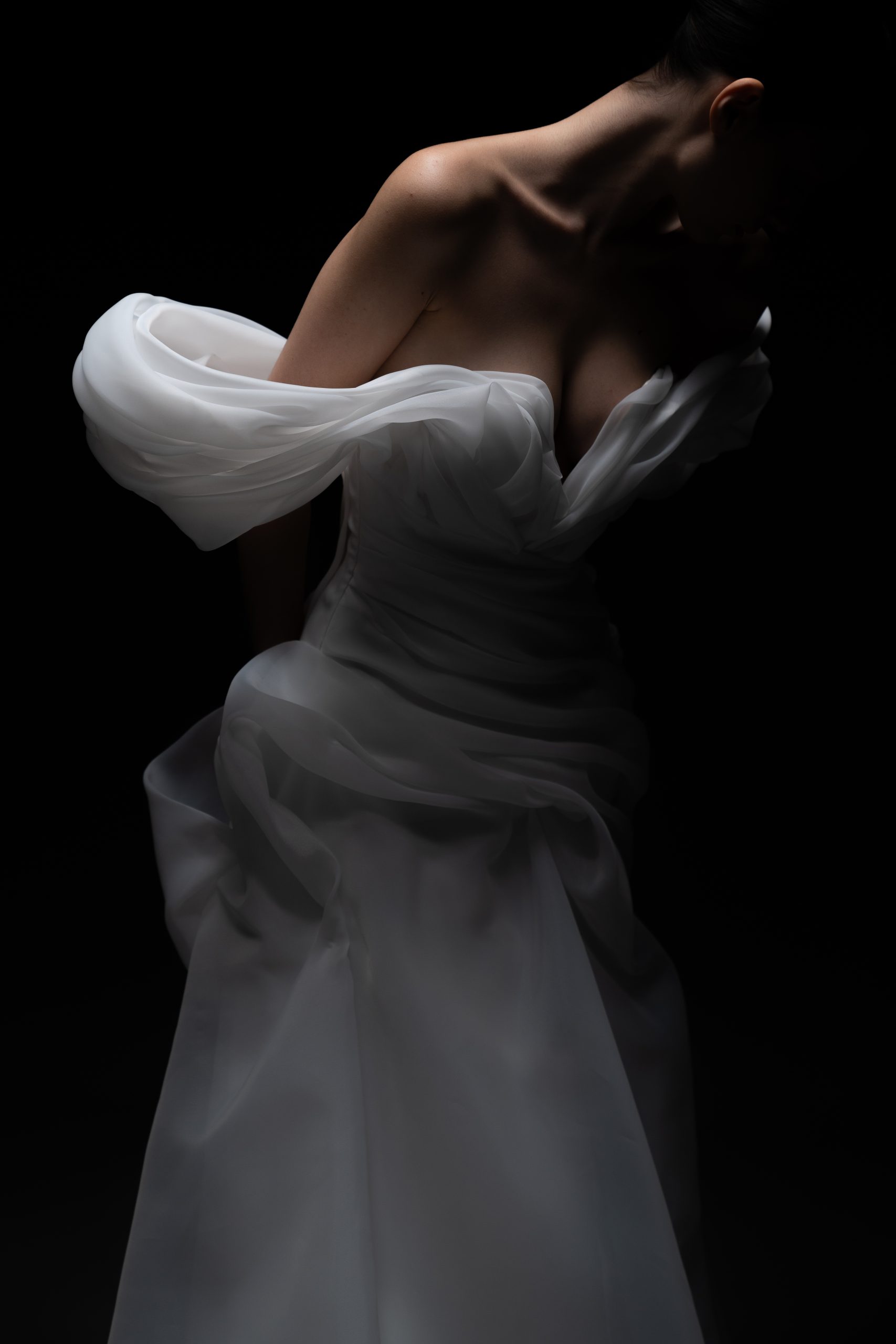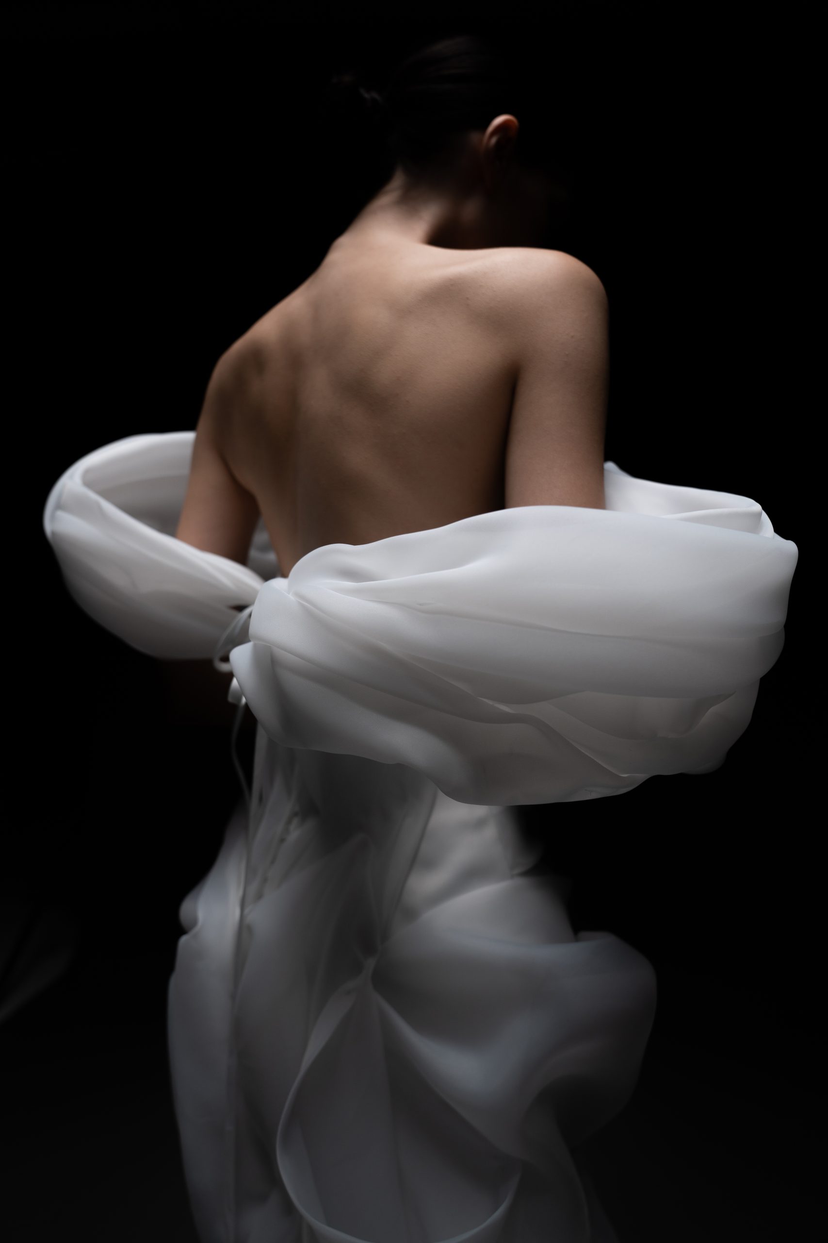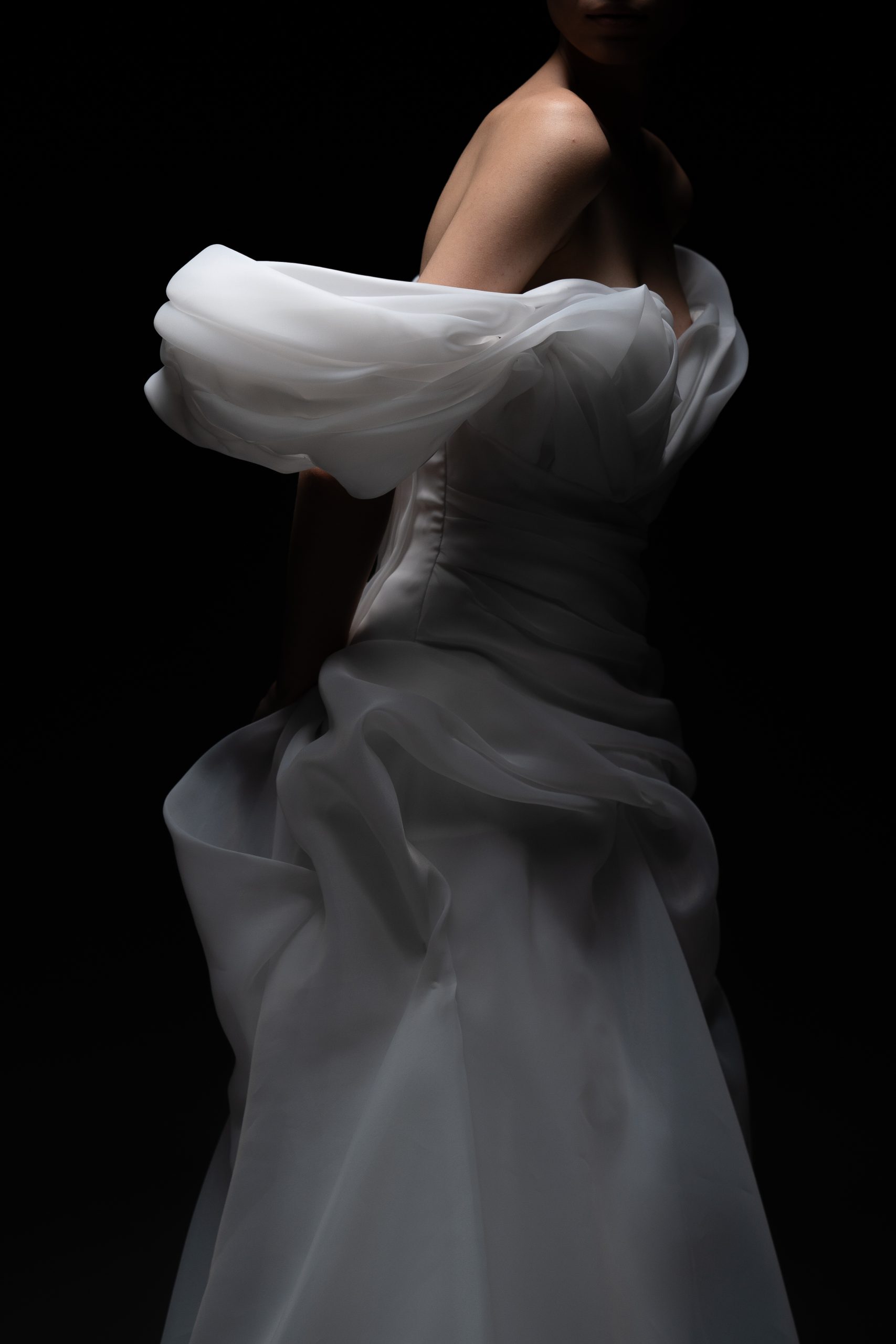 Платье, в котором свет будто оживает в ткани. Воздушная органза окутывает плечи облаком, создавая чувственный и скульптурный силуэт.