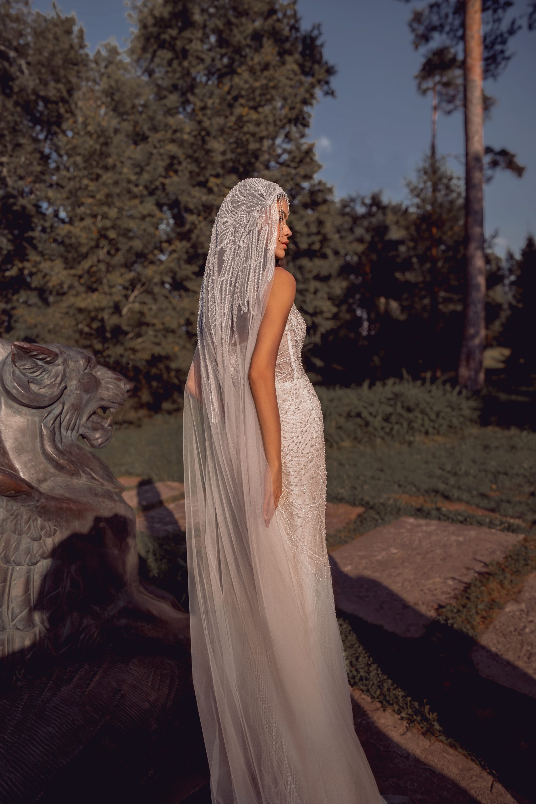 Фата, которая становится частью образа, а не просто деталью. Тонкая сетка фатина мягко струится по силуэту, а изящное бисерное плетение у лица создаёт эффект драгоценного обрамления.