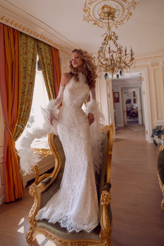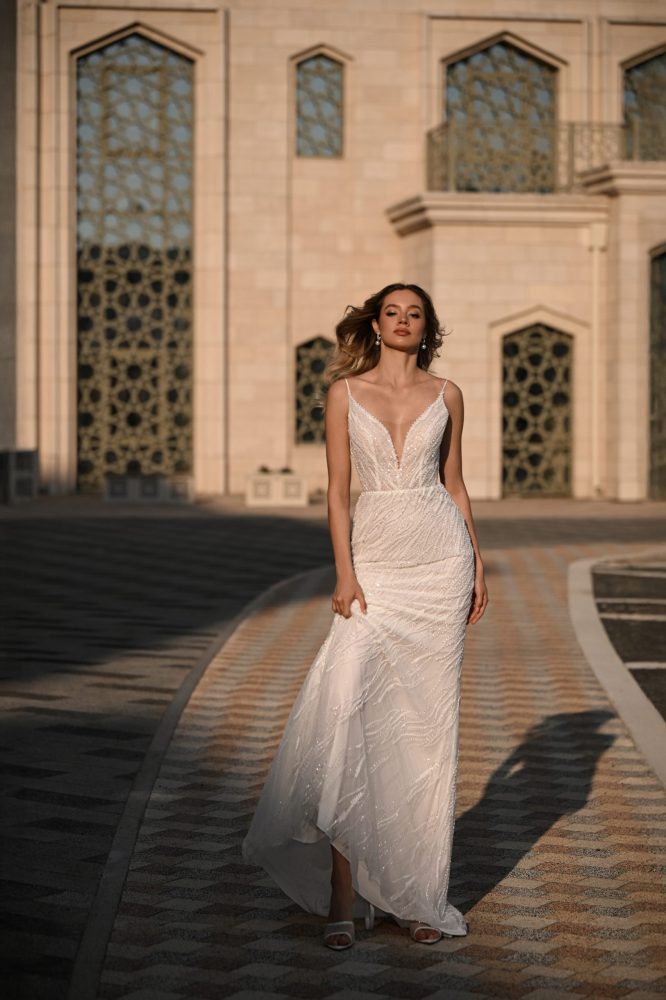 Лёгкость, будто созданная из солнечных лучей. Глубокий V-вырез смело открывает ключицы, а тонкие бретели подчёркивают хрупкость и утончённость силуэта. И пока нежное кружево переливается в движении, спинка раскрывает самое главное — естественную красоту невесты, которая сияет без усилий.
