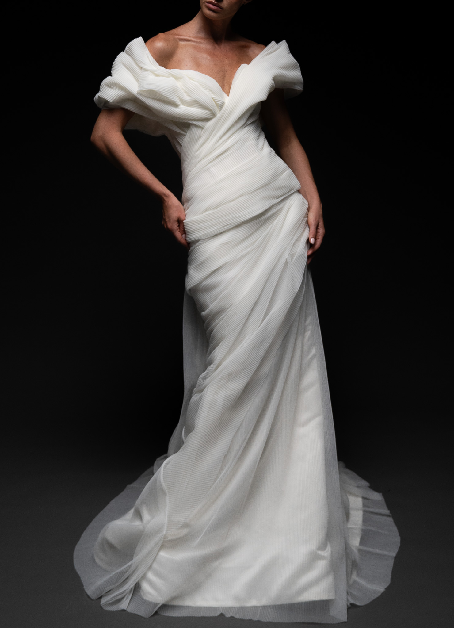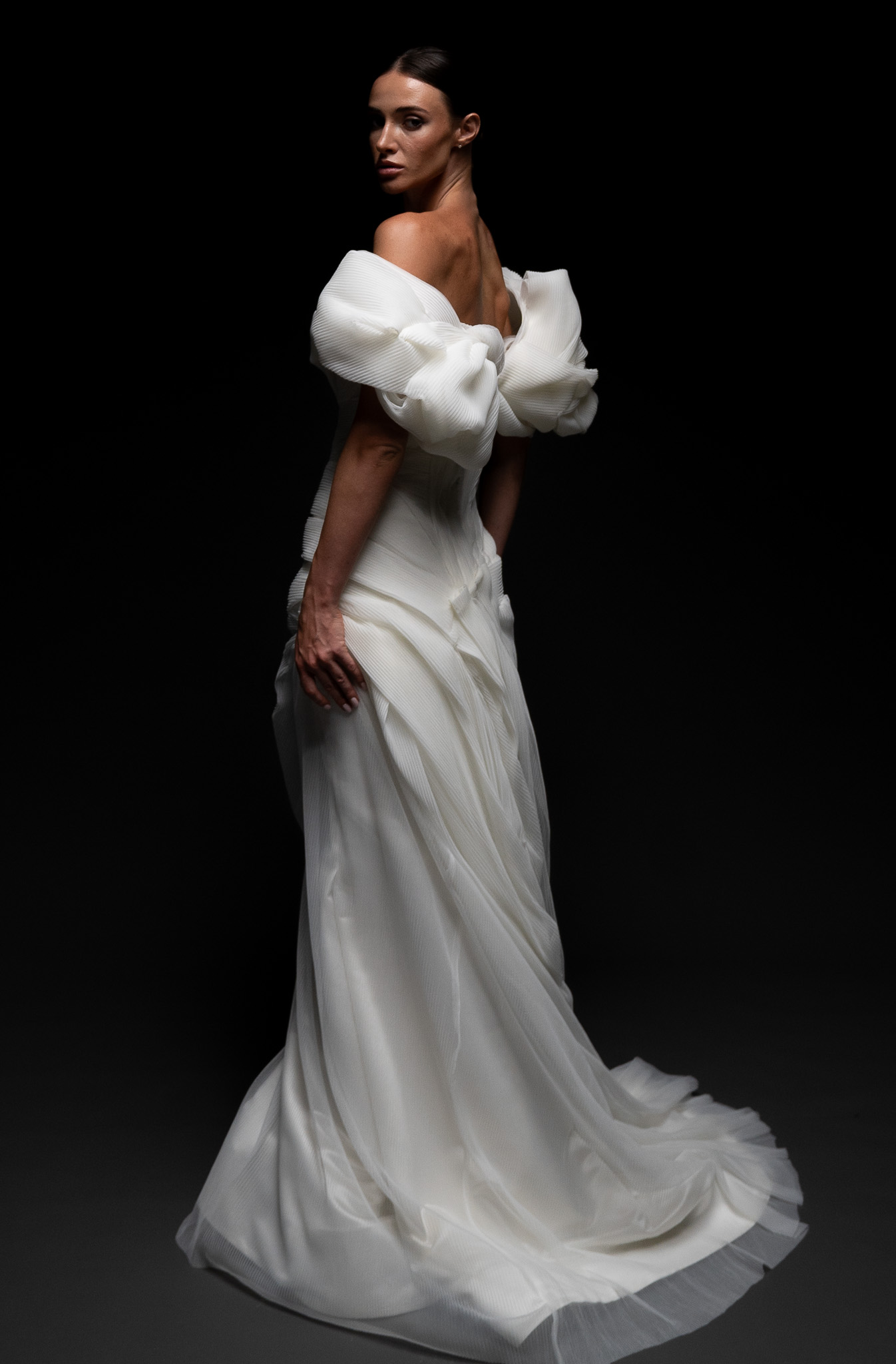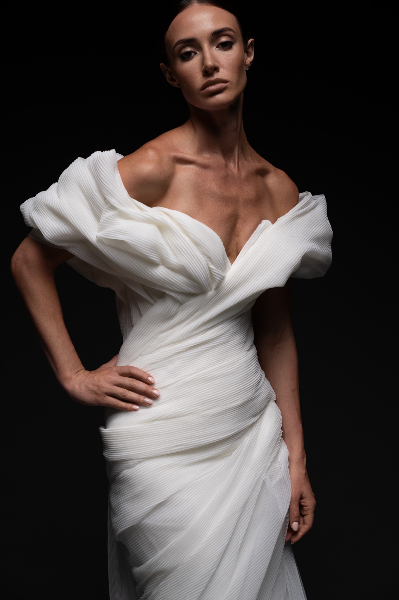 Эффектная скульптурная нежность, которое словно соткано из морского ветра и света. Галатея — это платье, созданное из многослойной воздушной органзы с уникальной фактурой. Корсет выполнен по принципу архитектурного каркаса — точно моделирует фигуру, создавая изящную линию талии и благородную осанку. Каждый слой ткани собран так, чтобы добиться ощущения движения даже в полной неподвижности.