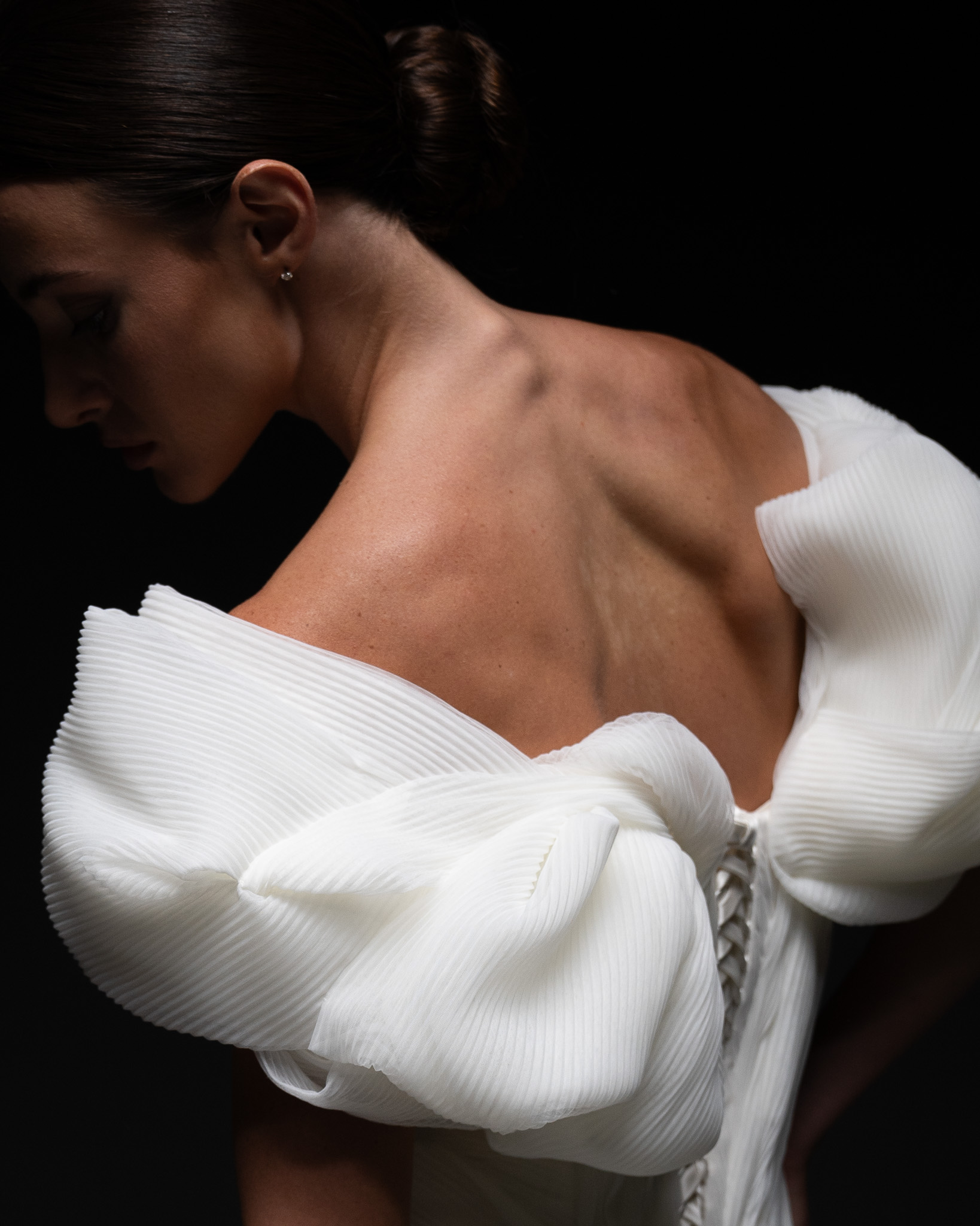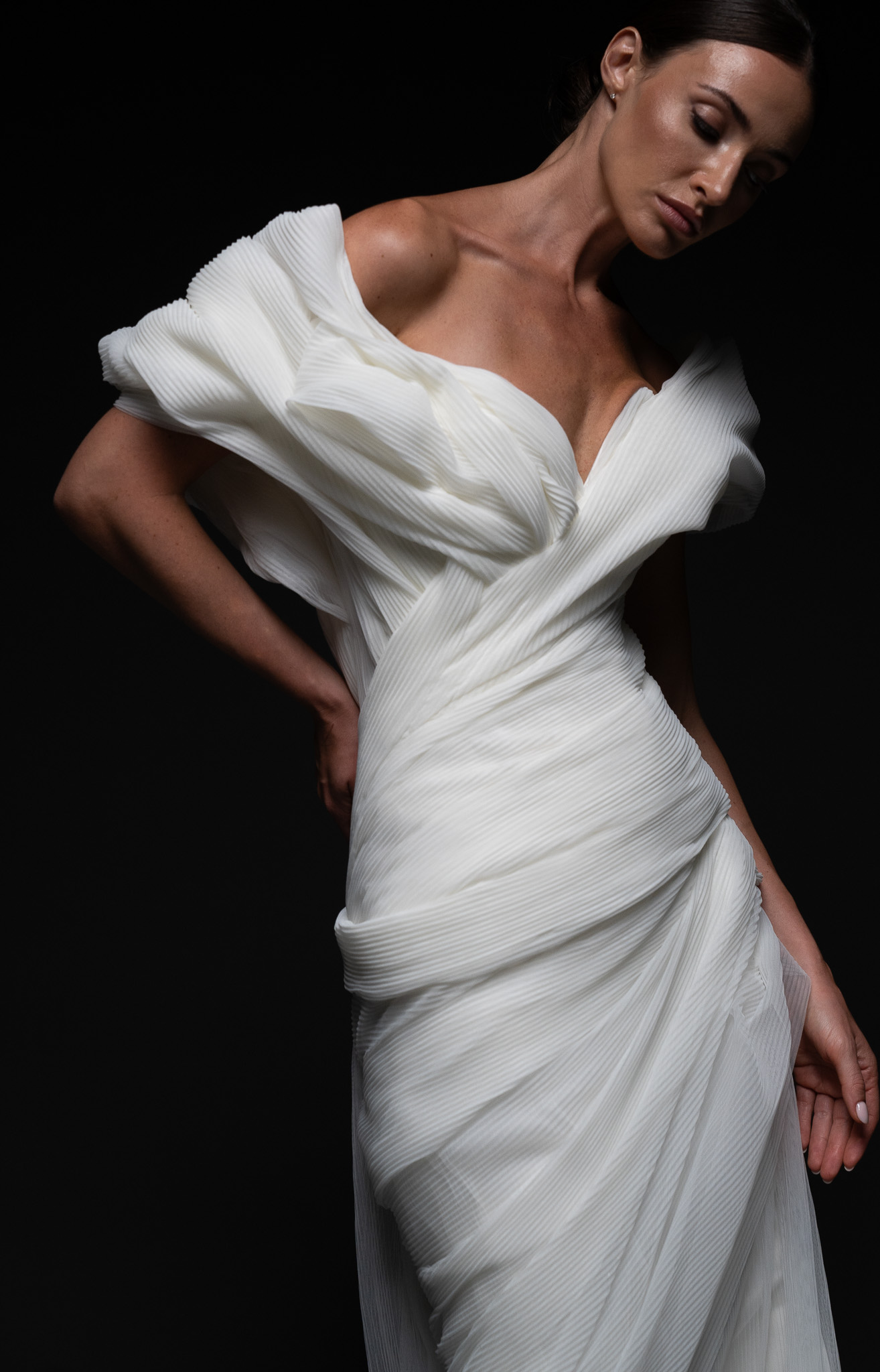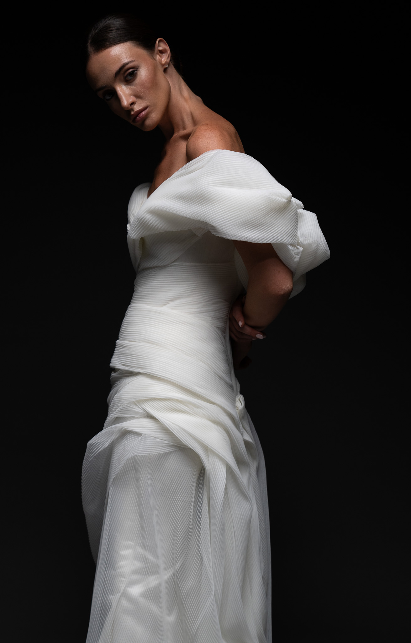 Эффектная скульптурная нежность, которое словно соткано из морского ветра и света. Галатея — это платье, созданное из многослойной воздушной органзы с уникальной фактурой. Корсет выполнен по принципу архитектурного каркаса — точно моделирует фигуру, создавая изящную линию талии и благородную осанку. Каждый слой ткани собран так, чтобы добиться ощущения движения даже в полной неподвижности.