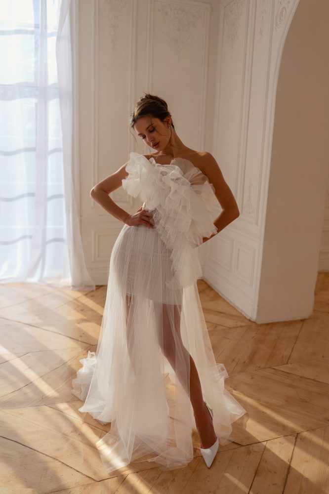Тонкая архитектура сияния. Узор из бисера ложится на платье как свет, скользящий по мрамору: подчёркивает талию, вытягивает силуэт и создаёт игру линий, которую хочется рассматривать бесконечно. Полупрозрачный корсет делает образ лёгким, но при этом графичным, а плавное прилегание платья формирует идеальную посадку без перегруза.