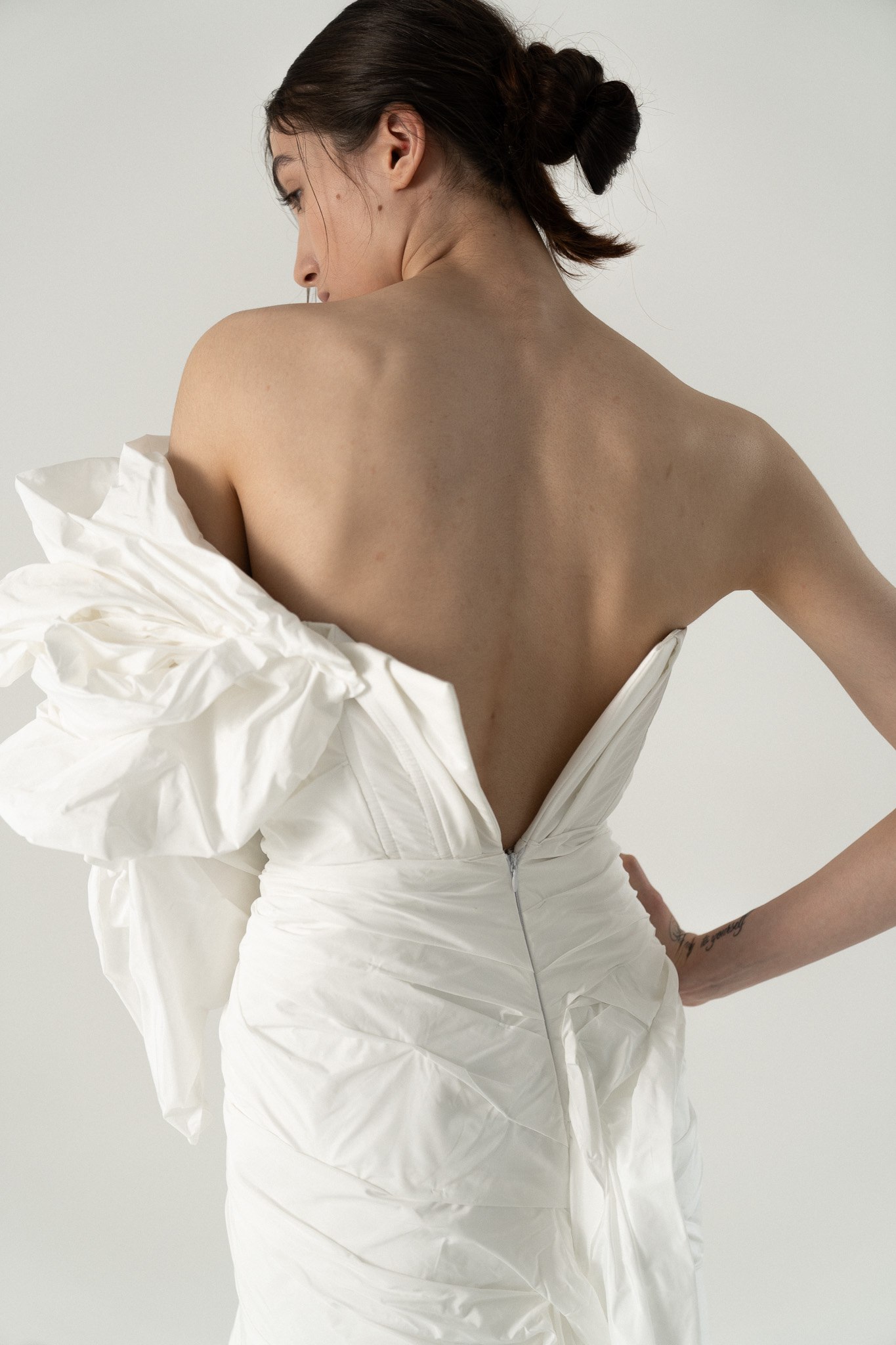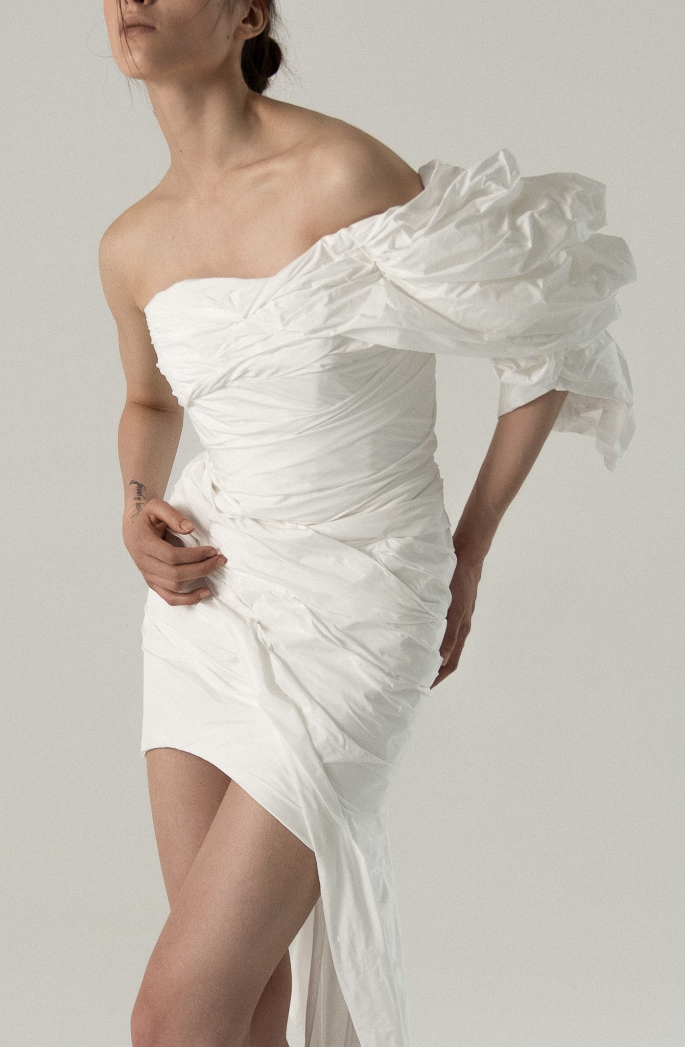 Это платье — смелое сочетание элегантности и современного шика. Асимметричный крой с эффектным драпированным рукавом создаёт выразительный и неповторимый силуэт. Мини-длина спереди и длинный шлейф сзади добавляют образу лёгкости и соблазнительности. Выполнено из тонкой, но фактурной ткани, которая подчёркивает каждый изгиб тела, даря чувство уверенности и свободы. Идеальный выбор для невесты, которая хочет выделиться и оставить незабываемое впечатление.
