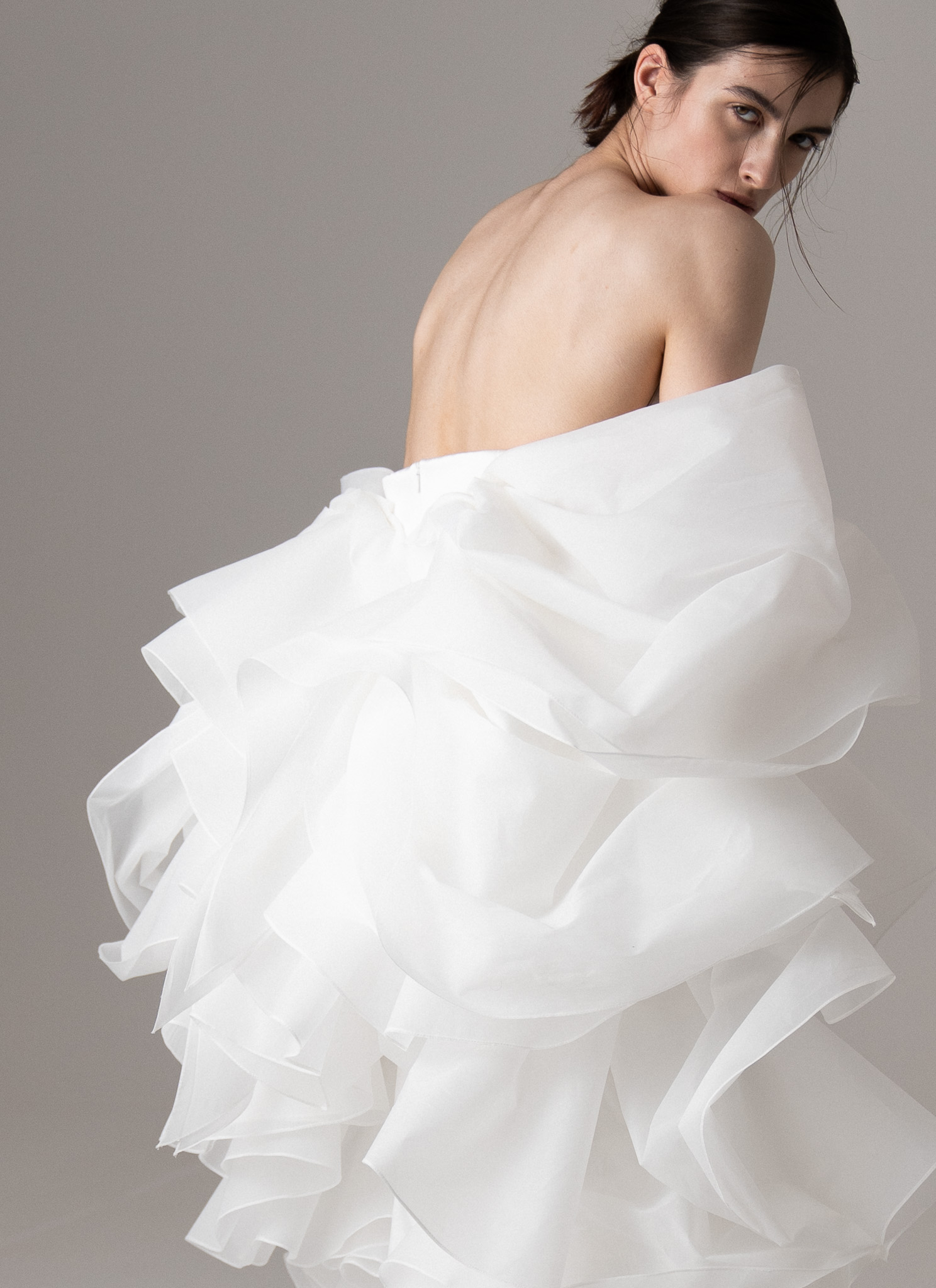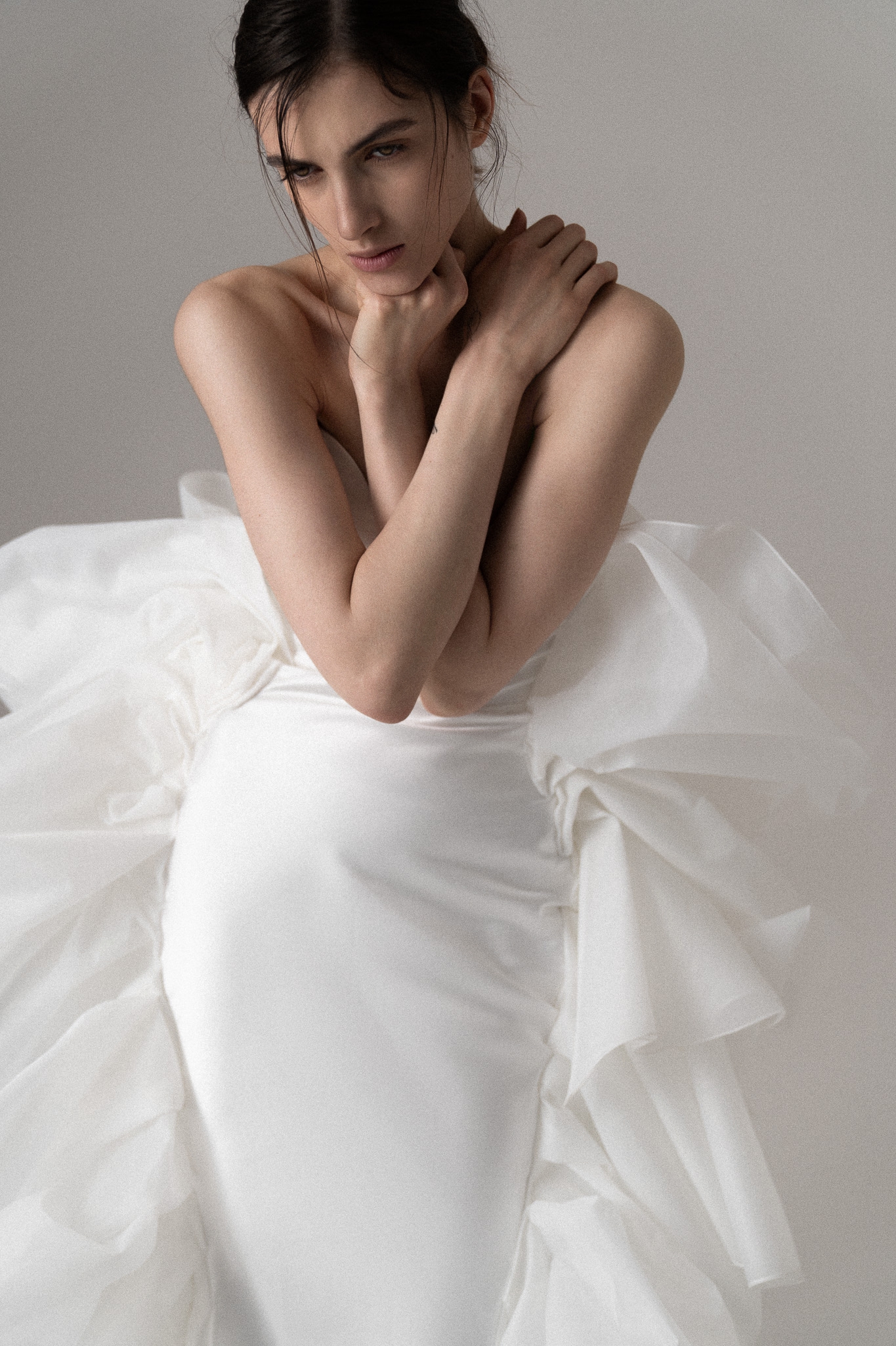 Платье вне рамок, вне времени, вне конкуренции. Эксклюзивная модель, созданная для тех, кто не ищет компромиссов. Матовый атлас, глубокий вырез, чистый корсет, идеальная посадка по фигуре — и взрывная архитектура объёмных воланов из органзы создает эффект, который невозможно забыть. Ты в нём — не просто невеста, ты fashion-героиня своего дня.