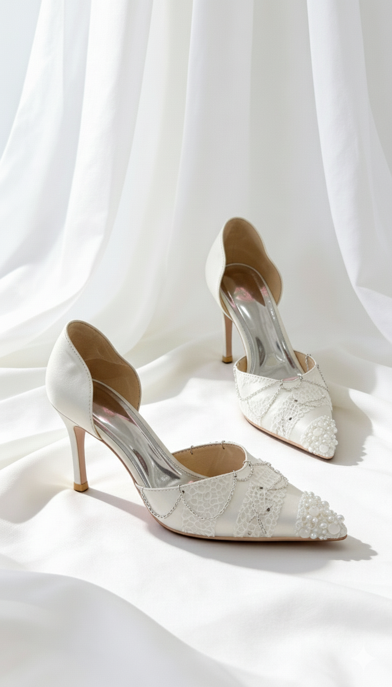 Стильные туфли с изящным сочетанием кружева и жемчужного декора выглядят нежно и утончённо. Лёгкая полупрозрачная фактура добавляет образу воздушности, а деликатные акценты подчёркивают его нарядность без излишней выразительности.