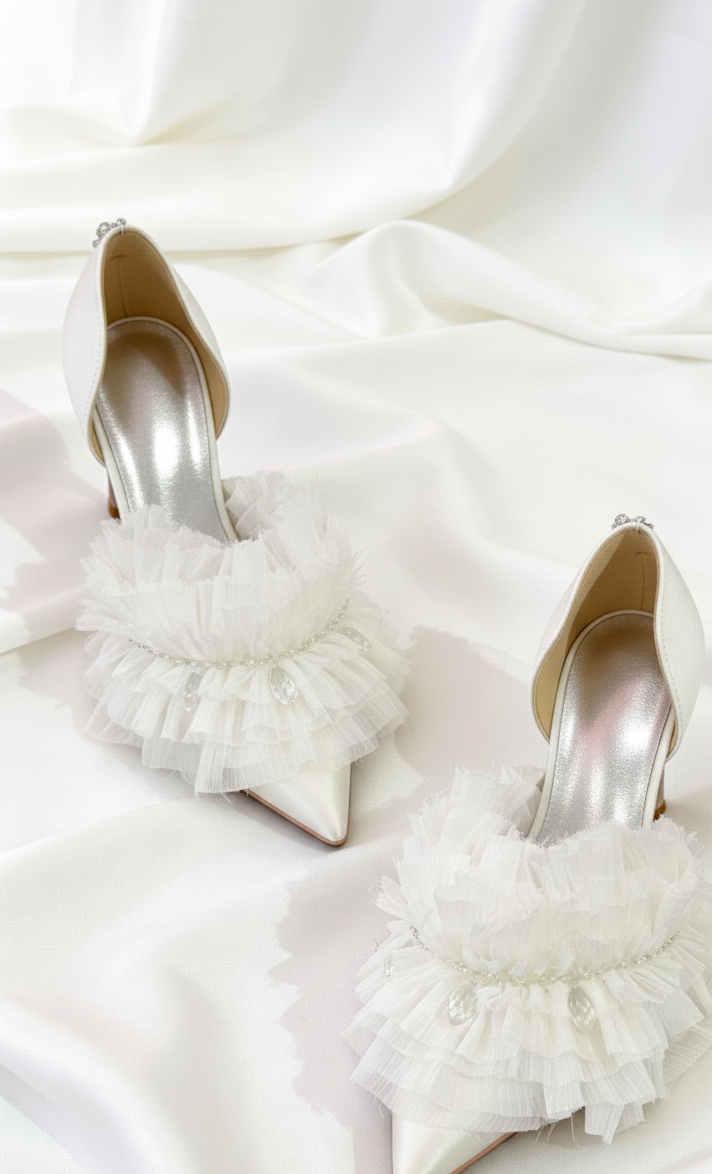 Элегантные туфли, украшенные объёмной драпировкой с деликатным декором. Фактурный акцент делает модель выразительной и праздничной, при этом сохраняя лёгкость и элегантность образа. Аккуратный каблук поддерживает баланс между красотой и комфортом.
