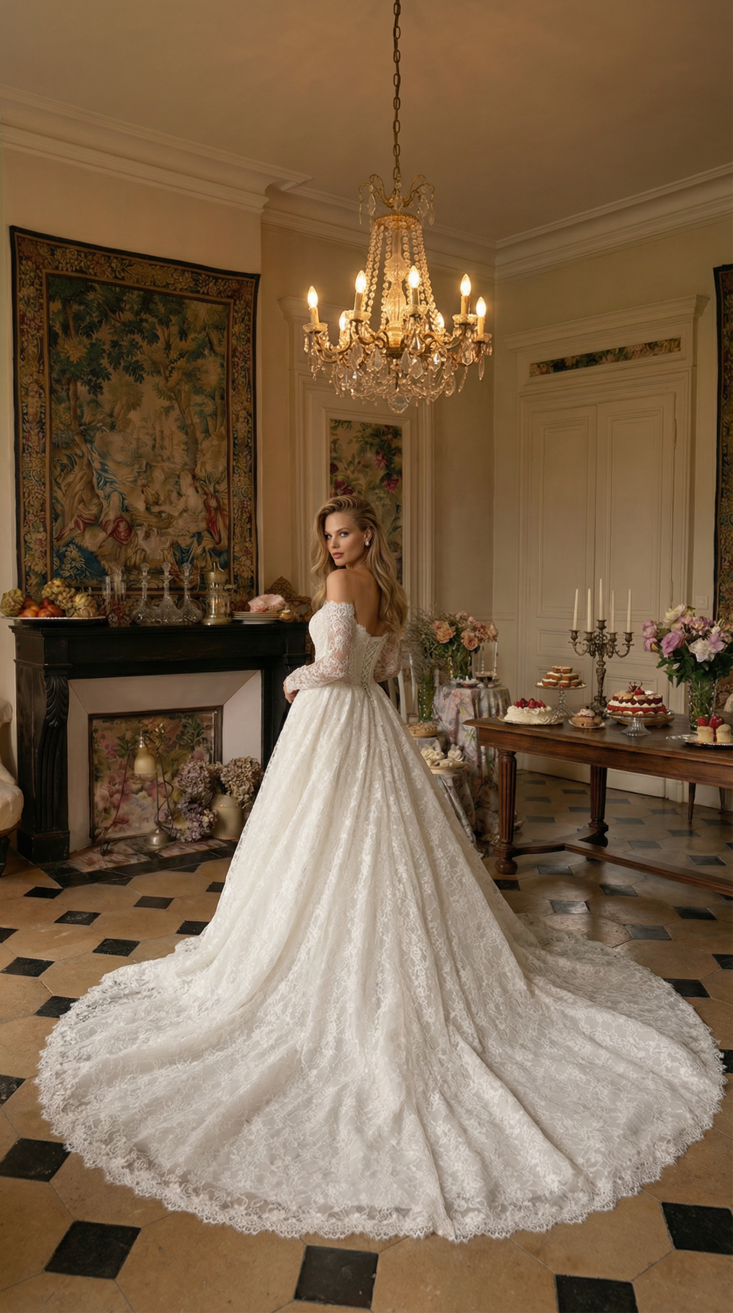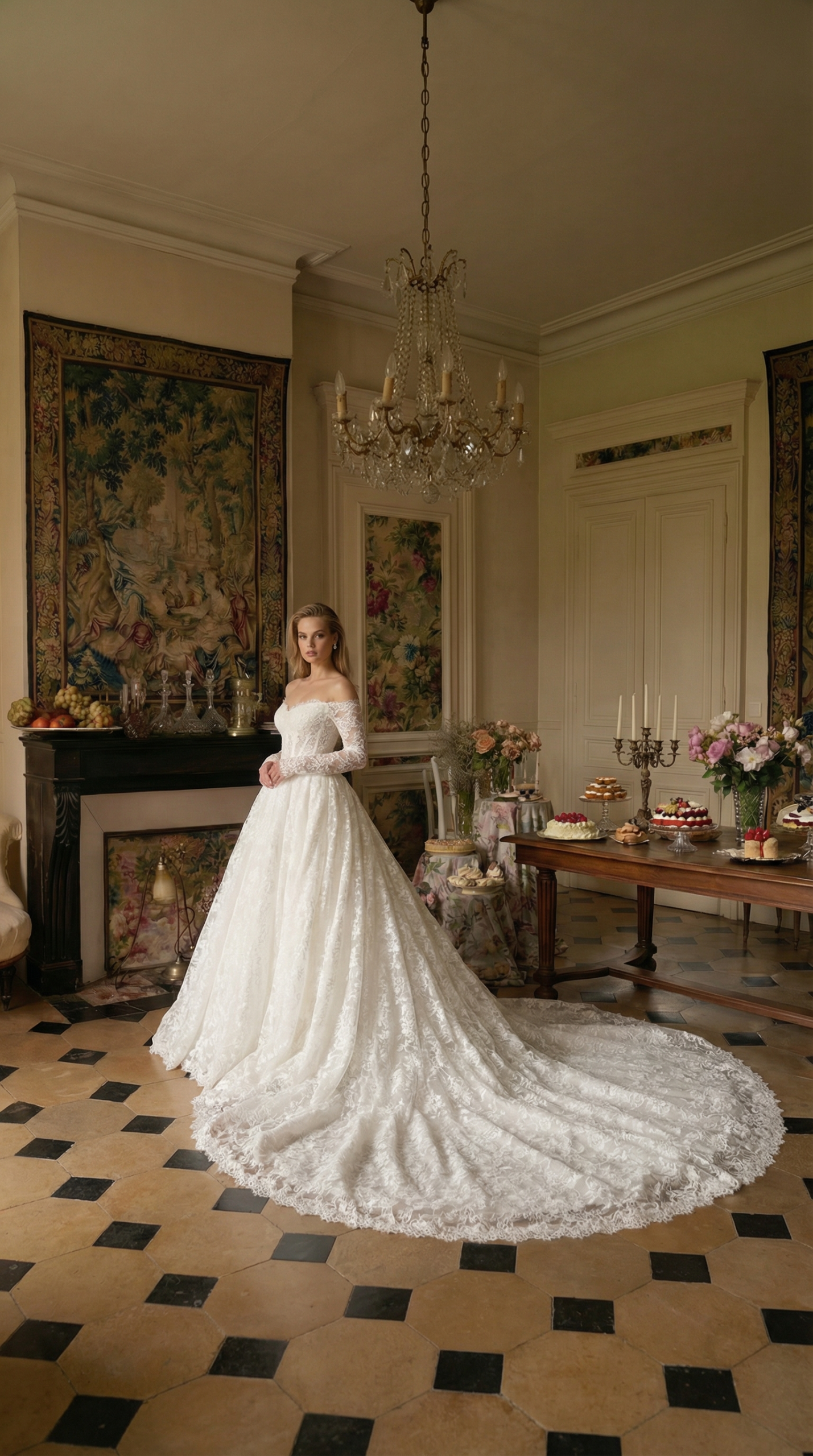 Платье, в котором классика звучит торжественно и по-королевски. Нежный кружевной корсет с открытой линией плеч подчёркивает шею и ключицы, а тонкие прозрачные рукава добавляют образу утонченности. Пышная юбка с изысканным кружевным узором и длинным шлейфом создаёт ощущение настоящего свадебного величия — того самого момента, когда каждый шаг замирает в восхищении.
