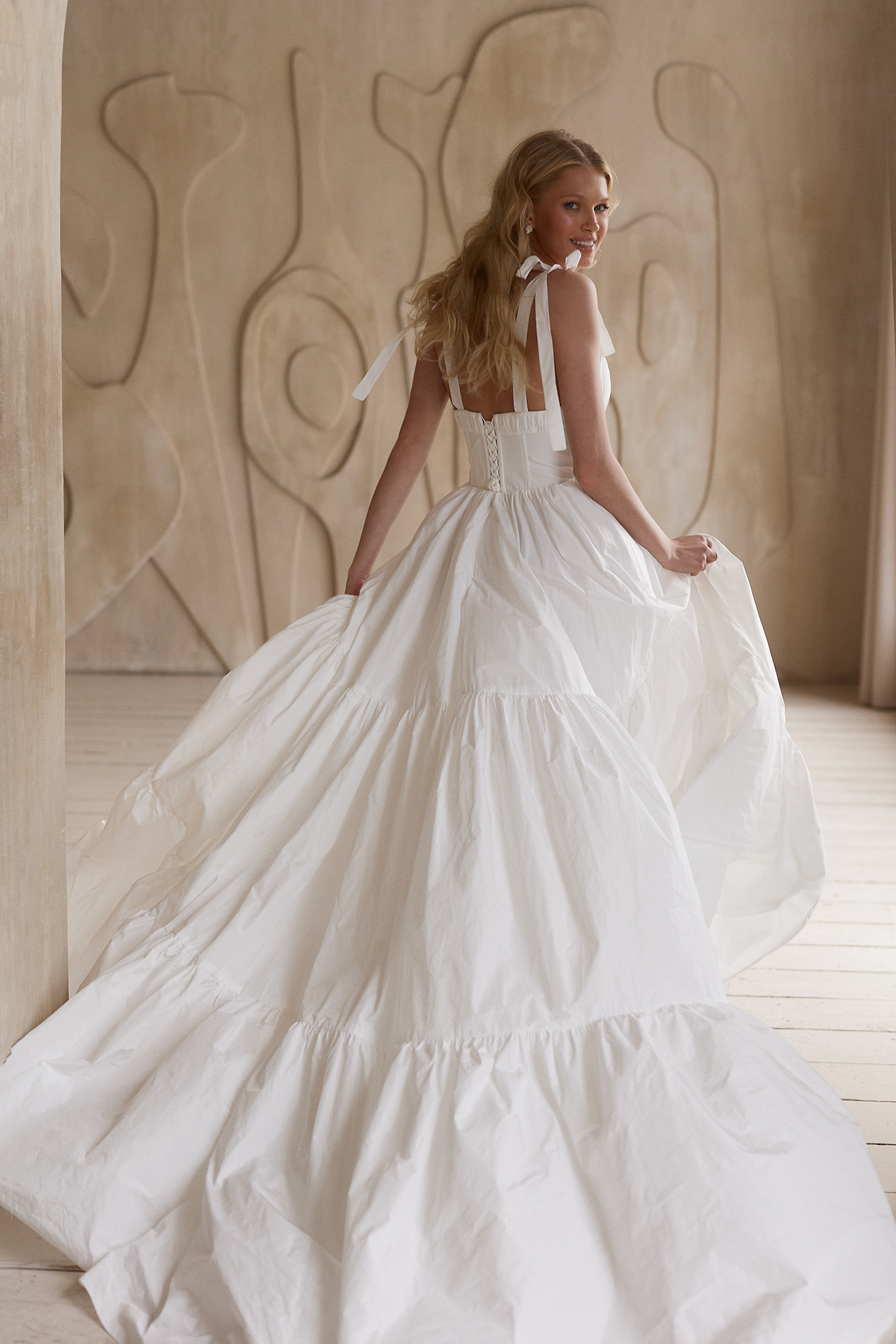 Для той, кто выбирает свободу. Невесомое, почти воздушное платье с характером. Лёгкие сборки из тафты, свободный крой и завязки на плечах будто подсказывают: можно быть собой, можно идти босиком, можно танцевать до рассвета. Когда свадьба становится праздником жизни, а не сценарием по пунктам.