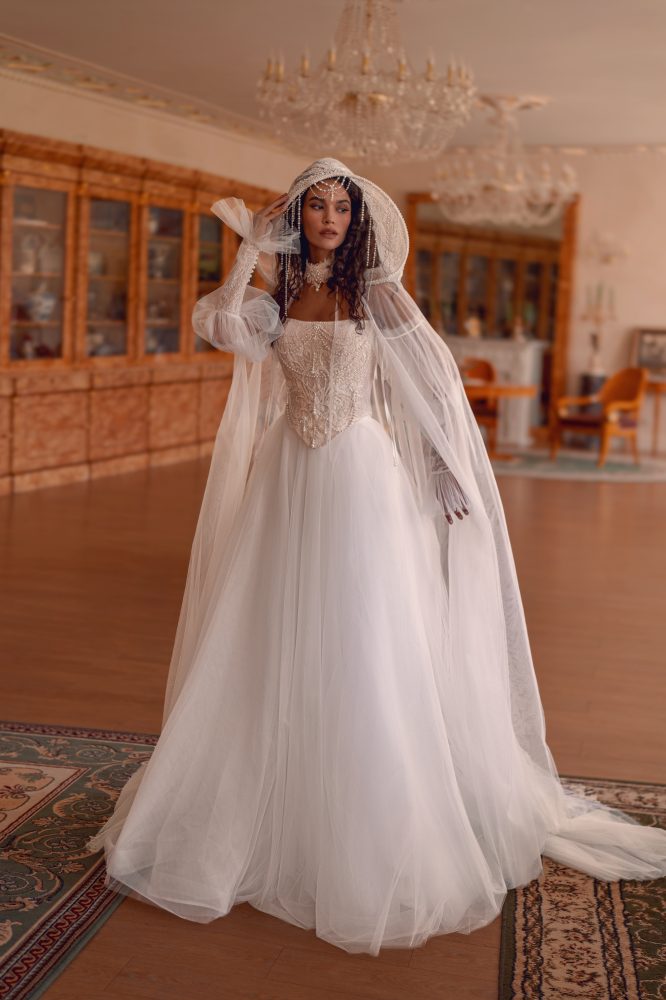 Кьяра подойдёт для торжественной церемонии в ЗАГСе или классической свадьбы в городе, где хочется подчеркнуть статус, стиль и уверенную нежность.