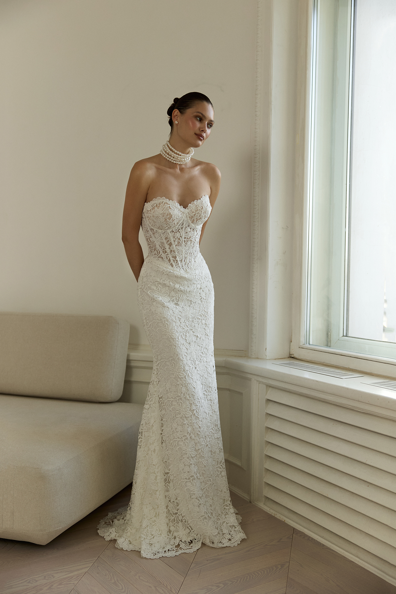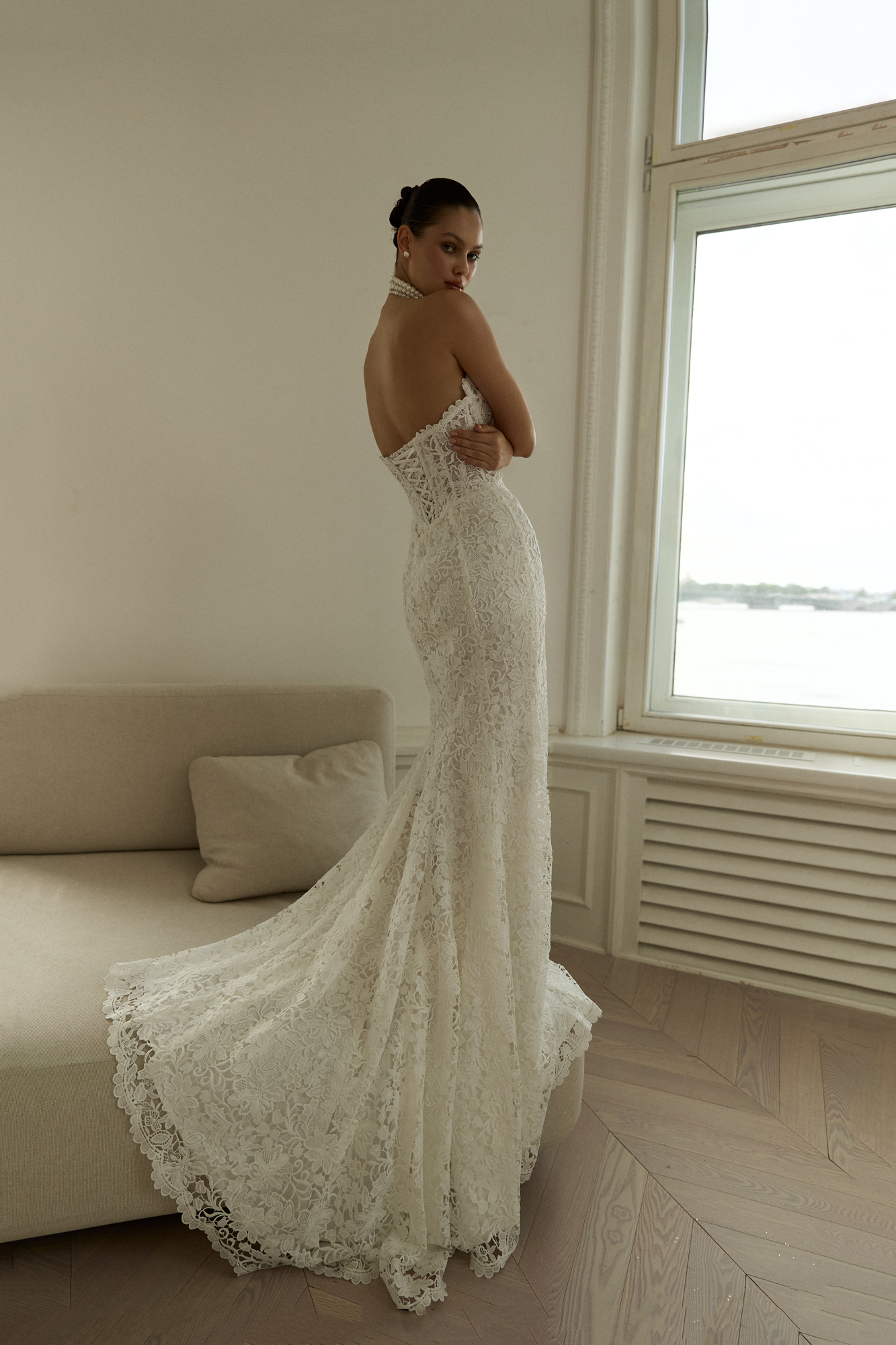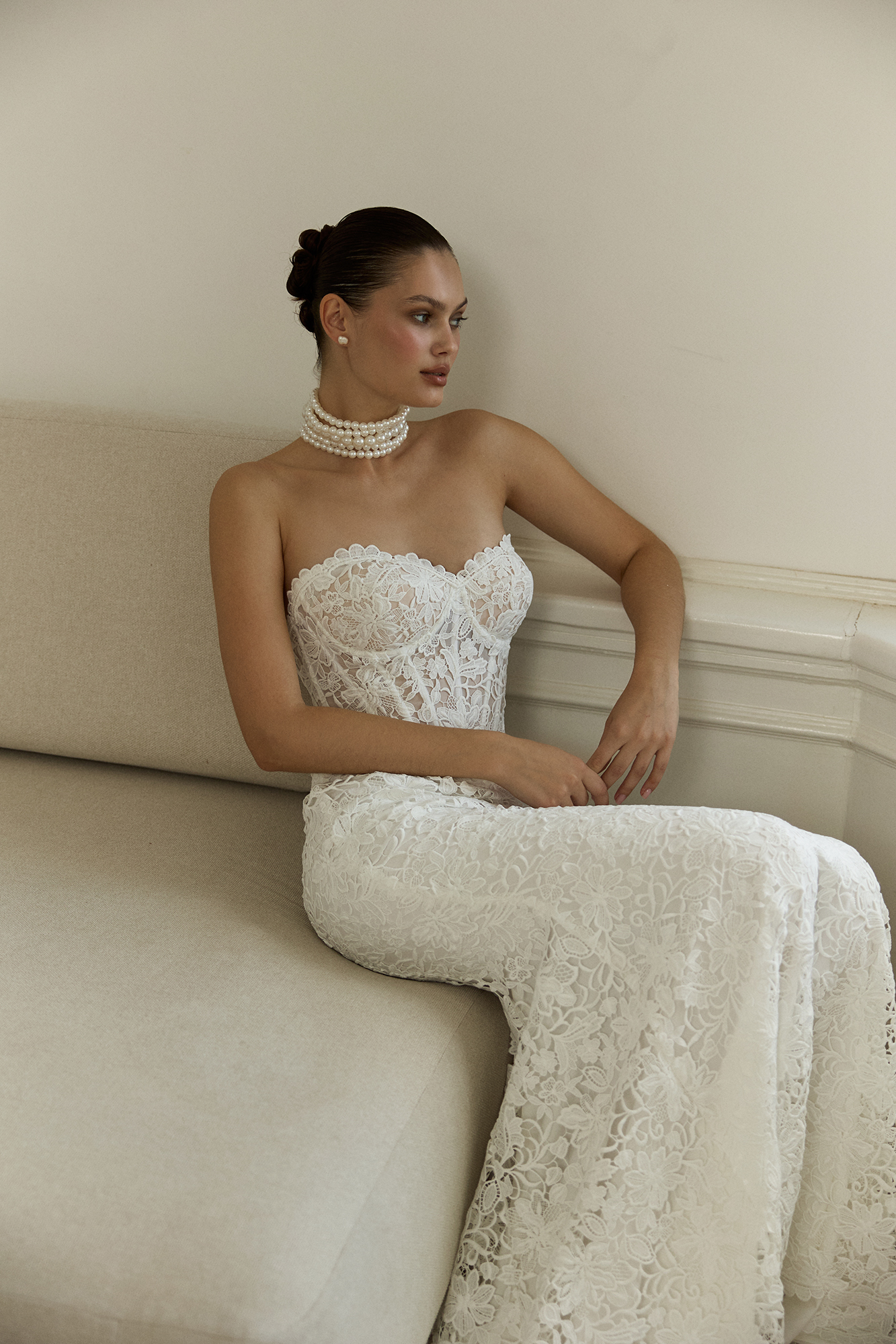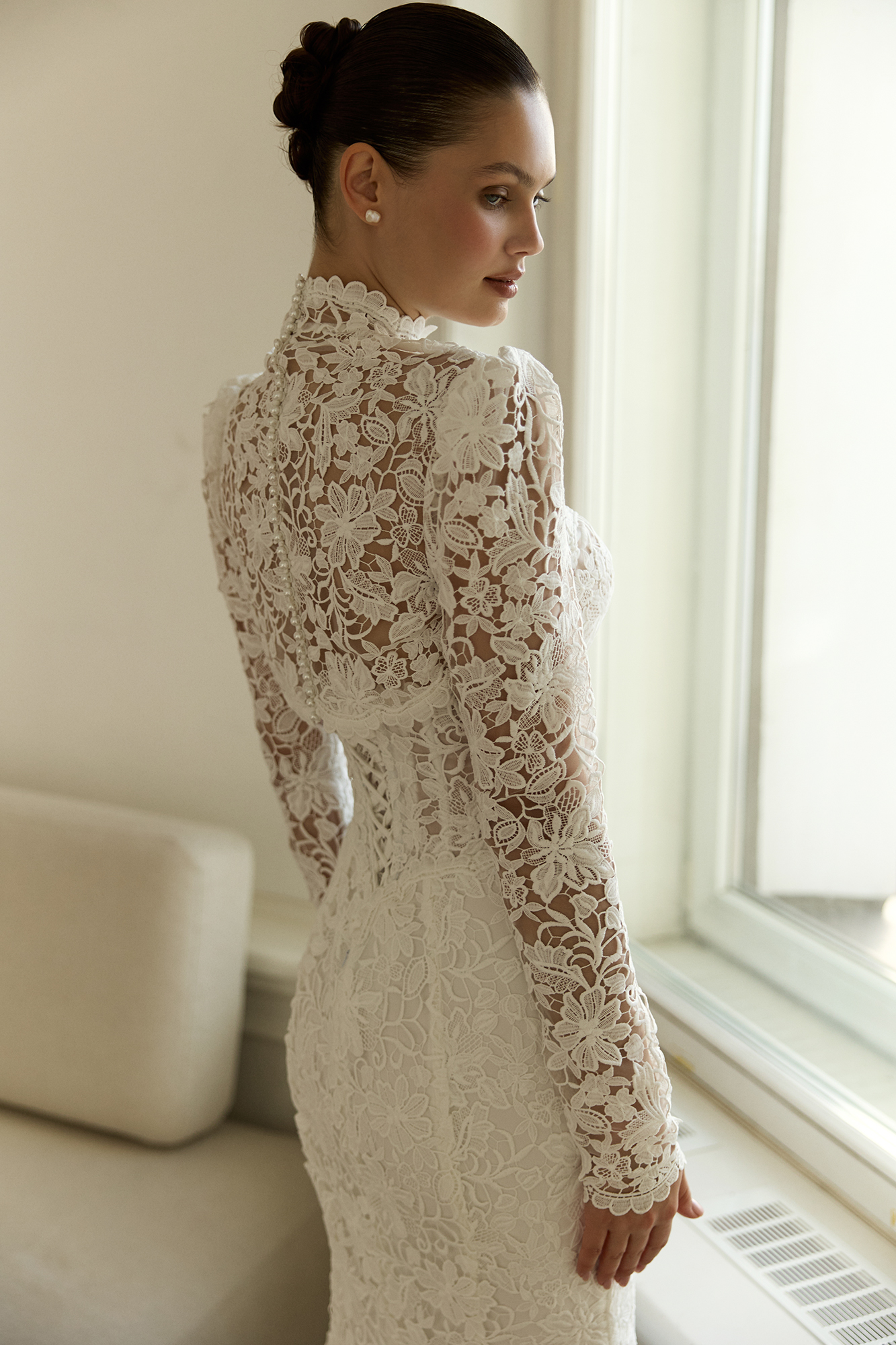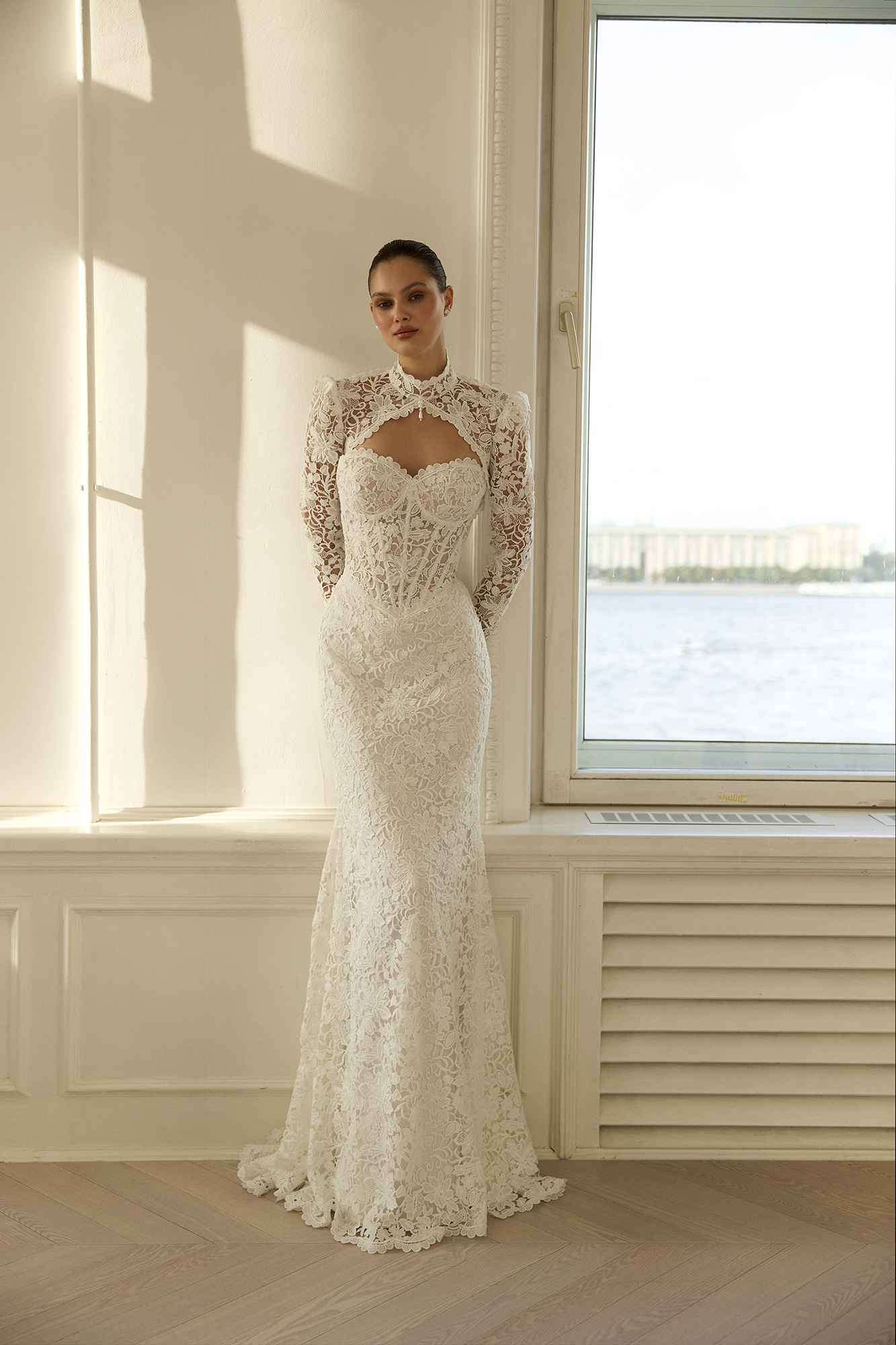 Платье, в котором кружево звучит по-новому. Фигурный вырез и корсет с чёткими линиями создают чувственный, но благородный образ. Ажурное болеро с высоким воротником добавляет лёгкой строгости и делает силуэт по-королевски утончённым.