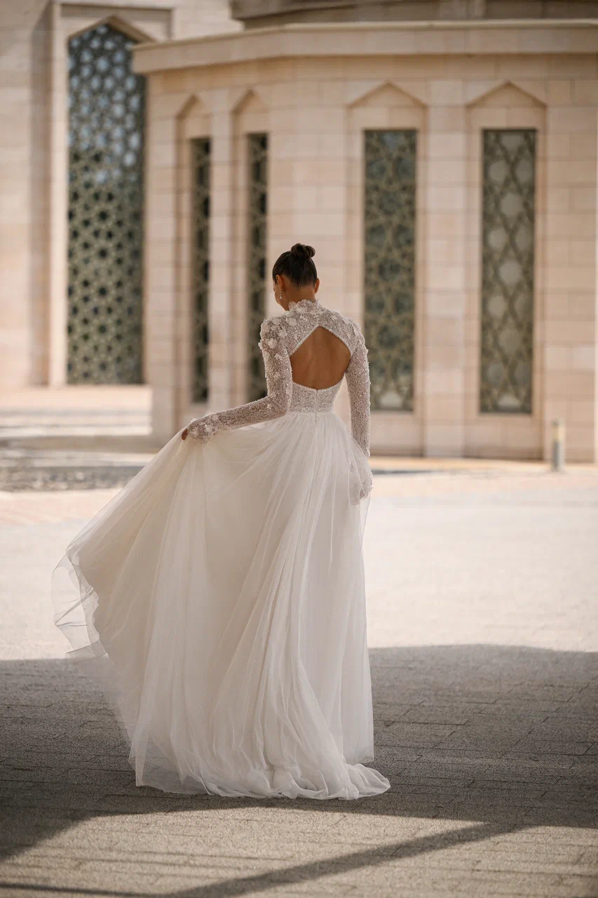 Элегантность, созданная для невесты, которой важно всё — от линии воротника до последнего движения подола. Полупрозрачный верх с высоким горлом рисует настроение королевской утончённости. Цветочные акценты и деликатное кружево превращают лиф в настоящее произведение искусства. А мягкая фатиновая юбка с разрезом — в дыхание свободы, света и женственности.