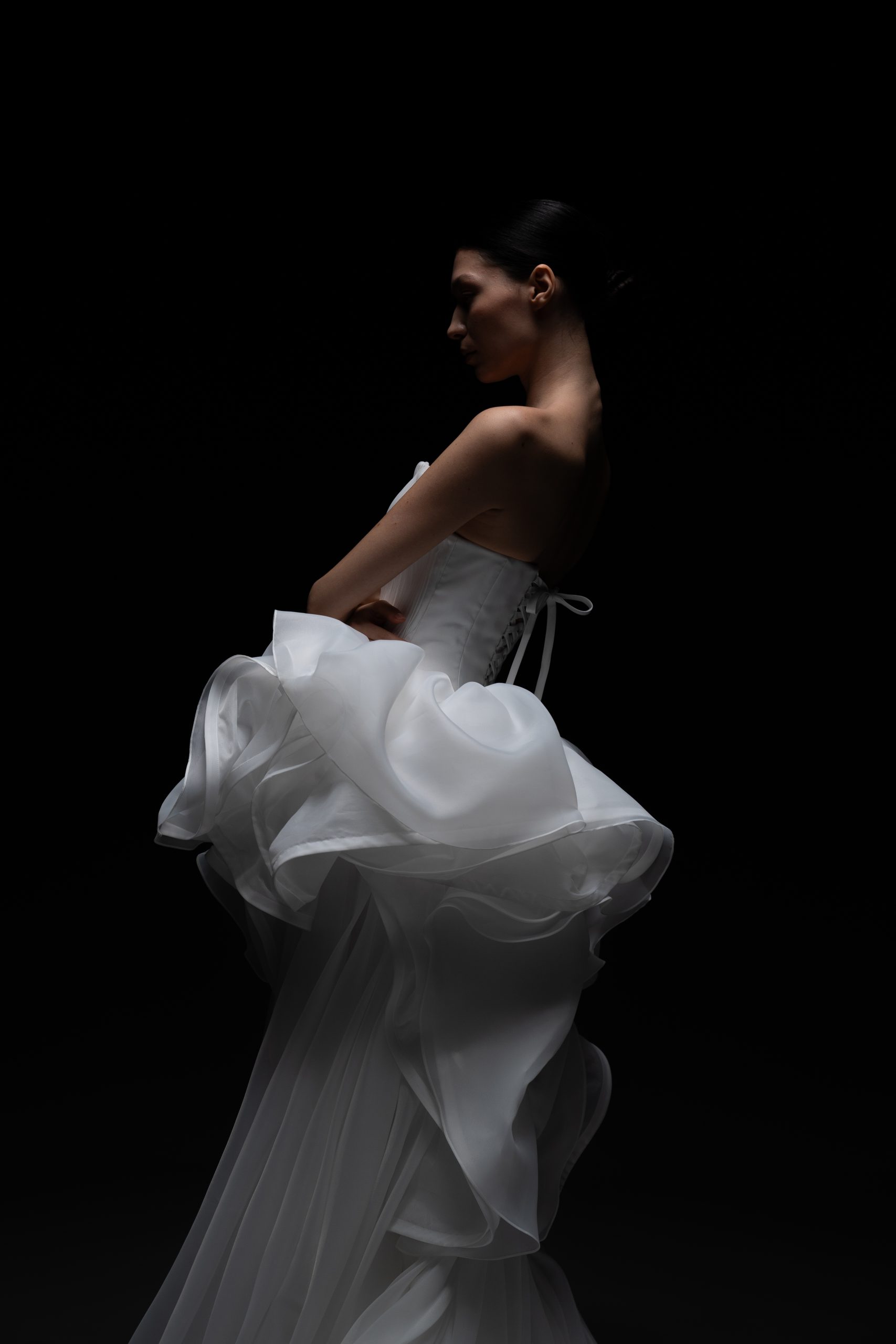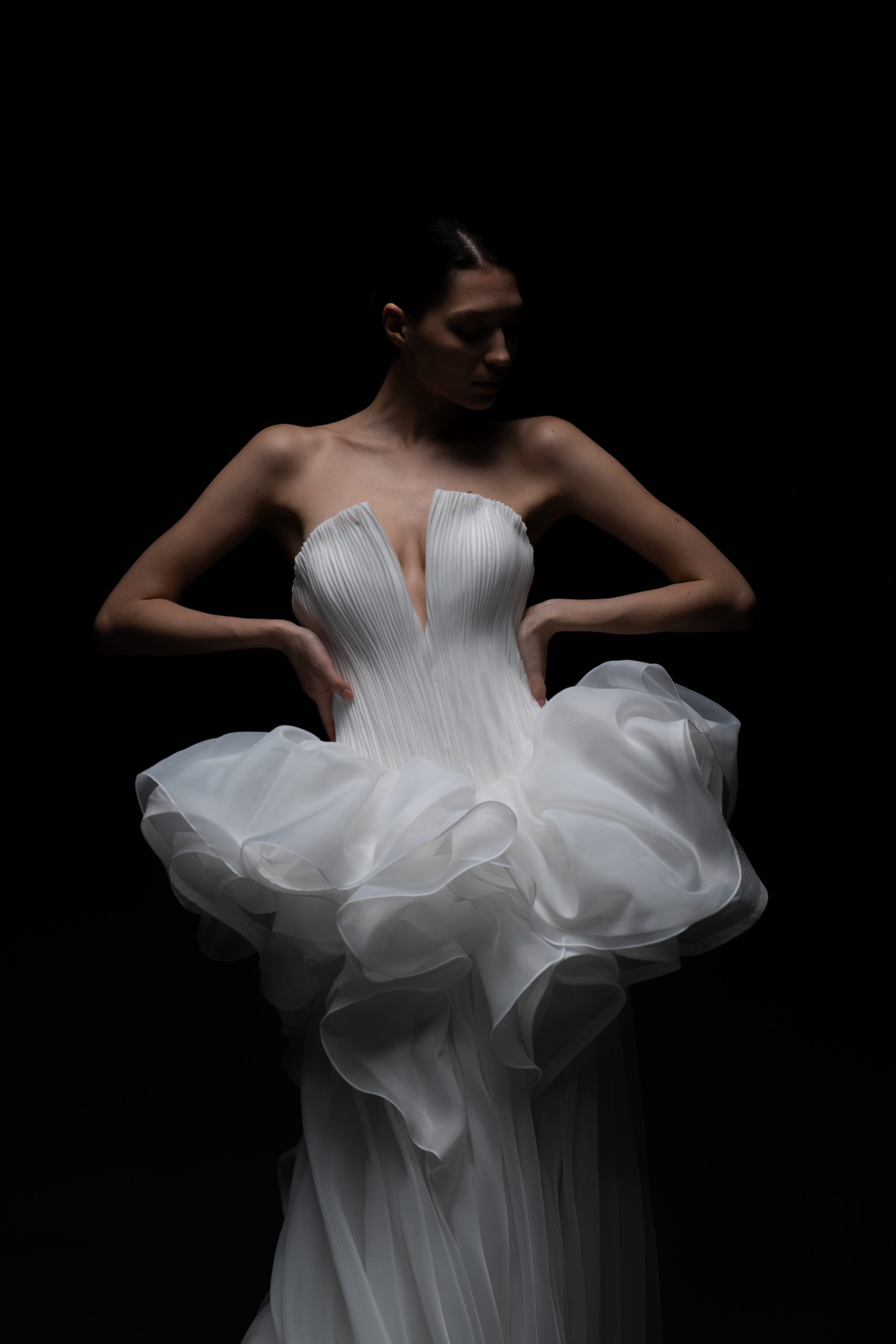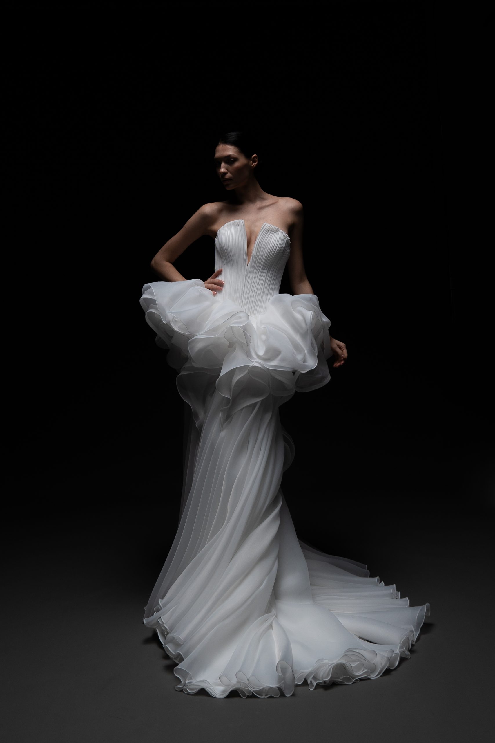 Архитектурное совершенство в белом. Плавные линии, многослойные волны органзы и чистый минимализм делают платье воплощением современной высокой моды.