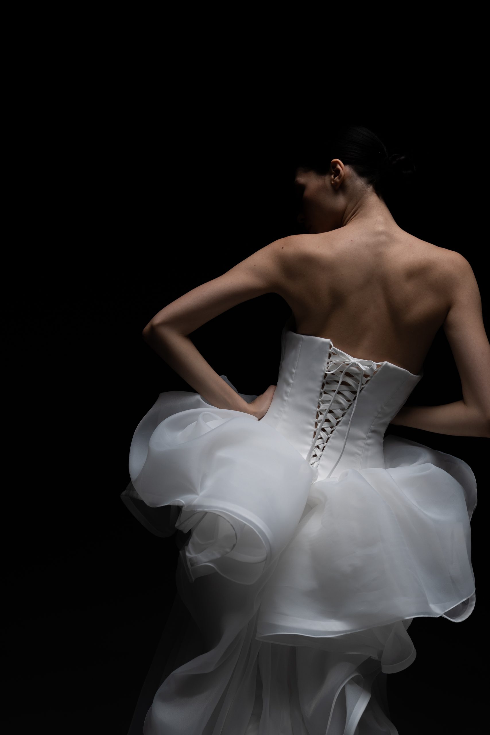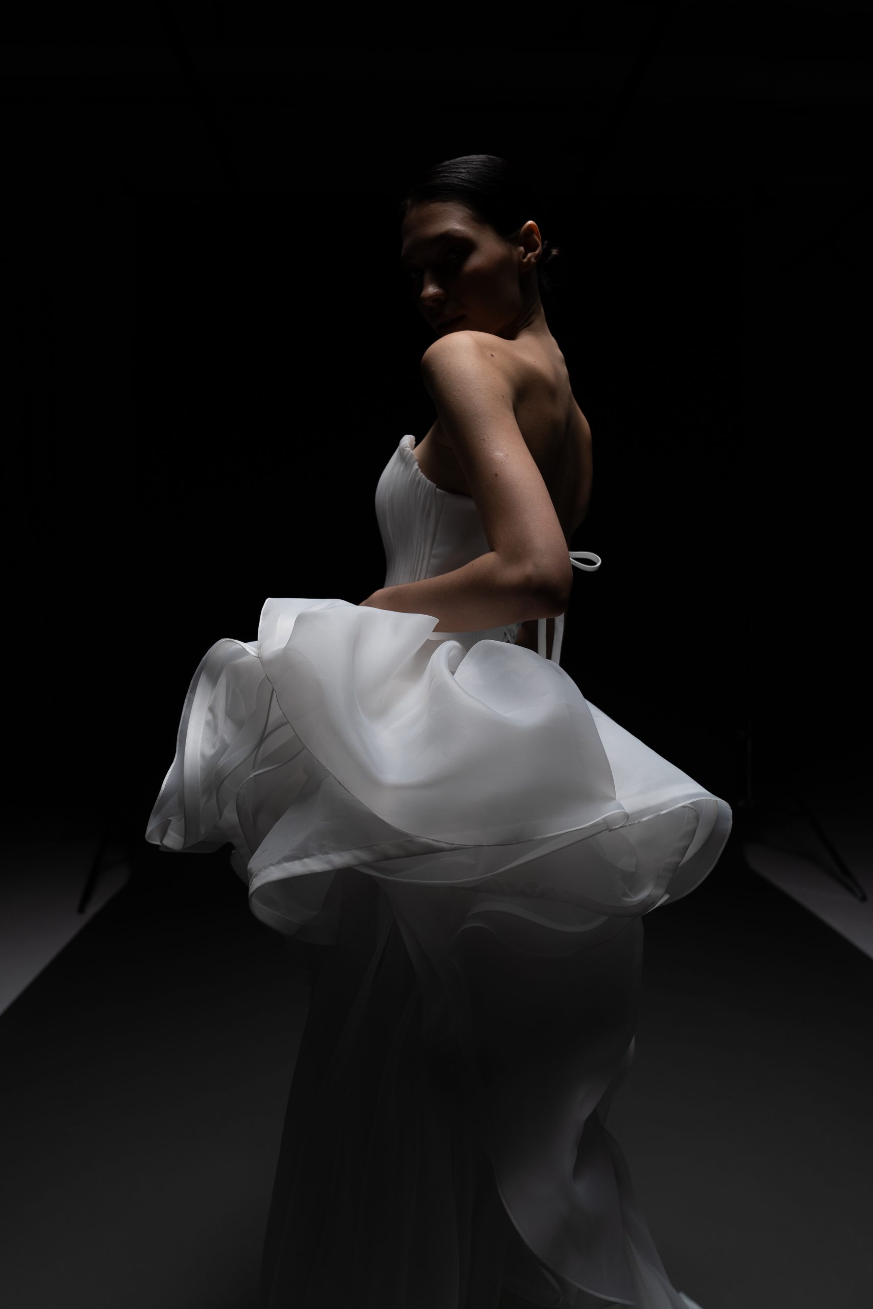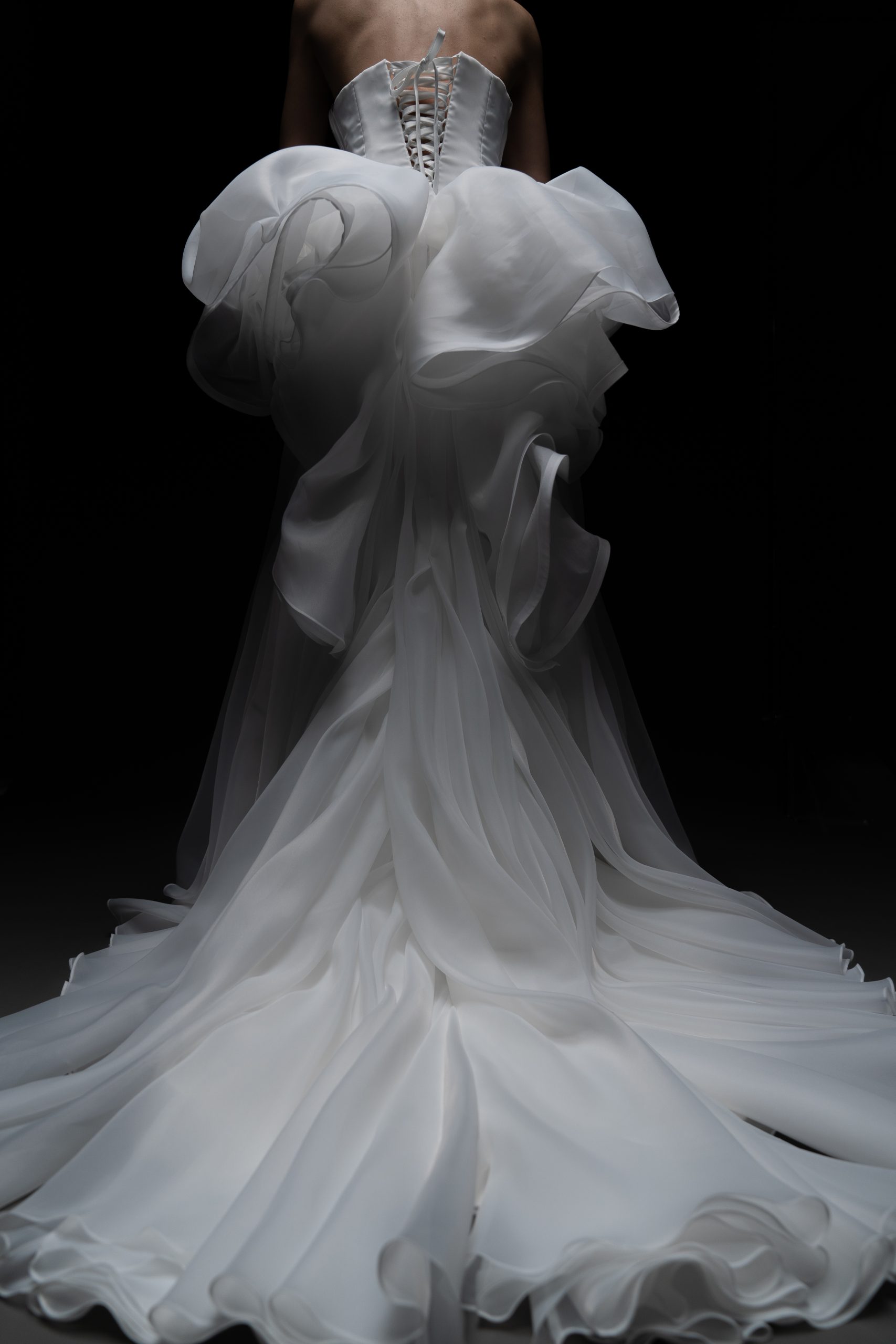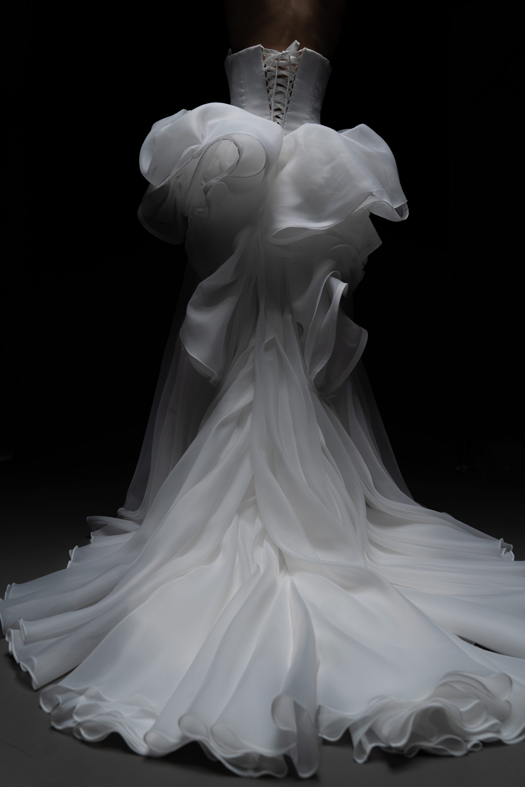 Архитектурное совершенство в белом. Плавные линии, многослойные волны органзы и чистый минимализм делают платье воплощением современной высокой моды.