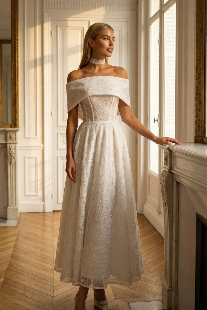Платье, в котором ты словно с обложки свадебного глянца. Целиком из мерцающего кружева, с выразительным декольте, длинными перчатками и высоким воротничком — этот образ одновременно роскошный и изящно провокационный.