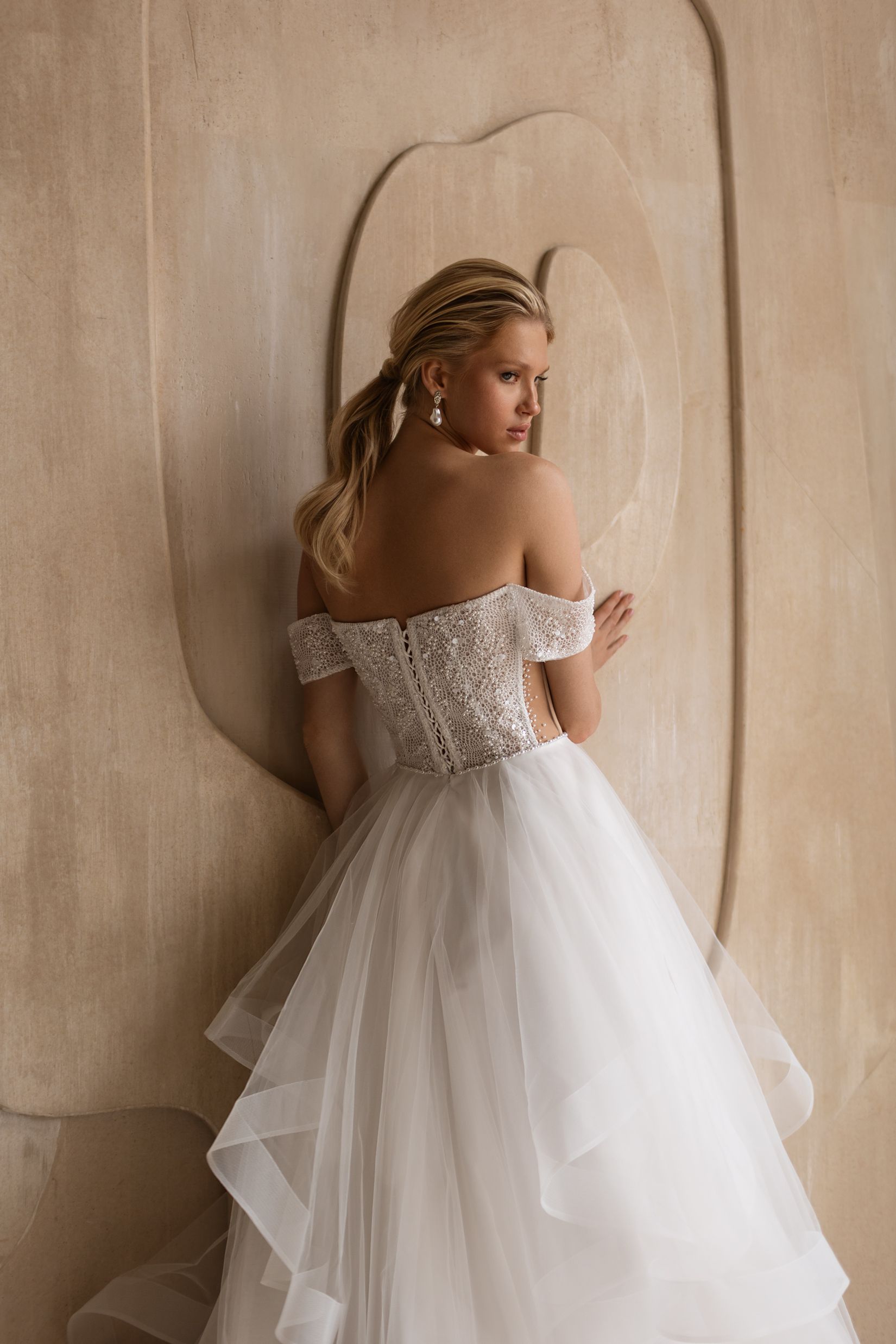 Платье, в котором хочется кружиться бесконечно. Сияющий корсет с деликатными вставками, спущенные рукава и многослойная юбка из фатина, которая движется, как облако. Это платье про мечту, которую ты носишь не внутри — а на себе. Про ту самую девочку, которая верила в сказку — и стала её главной героиней. Для невесты, которой важны и драматичность, и лёгкость.