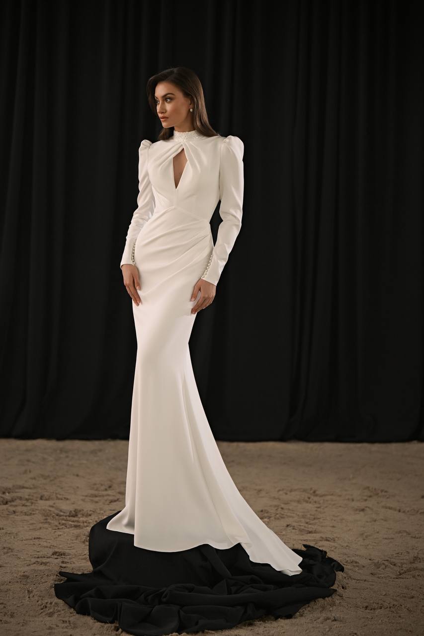 Элегантность, в которой чувствуется сила. Формованный лиф с вырезом, длинные рукава и акцент на линии плеч создают безупречный силуэт. Драпировка по талии и мягкое мерцание ткани добавляют женственности и движения.