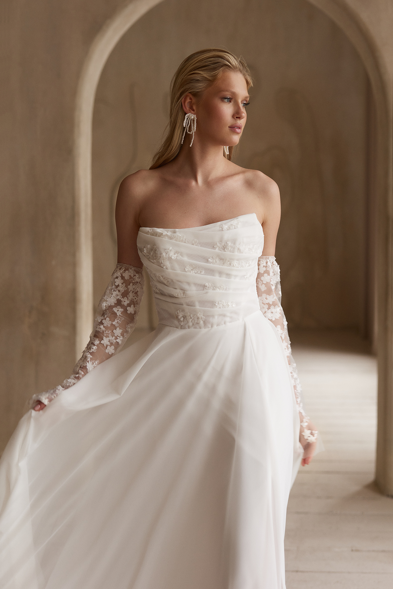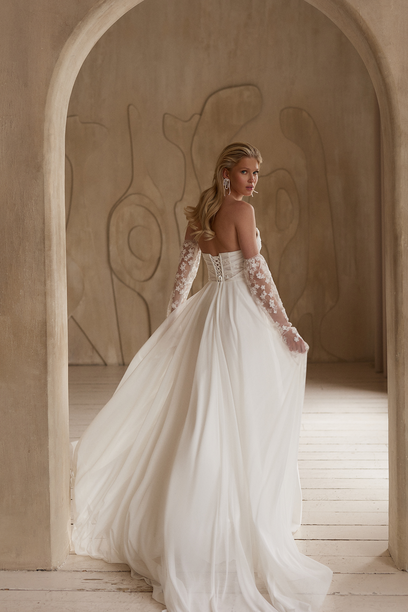 Образ, в котором каждая деталь говорит о вкусе. Чистый корсетный верх с ручной вышивкой создаёт современный силуэт, а полупрозрачные кружевные рукава добавляют мягкой романтики. Юбка струится за тобой лёгкой волной — и каждый шаг в ней как кадр из красивого фильма. Для невесты, которая ценит утончённость и мечтает о платье вне времени.