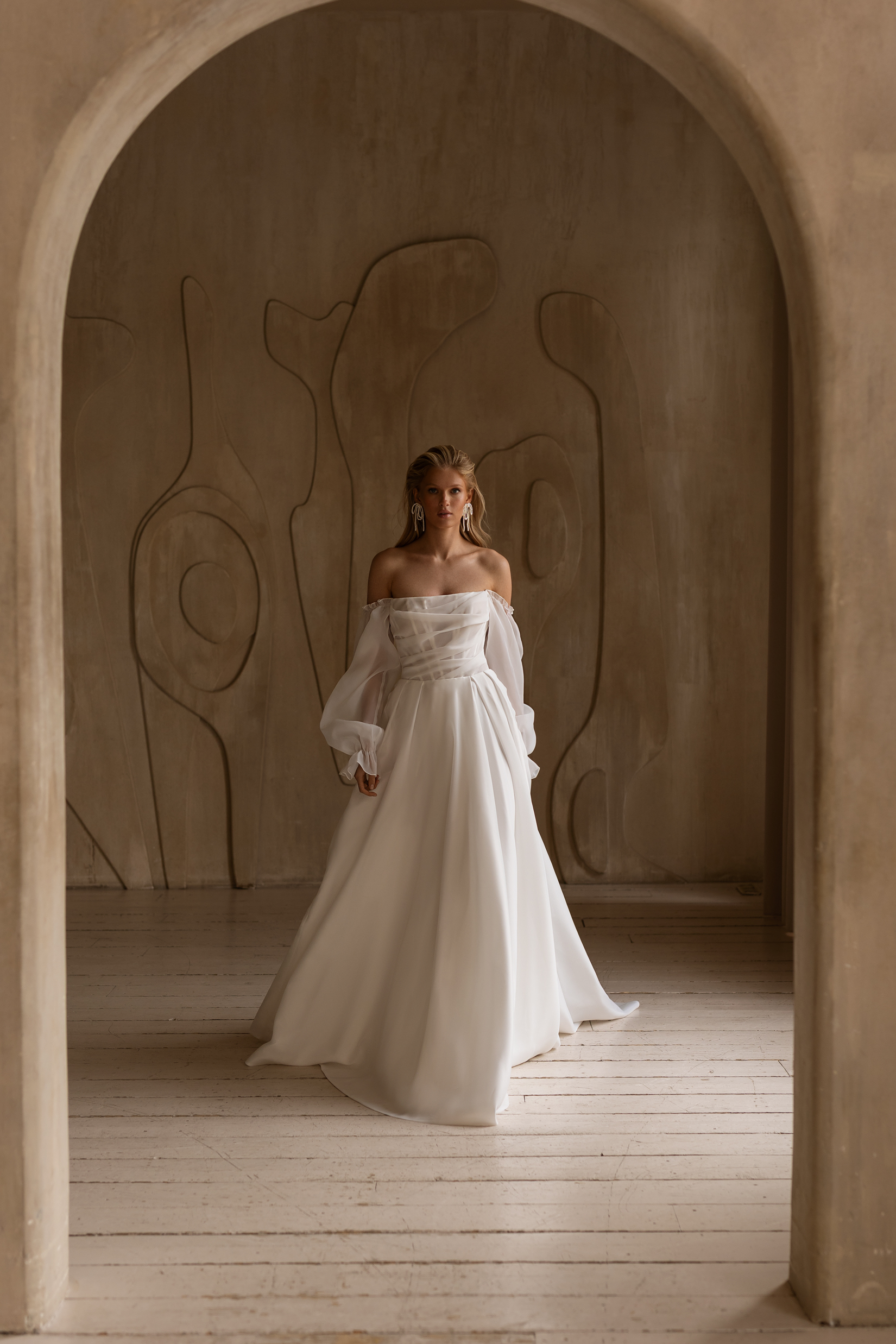Моника — это платье с характером. Объёмные рукава из органзы, чистый корсет с драпировкой и выразительный разрез делают образ дерзким, но при этом невероятно женственным. Оно не требует украшений — в нём уже есть всё: форма, движение, воздух. Для невесты, которая выбирает лёгкость и стиль — и делает это уверенно.