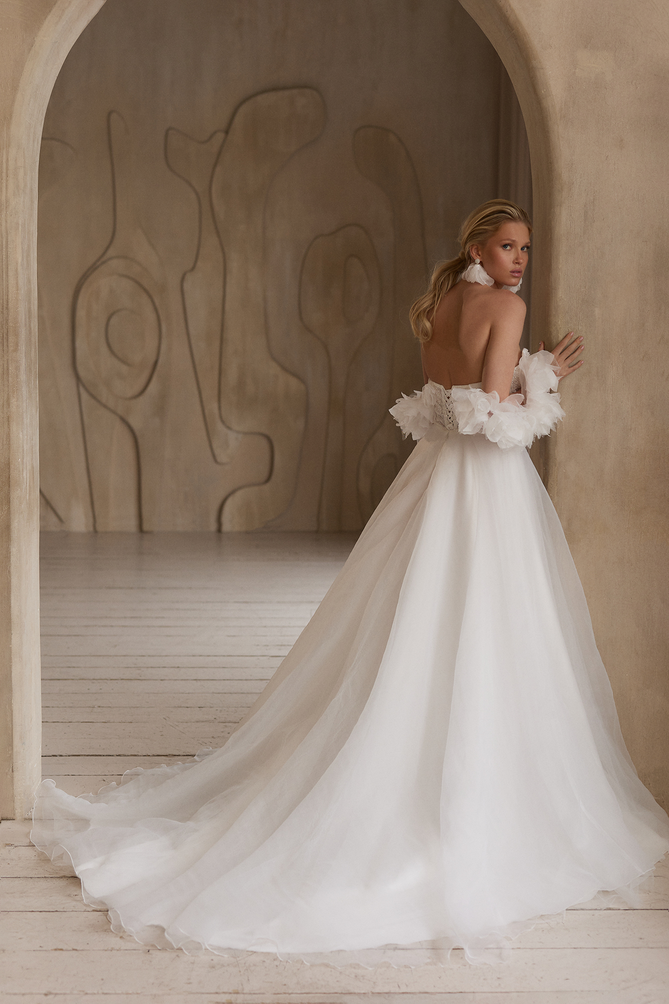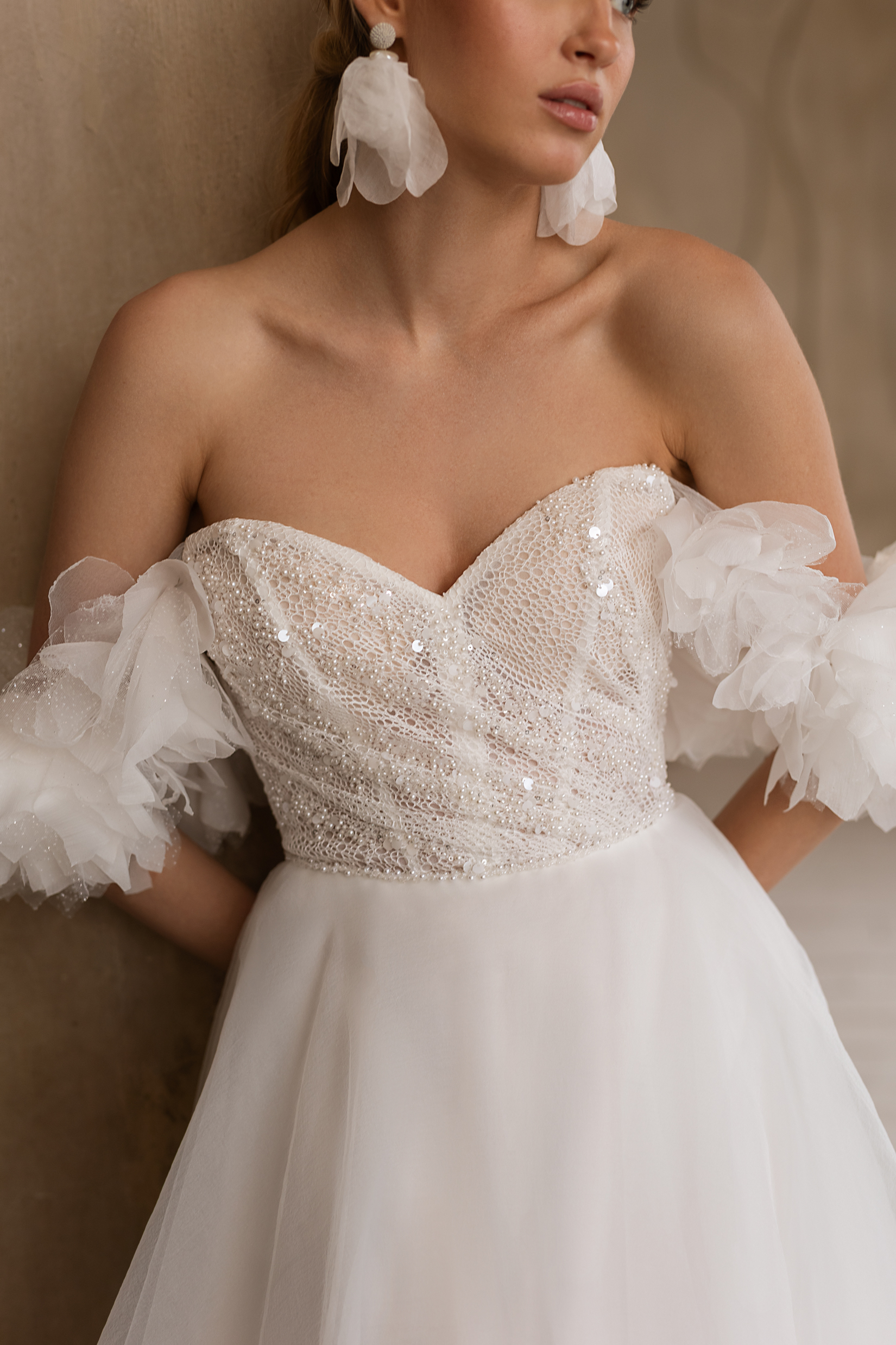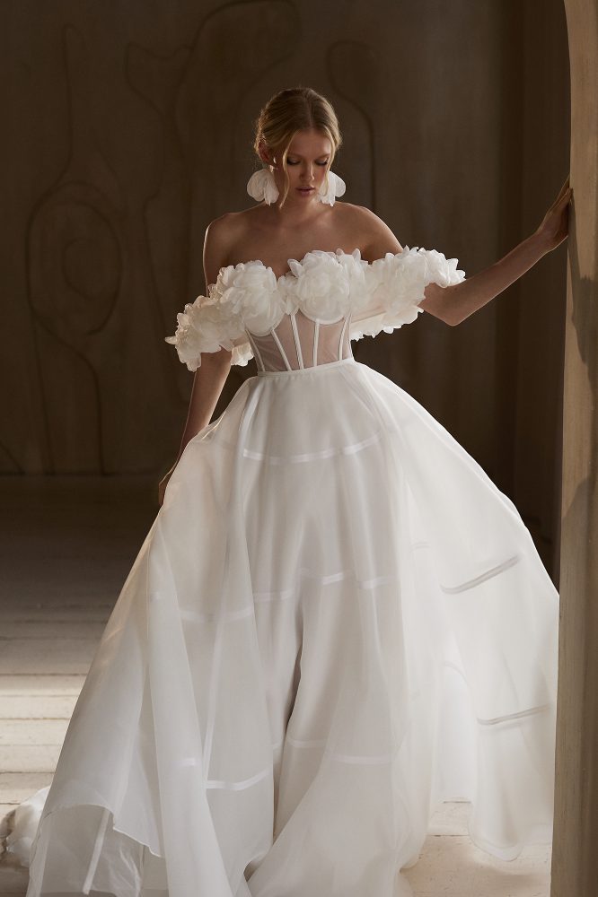 Платье, в котором всё про лёгкость и трепет. Корсет с нежной вышивкой подчёркивает линию декольте, а спущенные плечи будто сотканы из утреннего тумана. Юбка летит за тобой мягкой вуалью, создавая ощущение сказки — той самой, где ты главная героиня.