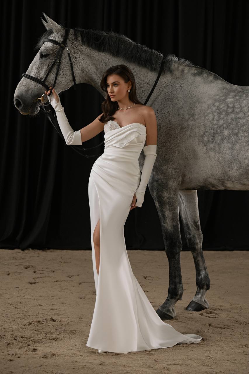 Платье, в котором соблазн становится искусством. Драпированный лиф подчёркивает линию плеч, а кружевная вставка добавляет нежности и глубины образу. Разрез делает шаг лёгким и уверенным, будто сама ткань движется вслед за тобой.