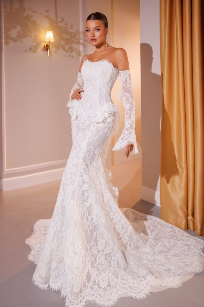 Кружевной соблазн с ноткой винтажного шика. Облегающий силуэт подчеркивает фигуру, а корсет с открытыми плечами и акцентными косточками создаёт вау-лиф, будто сотканный из лепестков. Кружевные перчатки — финальный штрих, который превращает образ в настоящее искусство. Для невест, которые хотят быть утончённой классикой, но с характером.