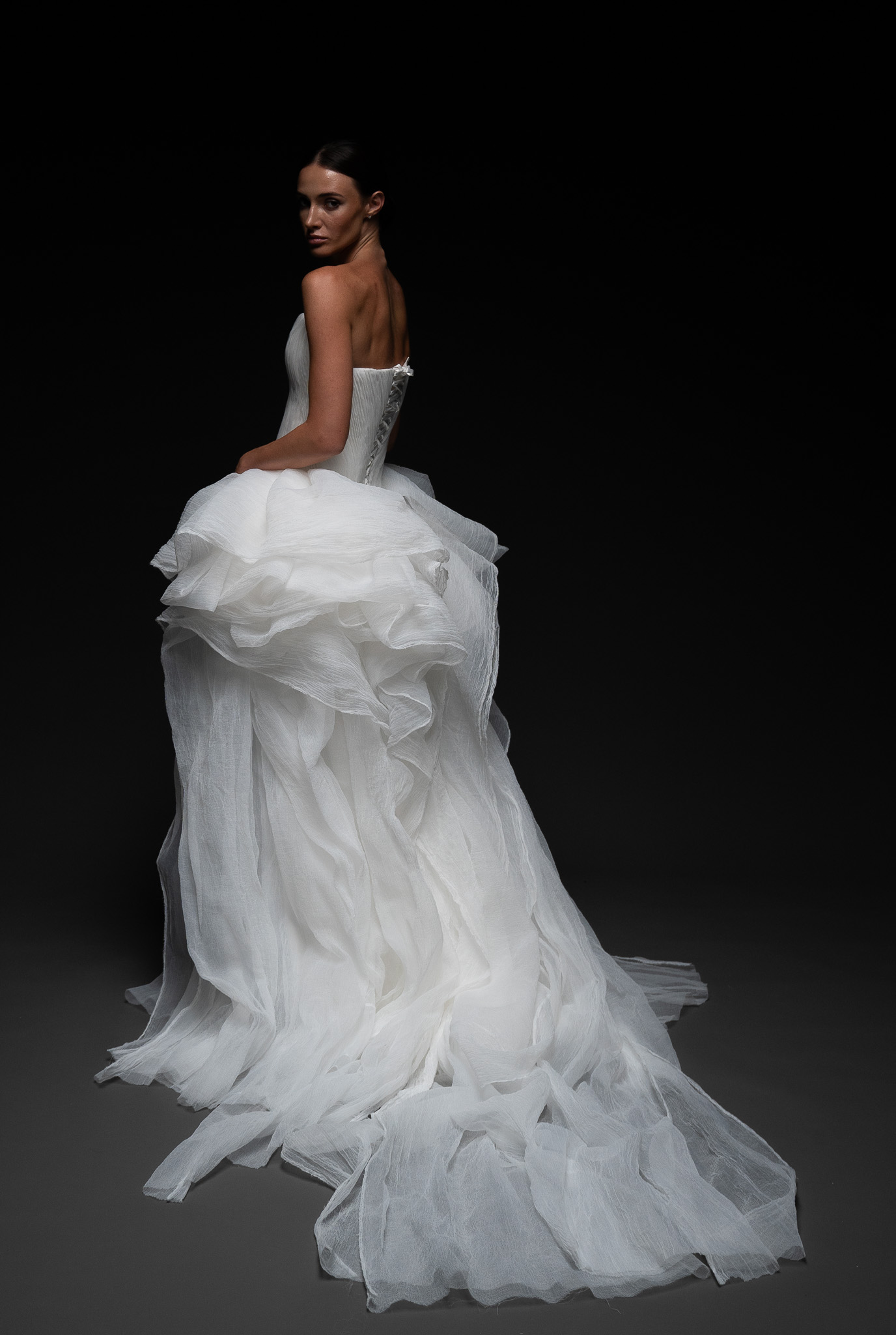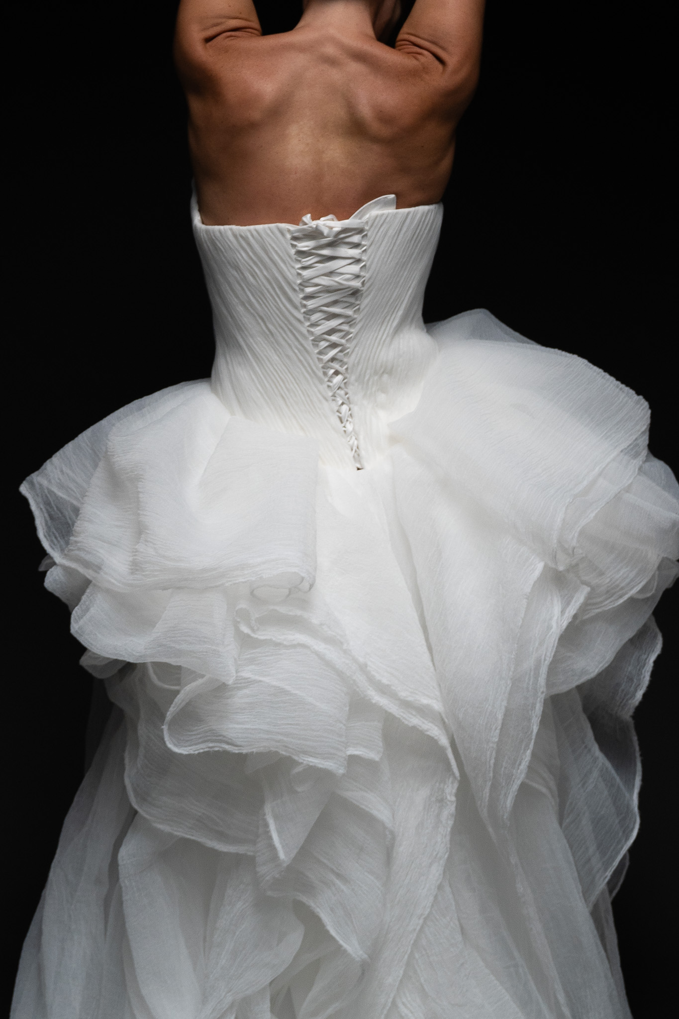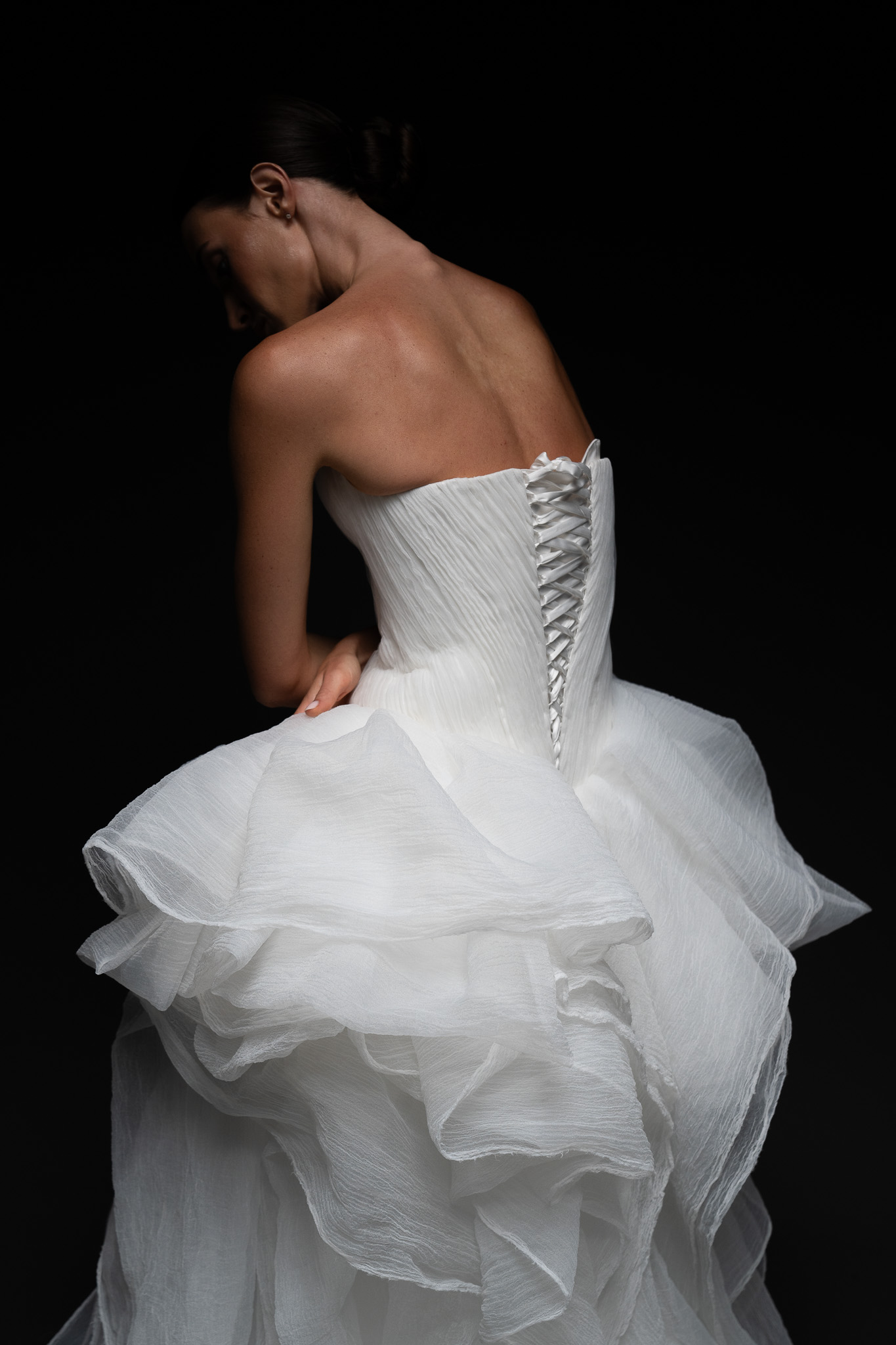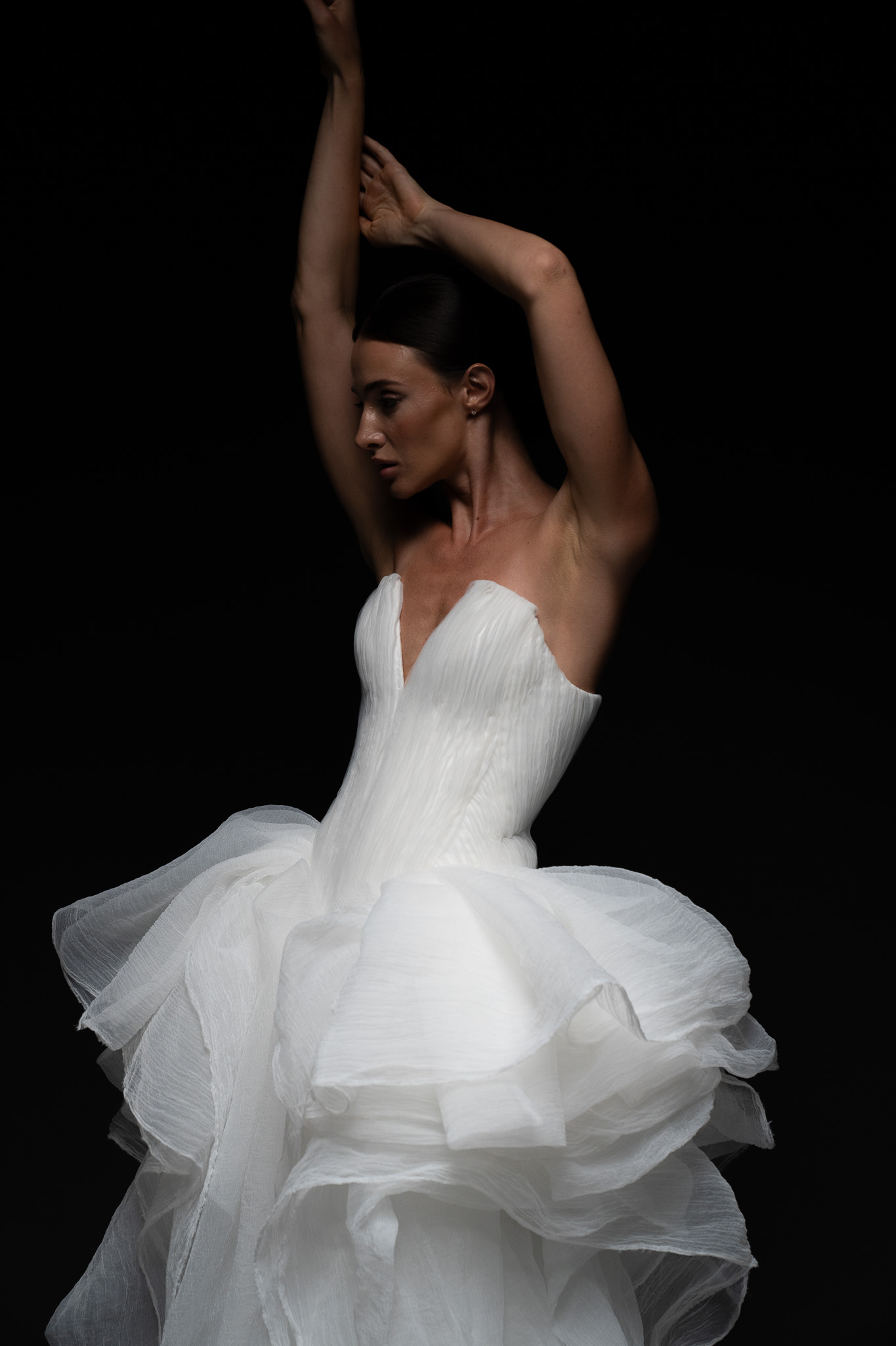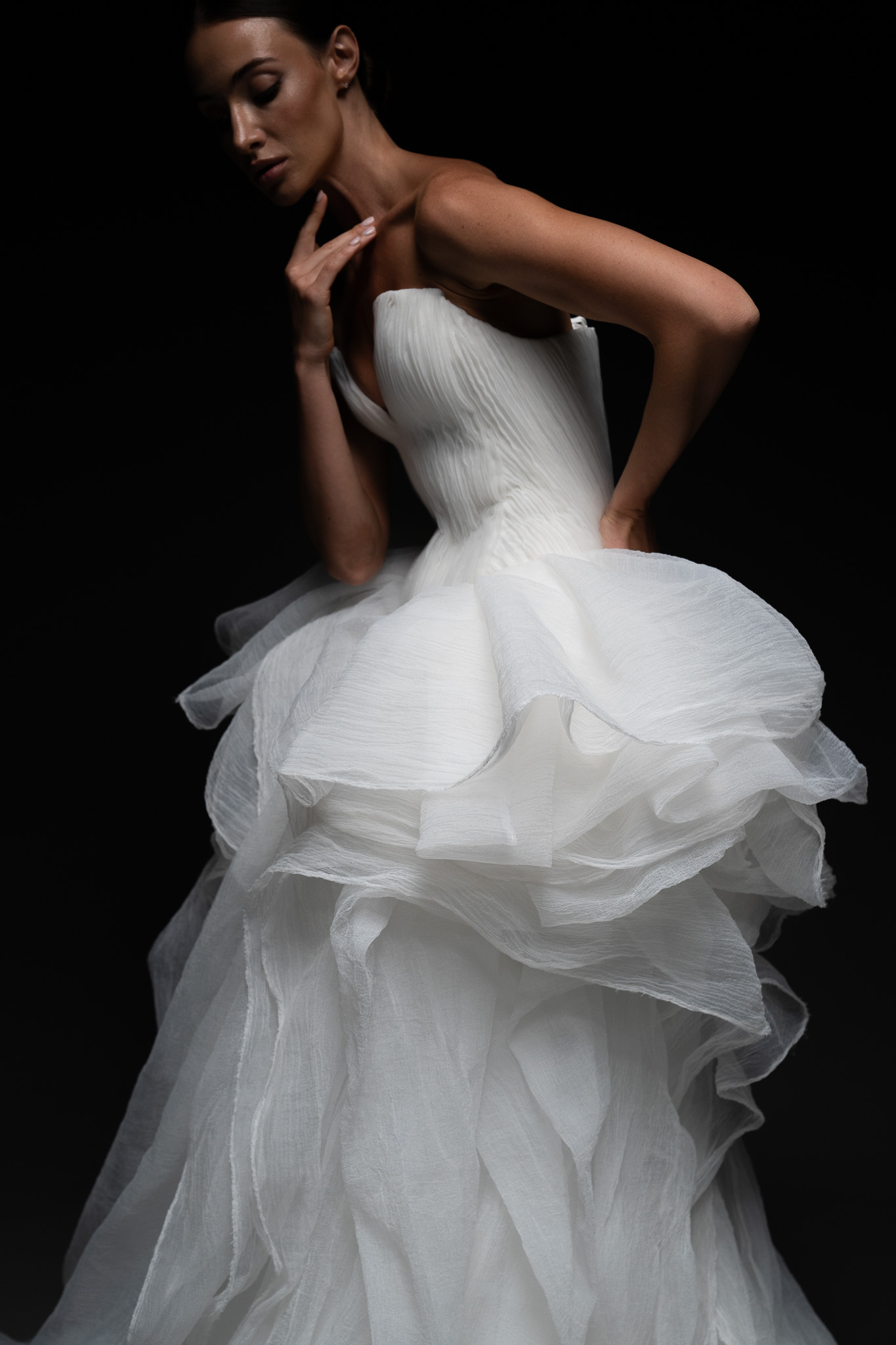 Когда платье — это искусство, воплощение пластики, драмы и лёгкости. Не просто подчёркивает фигуру, а создаёт настроение. Оно словно создано скульптором: фактурные драпировки из органзы, идеальные линии, архитектурная посадка. Линия декольте спадает с плеч, открывая изящную шею и ключицы. Спинка — с утончённой шнуровкой и мягкими складками, которые ниспадают в лёгкий шлейф.