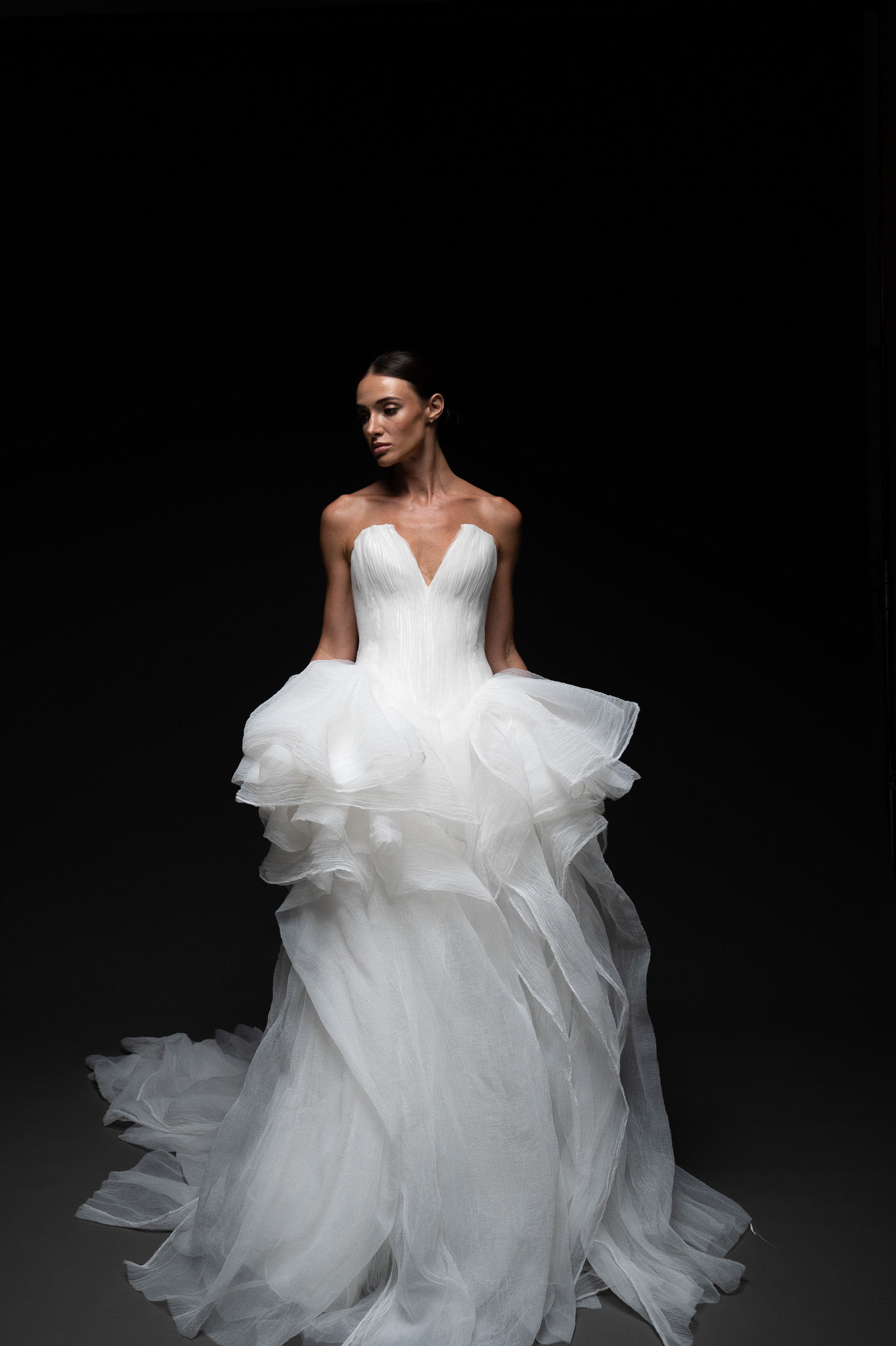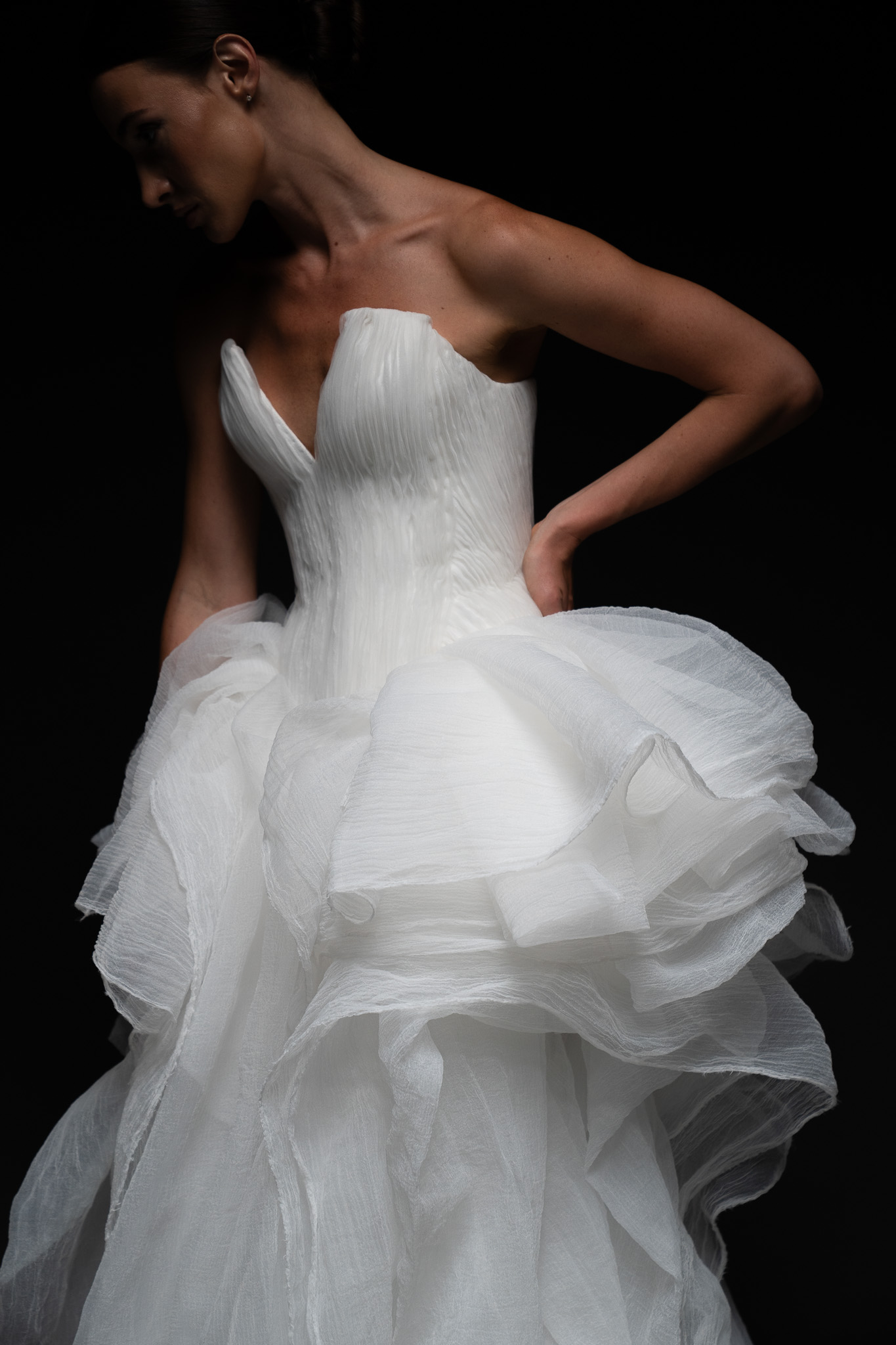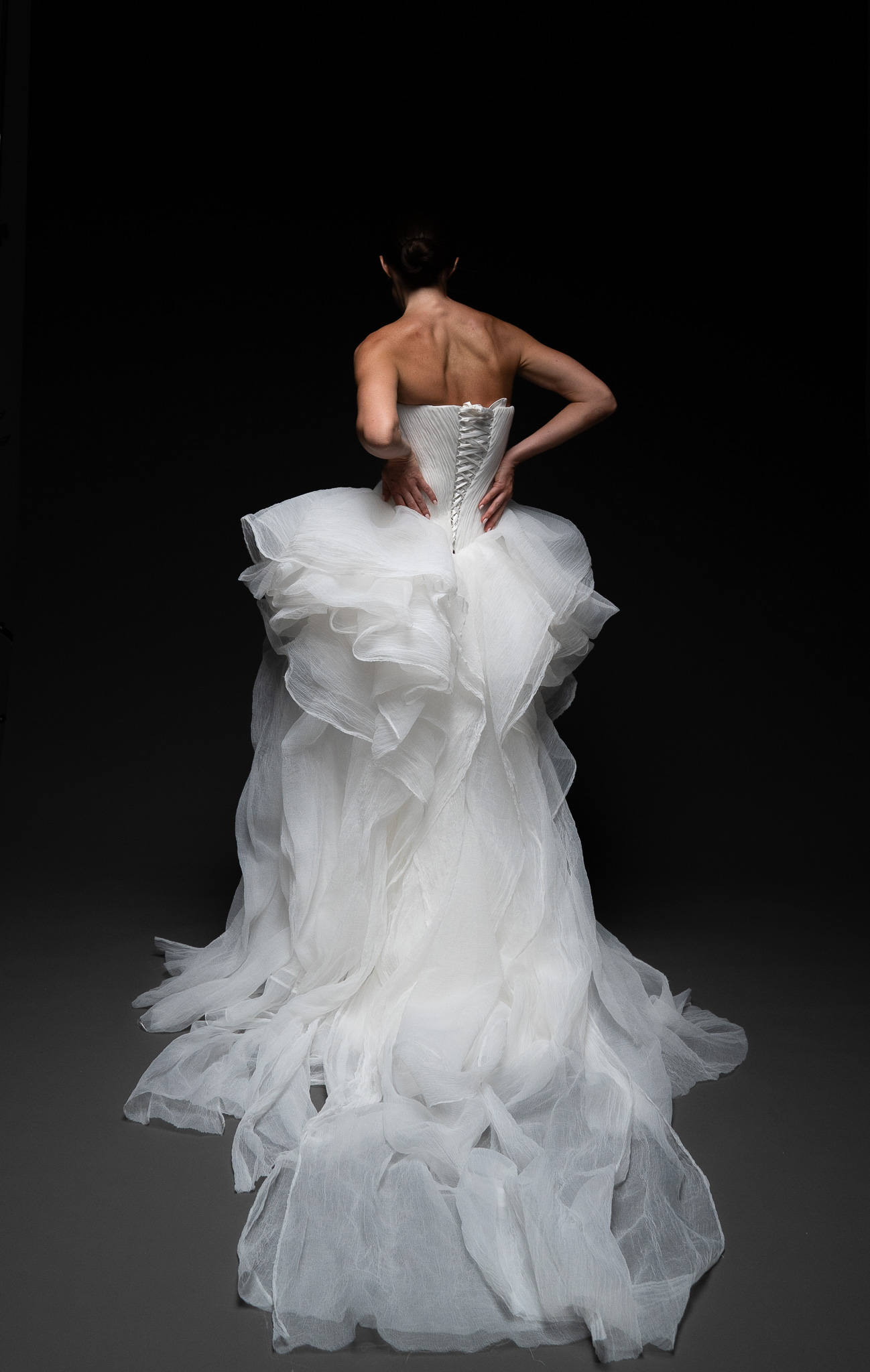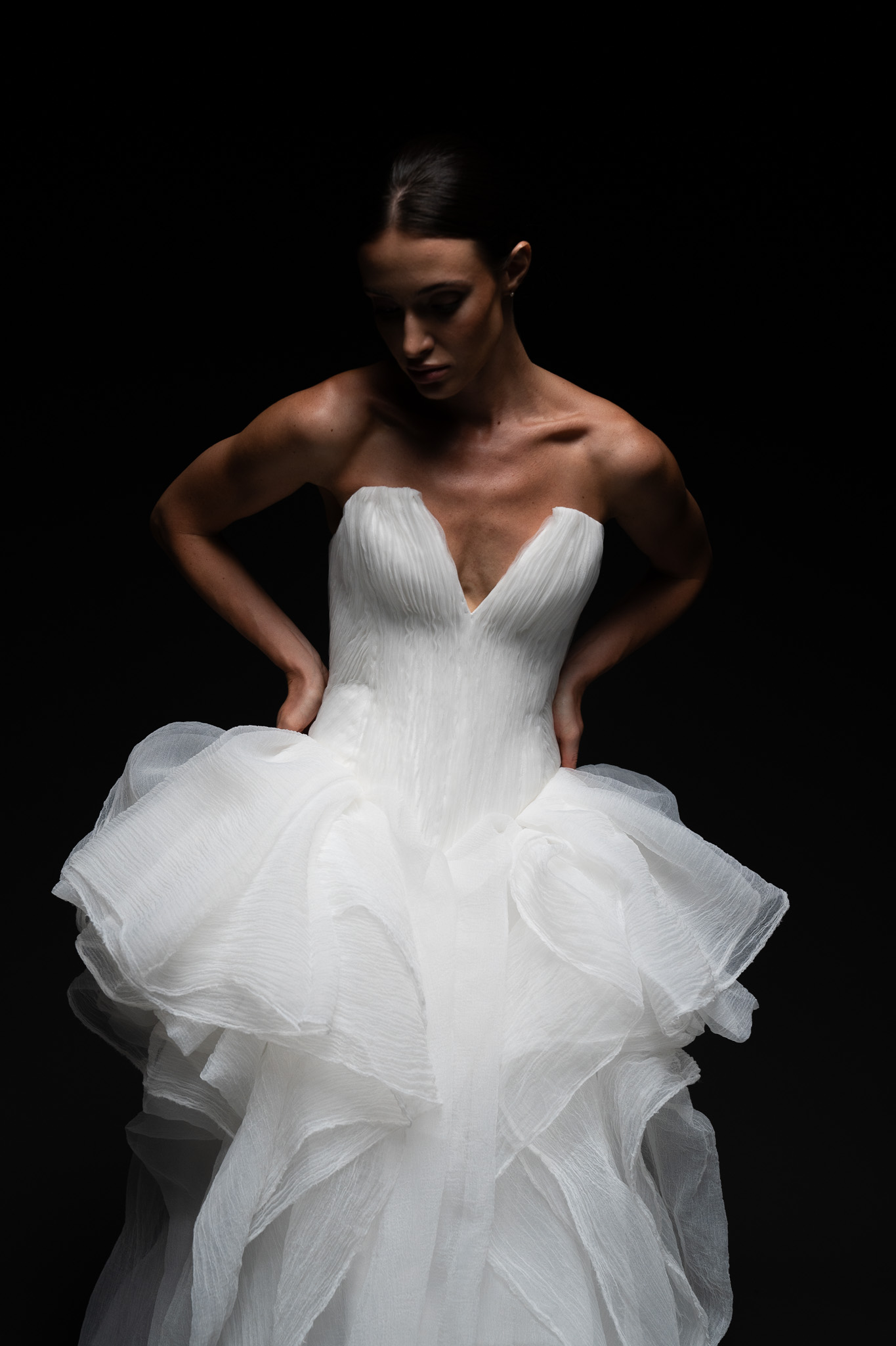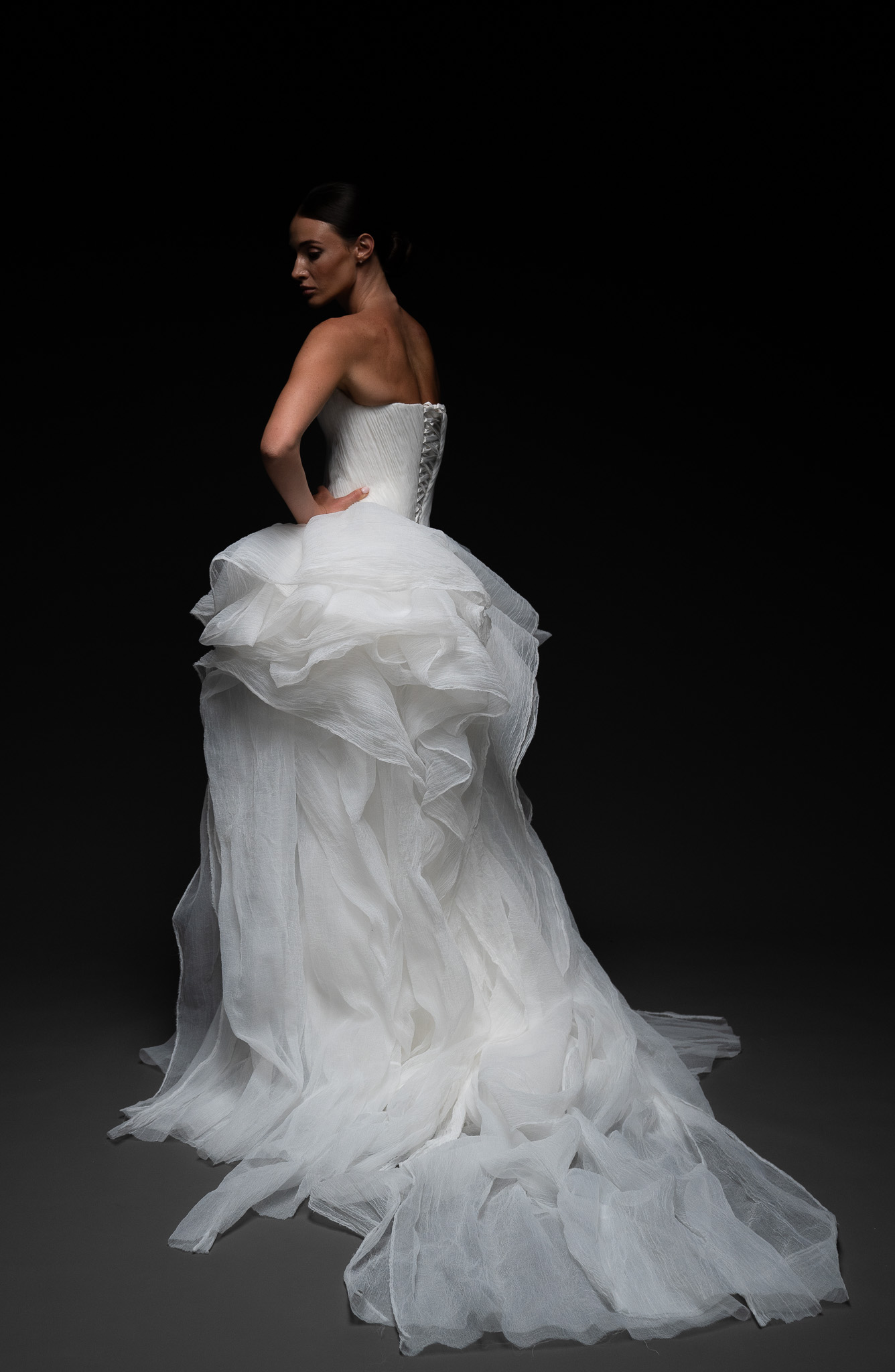 Когда платье — это искусство, воплощение пластики, драмы и лёгкости. Не просто подчёркивает фигуру, а создаёт настроение. Оно словно создано скульптором: фактурные драпировки из органзы, идеальные линии, архитектурная посадка. Линия декольте спадает с плеч, открывая изящную шею и ключицы. Спинка — с утончённой шнуровкой и мягкими складками, которые ниспадают в лёгкий шлейф.