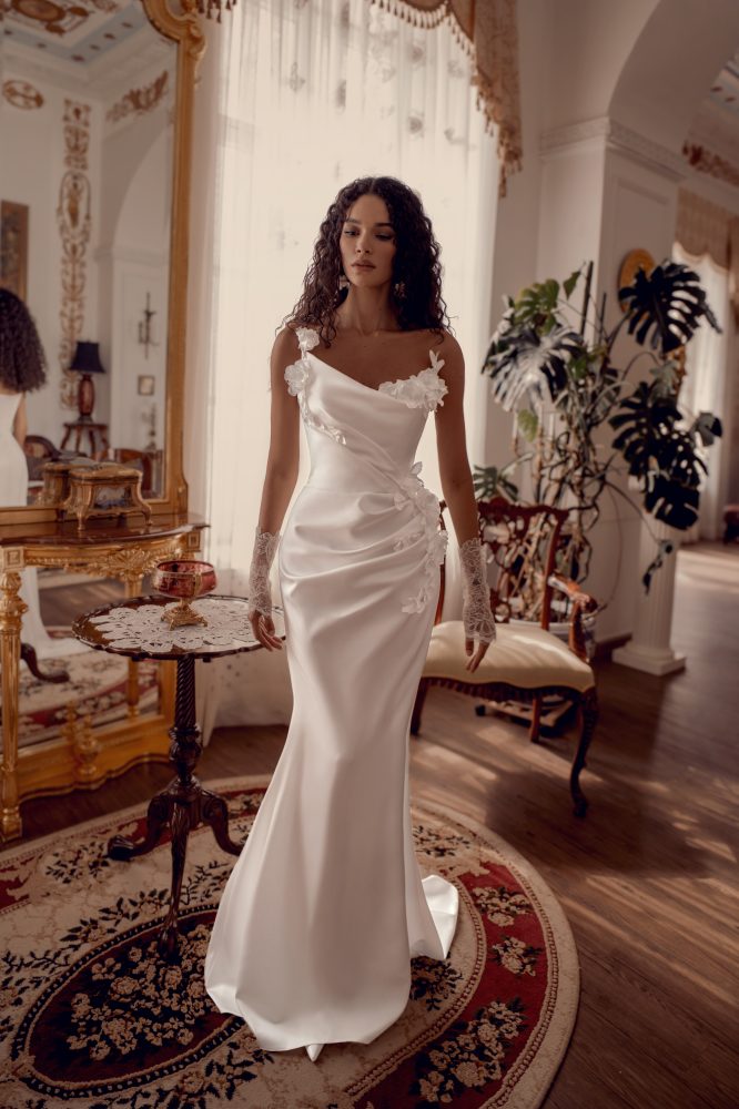 Платье с блеском, который невозможно забыть. Облегающий силуэт, лиф с драпировкой, тонкие бретели и высокий разрез создают образ, в котором идеально сочетаются элегантность и дерзость. Мягкое сияние ткани красиво играет при свете, подчёркивая каждое движение. Идеально подойдёт для вечерней церемонии или свадьбы в стиле old money glamour.