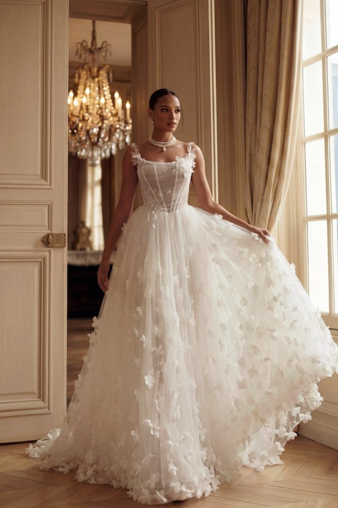 Когда нежность становится силой. Воздушный силуэт, который будто растворяется в свете, и корсет, мягко собирающий фигуру в идеальную линию. Легкие цветочные акценты добавляют образу живости, а мерцающий фатин создает то самое деликатное сияние при каждом движении.