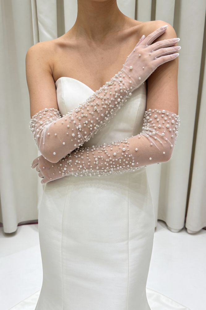 Полупрозрачные перчатки с цветочным кружевом мягко обрамляют руки, создавая ощущение лёгкости и утончённой женственности. Объёмная вышивка добавляет фактуру и глубину, а тонкая сетка почти сливается с кожей, оставляя эффект «второй кожи».