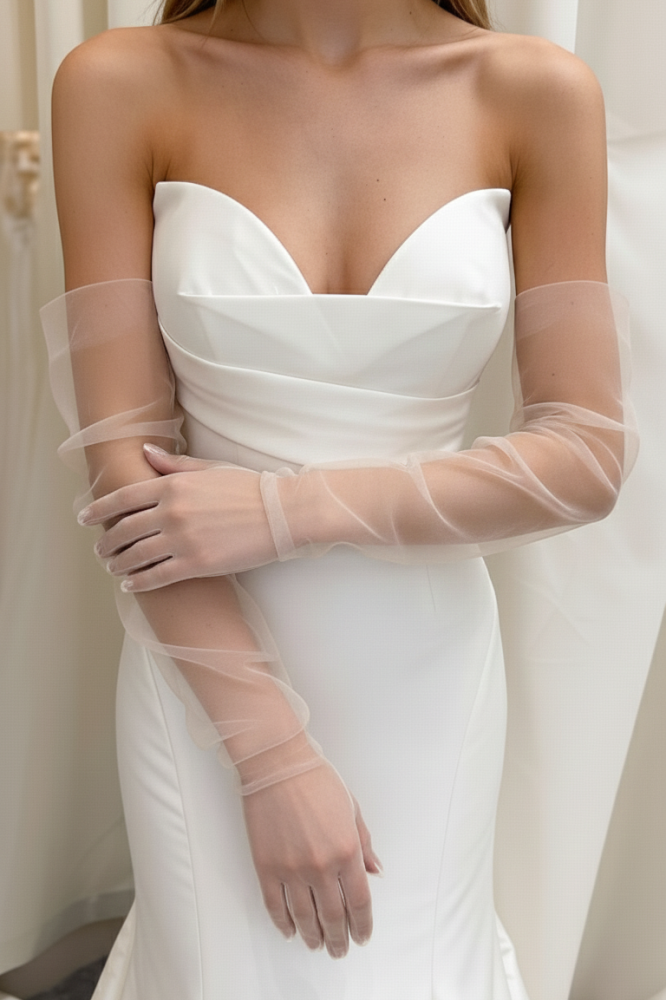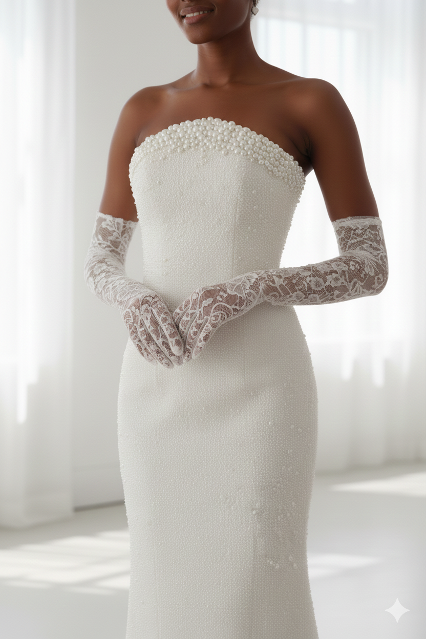 Ажурные перчатки из тонкого кружева мягко дополняют образ, добавляя ему утончённости и завершённости. Полупрозрачная фактура красиво подчёркивает линии рук и создаёт ощущение лёгкости без перегруженности деталями.