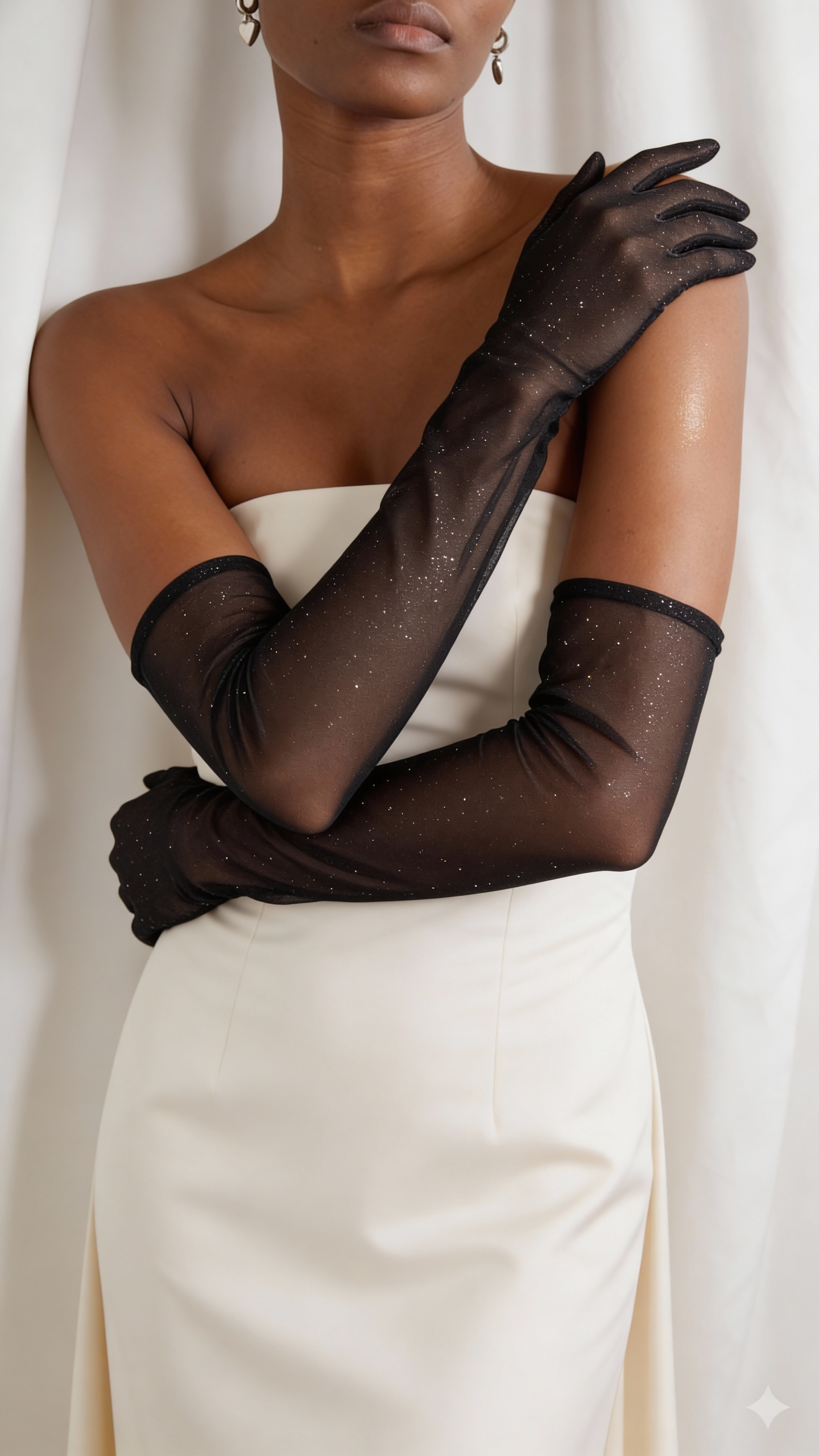 Полупрозрачные чёрные перчатки с деликатным мерцанием создают эффект загадочности и высокой моды. Тонкая сетка мягко облегает руки, а лёгкий блеск красиво ловит свет, добавляя образу глубину и характер. Этот аксессуар сразу делает образ более смелым, выразительным и запоминающимся.
