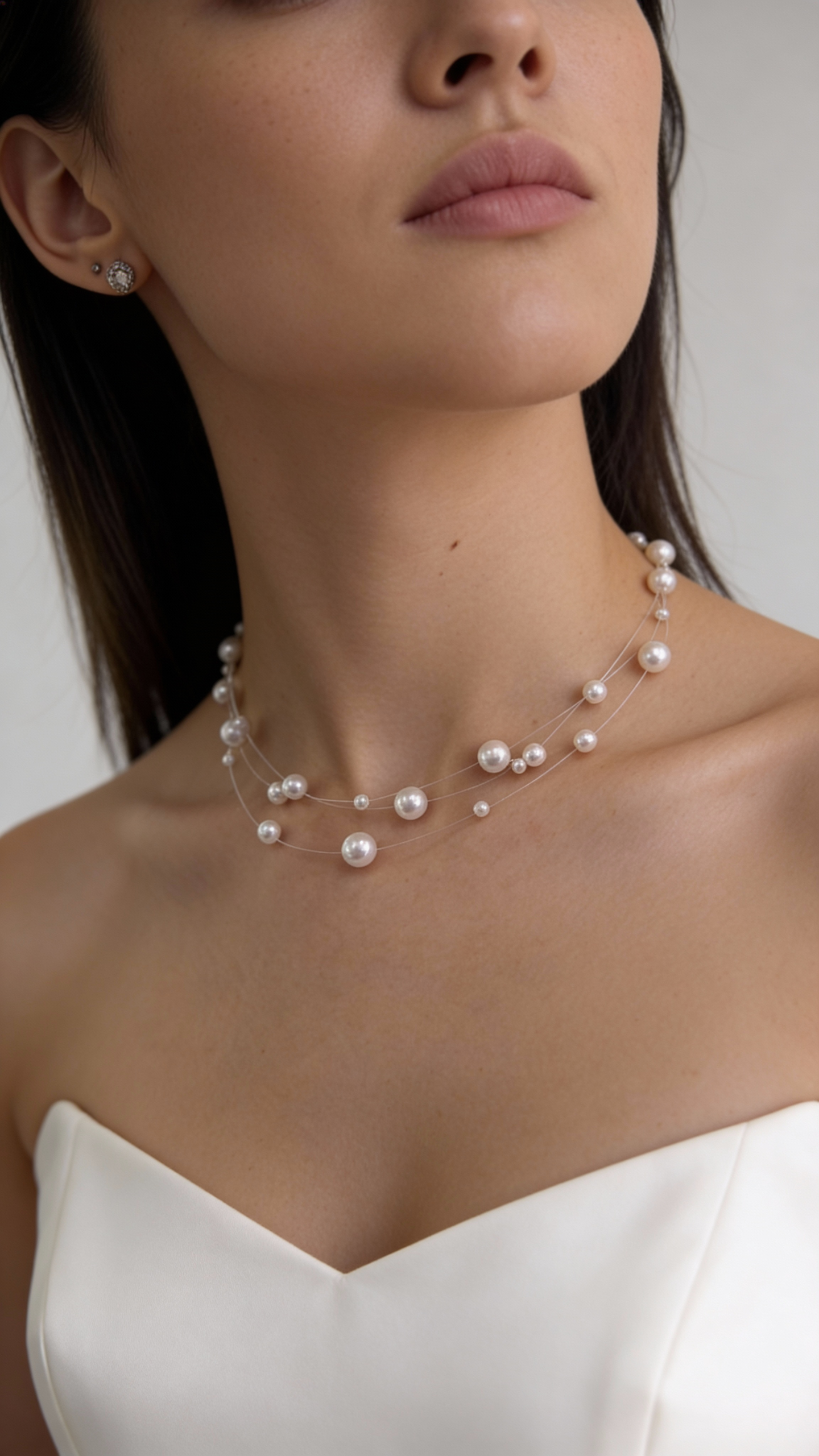 Оно мягко подчёркивает линию шеи и ключиц, добавляя образу света и утончённости, не отвлекая от главного. Идеальный выбор для невесты, которая ценит чистоту образа, лёгкость и сдержанную элегантность.