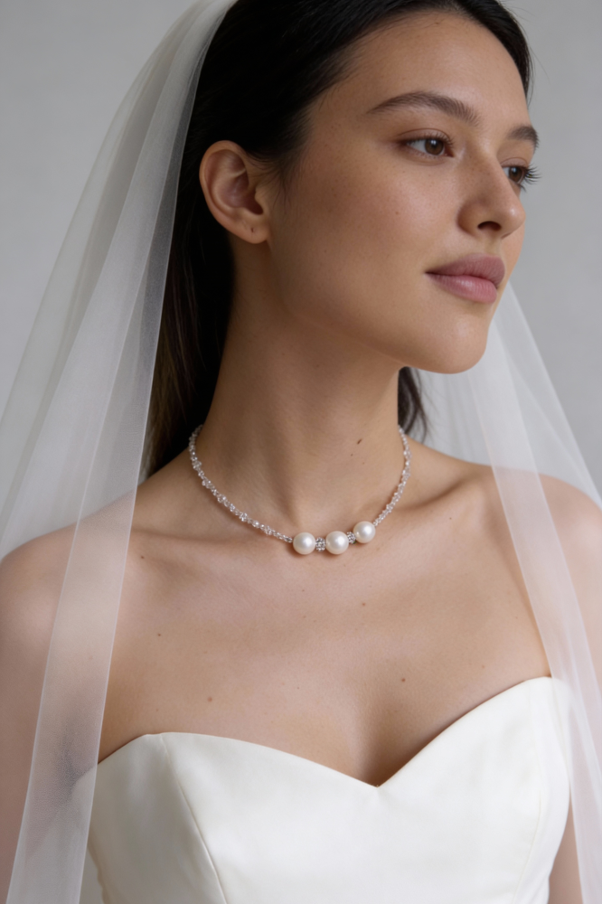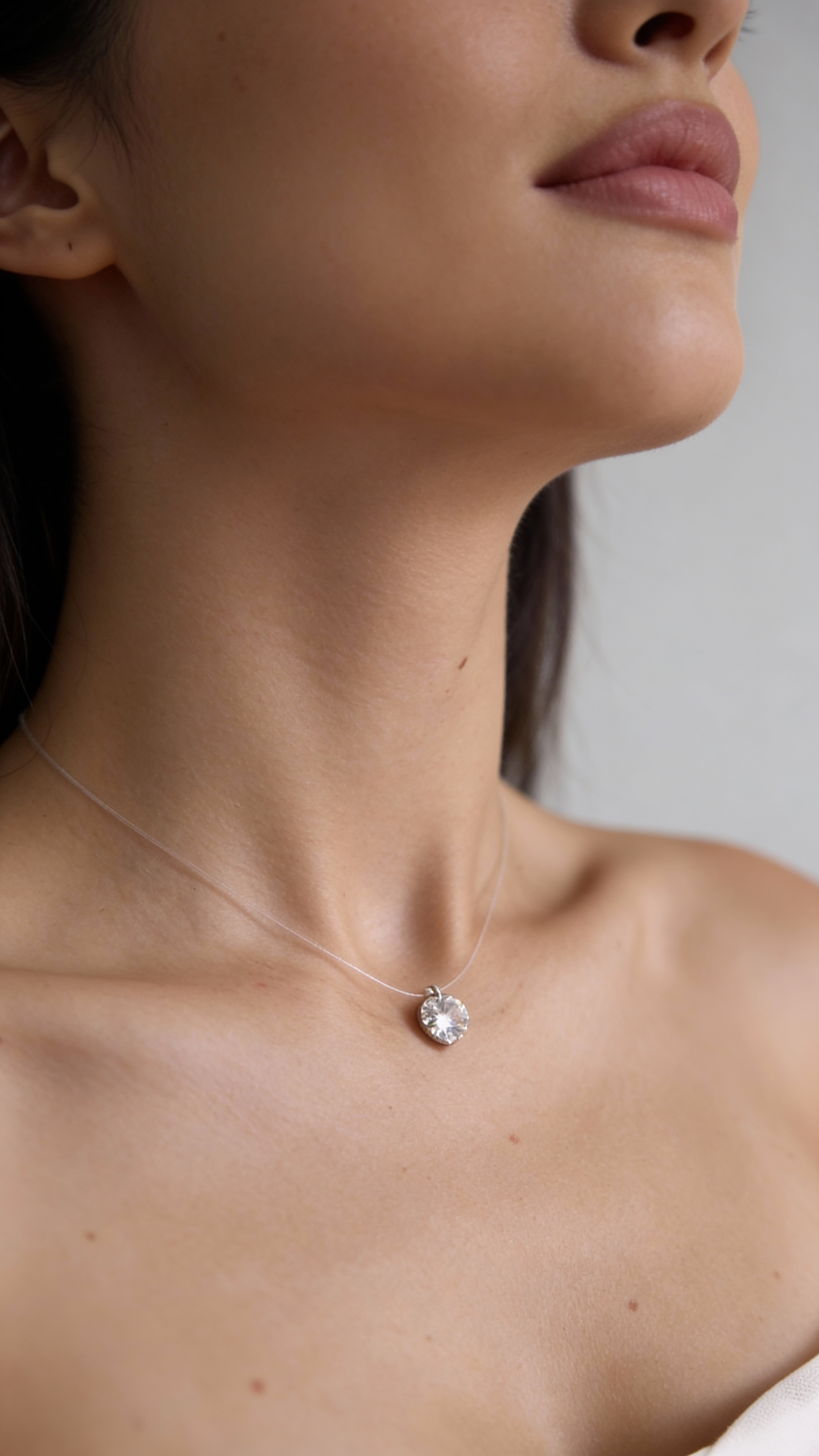 Минимальный акцент, который говорит сам за себя. Прозрачный кристалл на тонкой нити мягко ловит свет и подчёркивает линию шеи, создавая ощущение невесомости. Украшение почти незаметно, но именно оно собирает образ — добавляет ему света, тишины и утончённой завершённости.