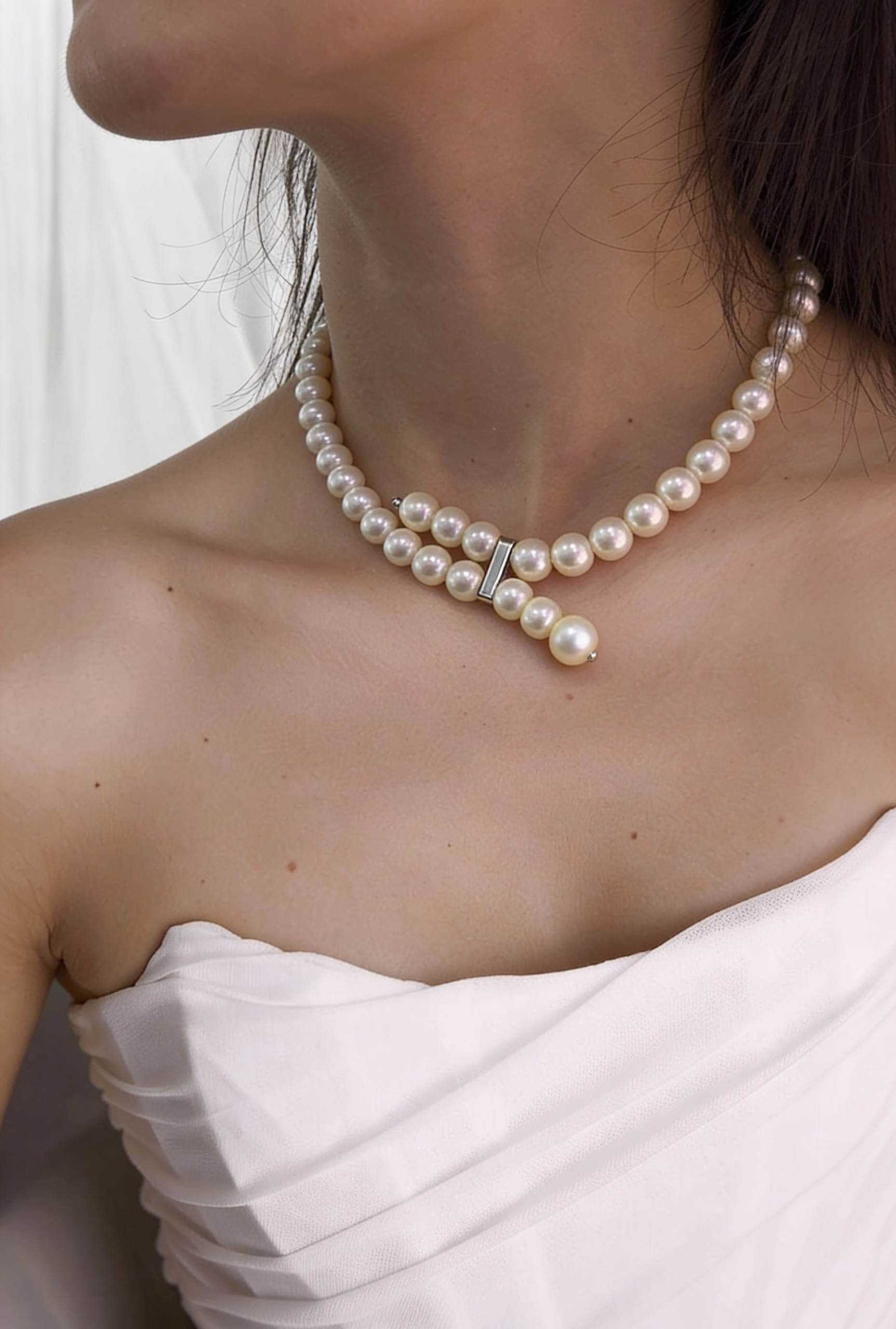 Эта подвеска — про чистоту формы и сдержанный акцент. Ровная линия классического жемчуга дополнена аккуратной геометричной деталью, которая мягко нарушает симметрию и делает образ современным. Ничего лишнего — только баланс, спокойствие и ощущение продуманной элегантности.