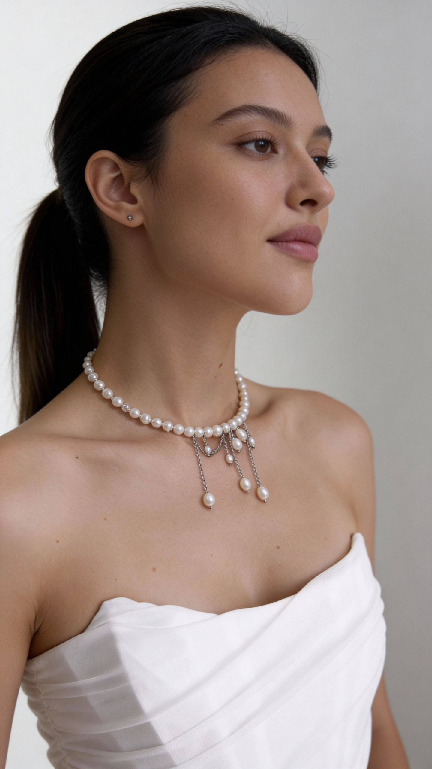 Эта подвеска про тонкий баланс между классикой и современностью. Ровный жемчужный ряд ложится по линии шеи, а ниспадающие цепочки с жемчужными каплями создают лёгкое движение и живой акцент.