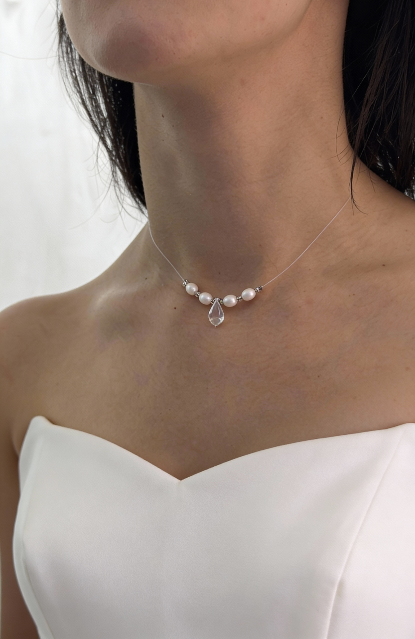 Это подвеска — про невесомость и тишину. Тонкая леска создаёт эффект украшения «в воздухе», а миниатюрные жемчужины и прозрачная капля мягко притягивают взгляд, не перетягивая внимание на себя.