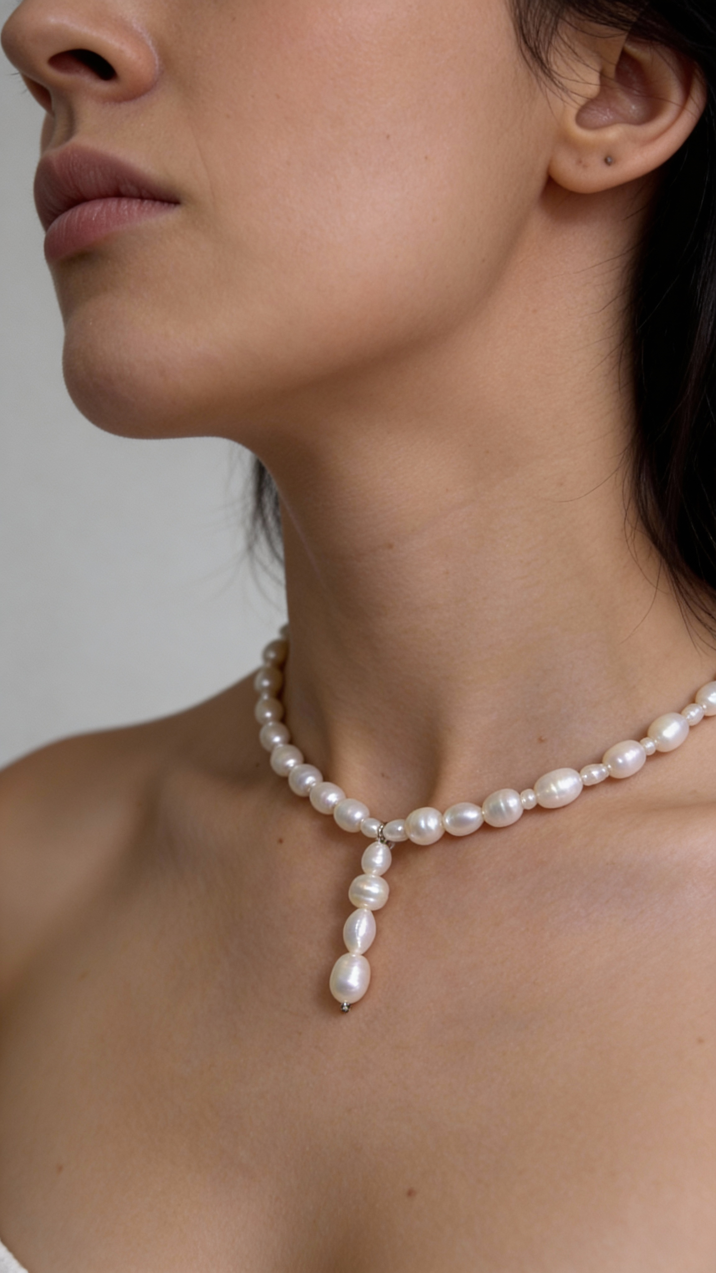 Воплощение сдержанной элегантности. Натуральный жемчуг разного размера выстраивается в мягкий ритм, а вытянутая капля деликатно подчёркивает линию шеи и ключиц. Украшение выглядит очень чисто и утончённо, создавая акцент без лишнего внимания к себе.
