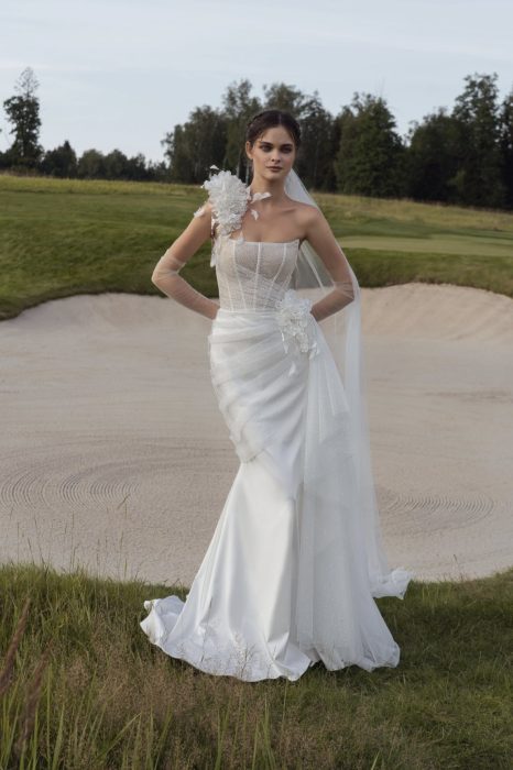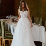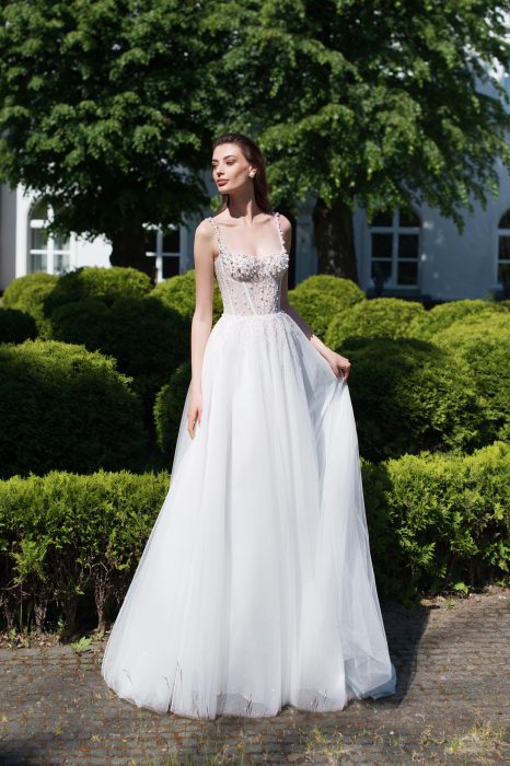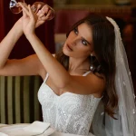 Платье создано для невест, мечтающих о нежности с сиянием. Корсет с тонкой вышивкой и мягкими линиями подчёркивает зону декольте, а многослойная фатиновая юбка с расшивкой струится при каждом движении. Идеально для классической свадьбы, церемонии у моря или зала с хрустальными люстрами. Образ, в котором легко почувствовать себя настоящей музой.