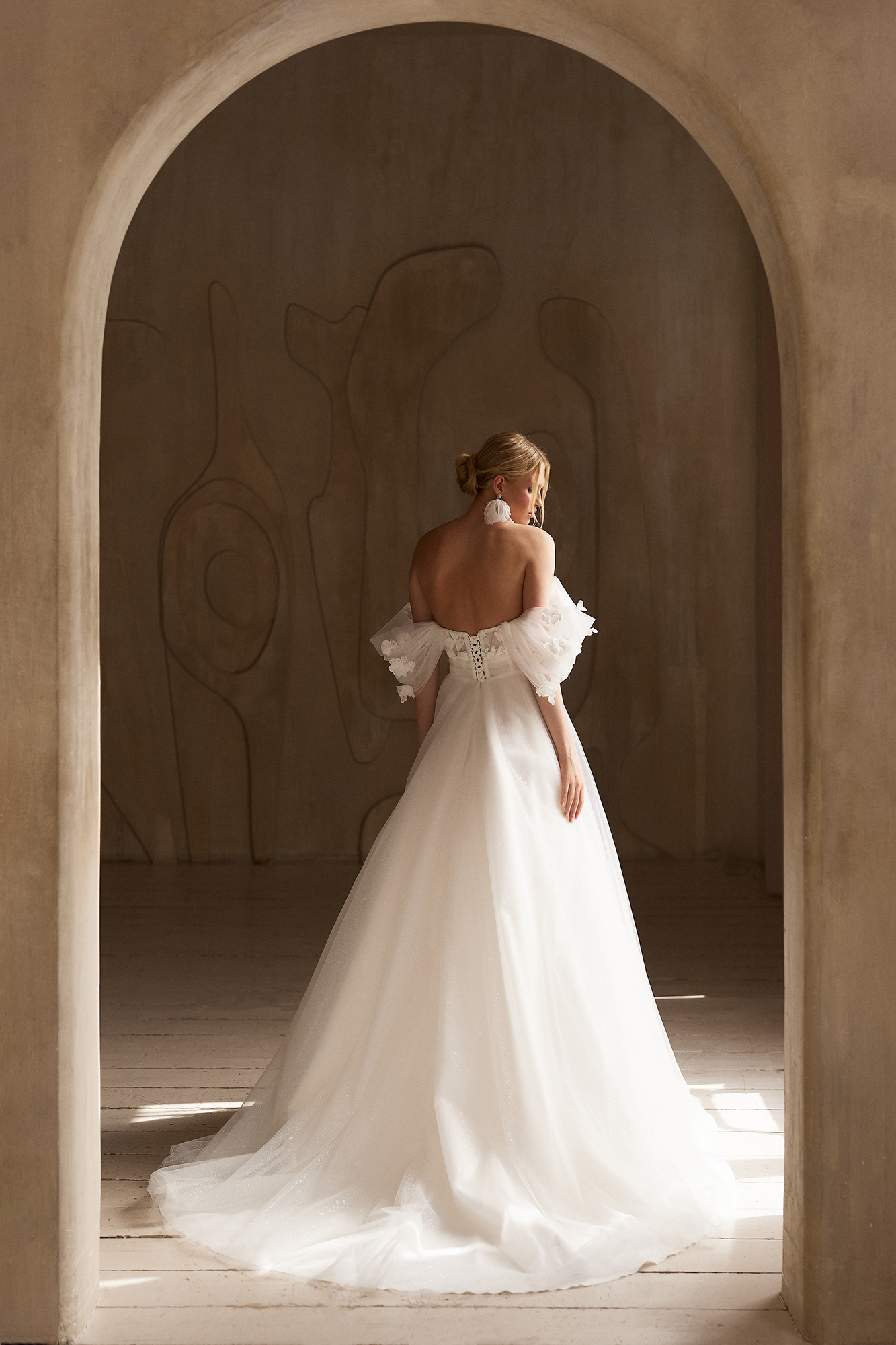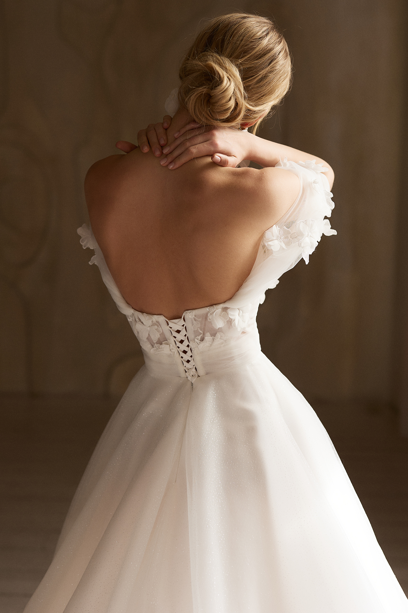 Платье Росио — это воплощение нежности и воздушности. Полупрозрачный корсет украшен объёмными цветами, которые словно парят на коже, создавая эффект утреннего сада. Лёгкие фатиновые рукава добавляют романтики, а мягкая юбка струится при каждом движении. Идеальный выбор для невесты, которая хочет быть нежной, но уверенной.